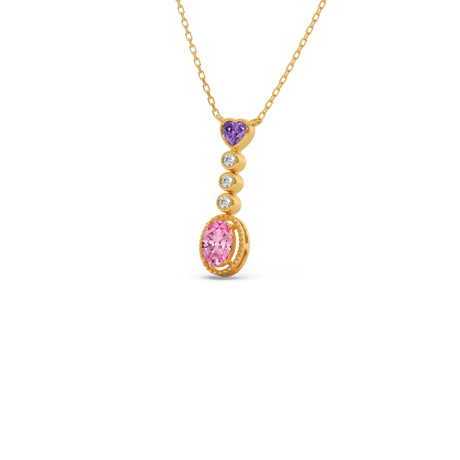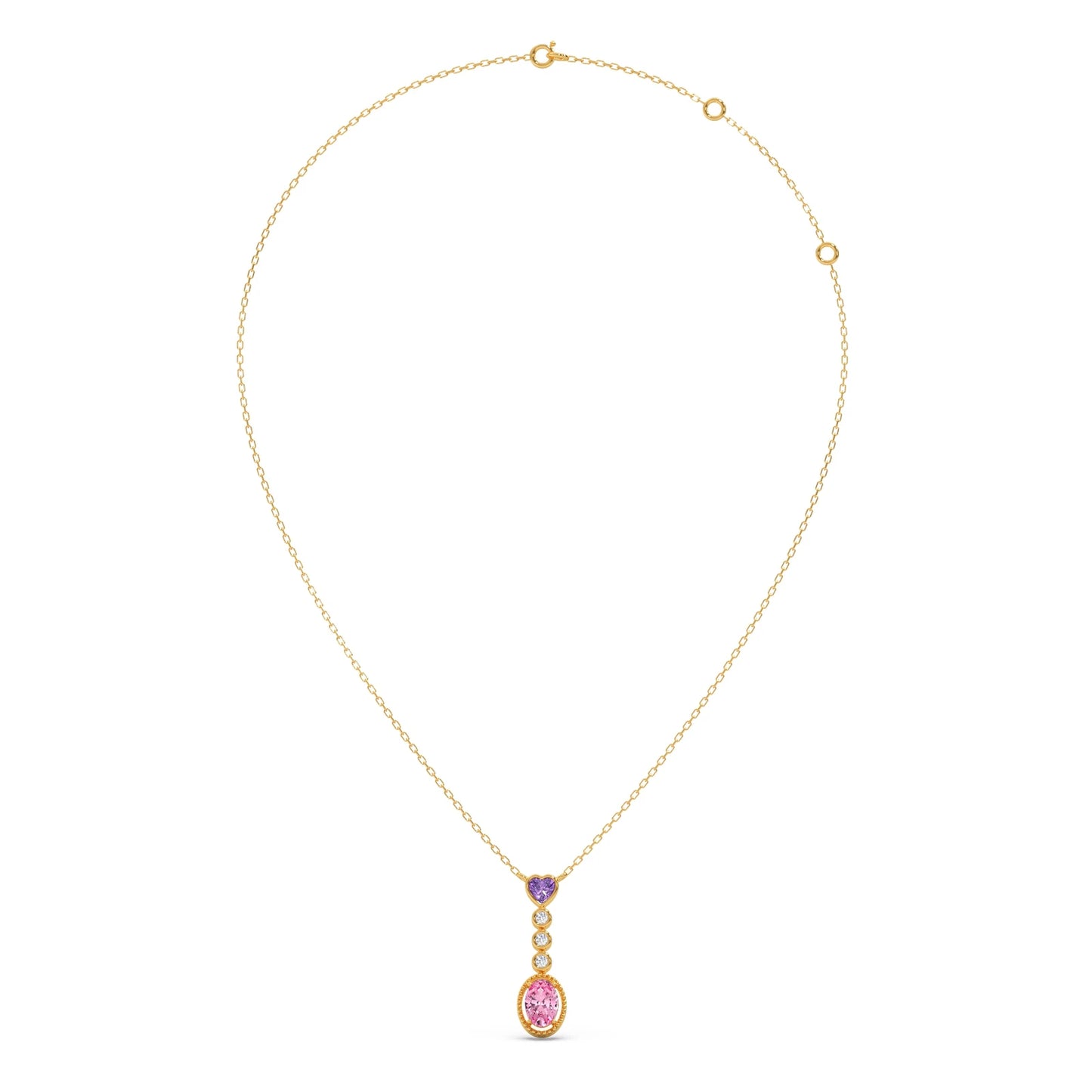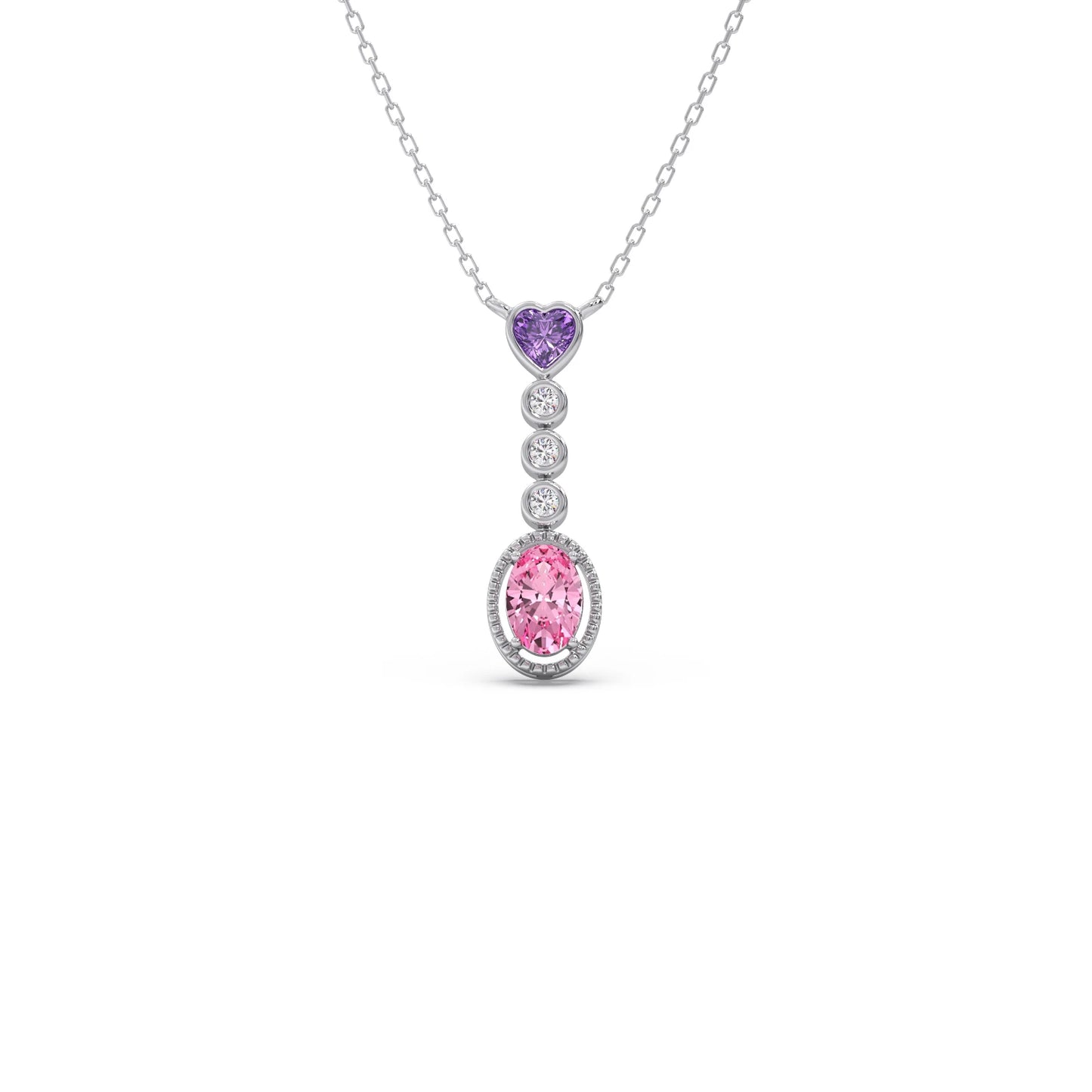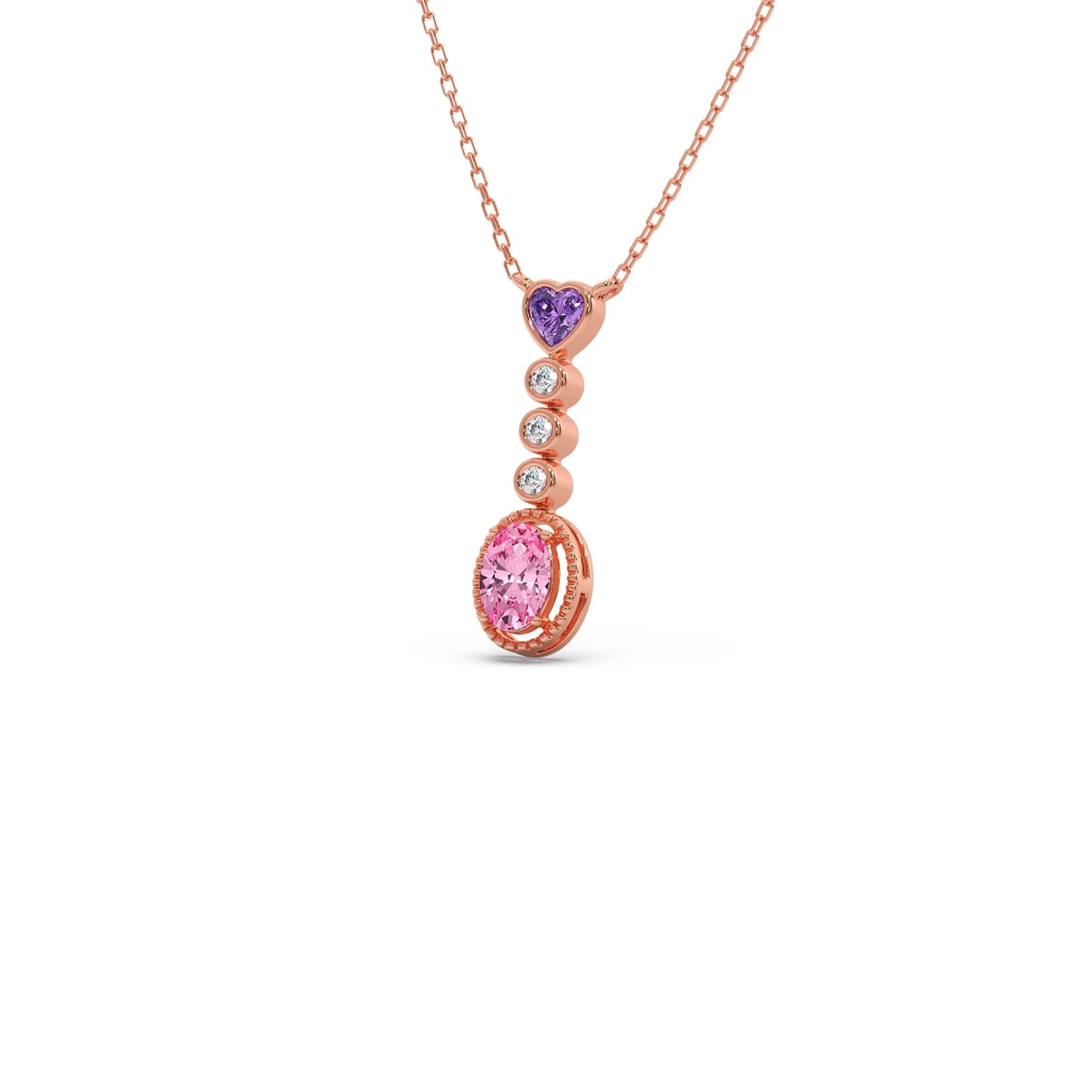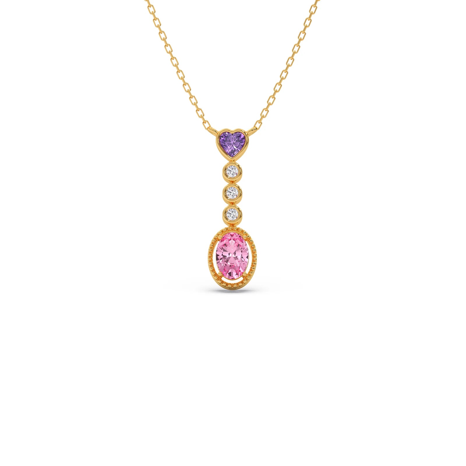 This romantic drop pendant gracefully combines a luminous oval-cut gemstone with a charming heart-cut gemstone. Dazzling round diamonds accent the design, enhancing their sparkle and adding brilliant movement. This captivating piece offers a unique blend of elegance and sentiment, perfect for celebrating cherished moments.