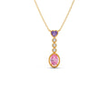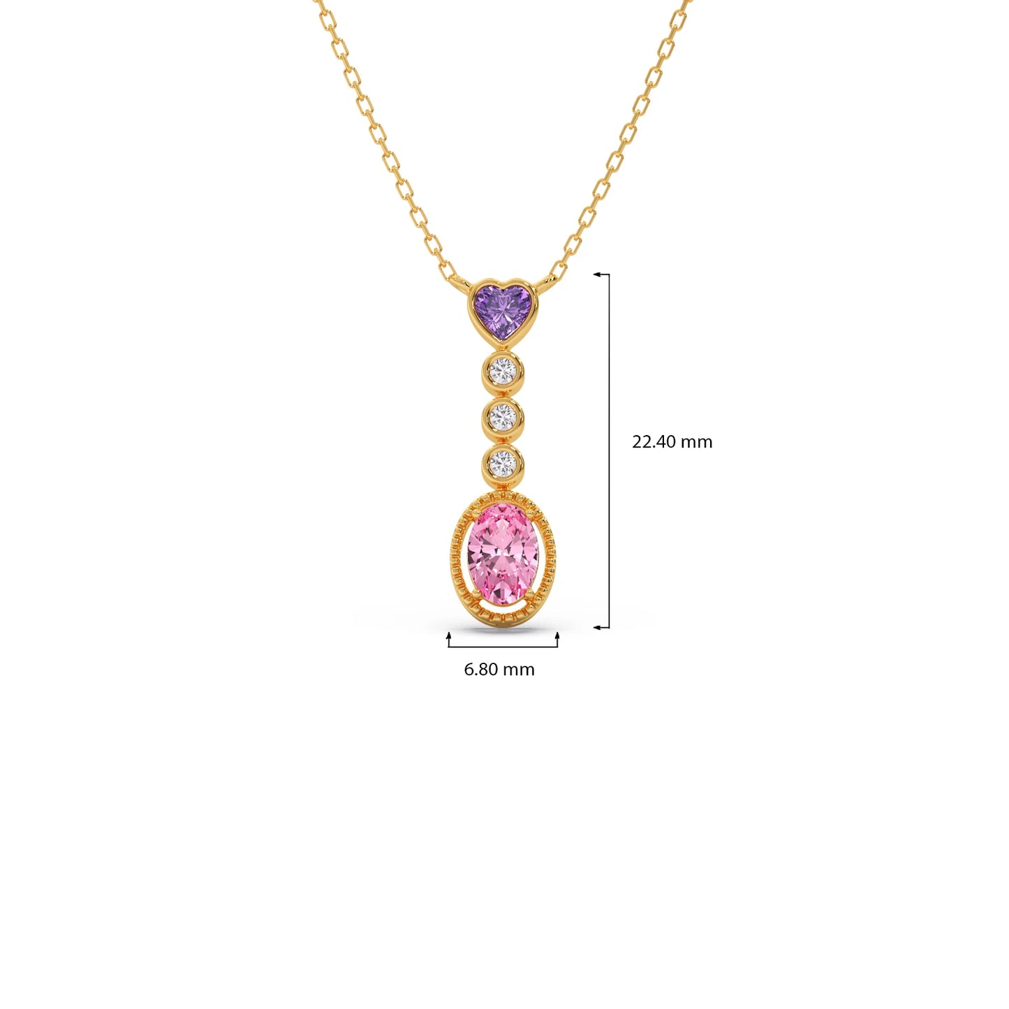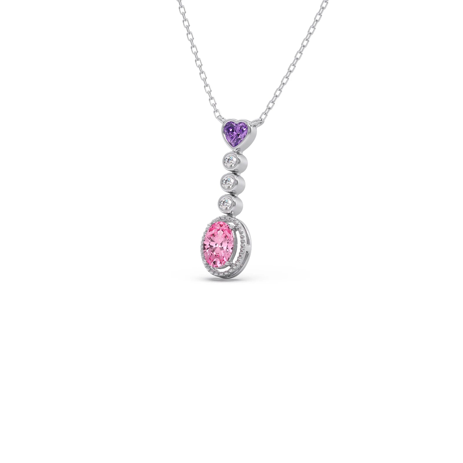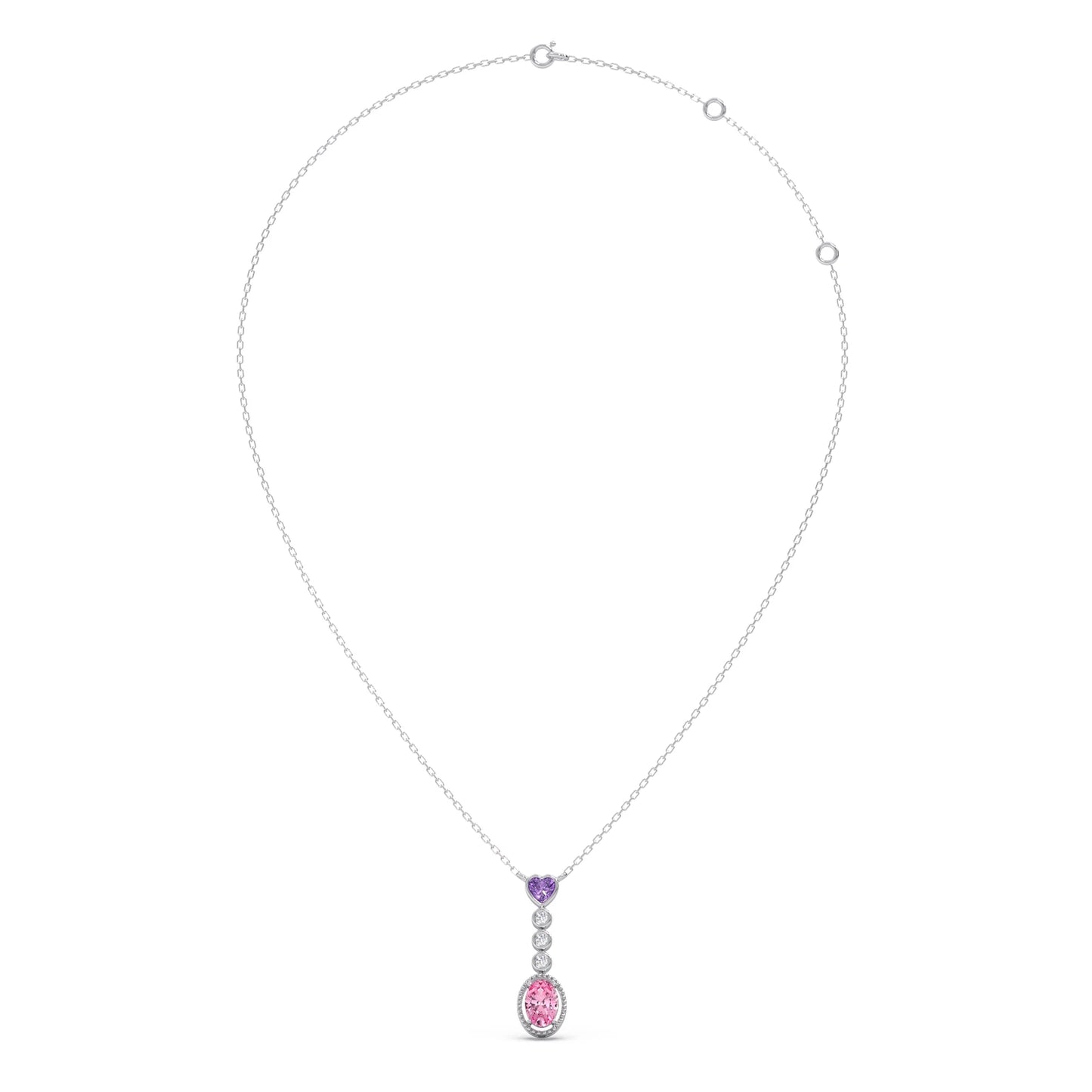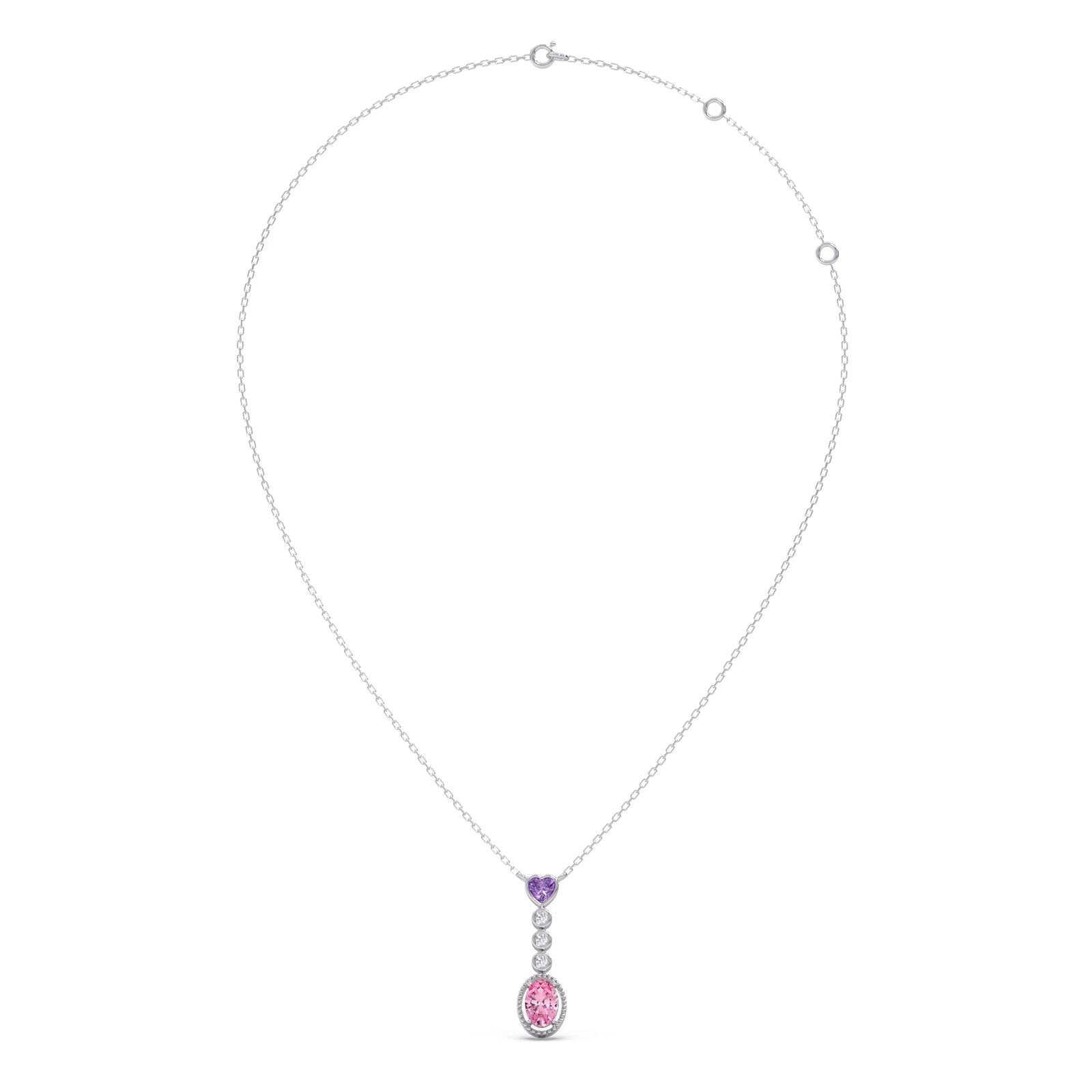This romantic drop pendant gracefully combines a luminous oval-cut gemstone with a charming heart-cut gemstone. Dazzling round diamonds accent the design, enhancing their sparkle and adding brilliant movement. This captivating piece offers a unique blend of elegance and sentiment, perfect for celebrating cherished moments.