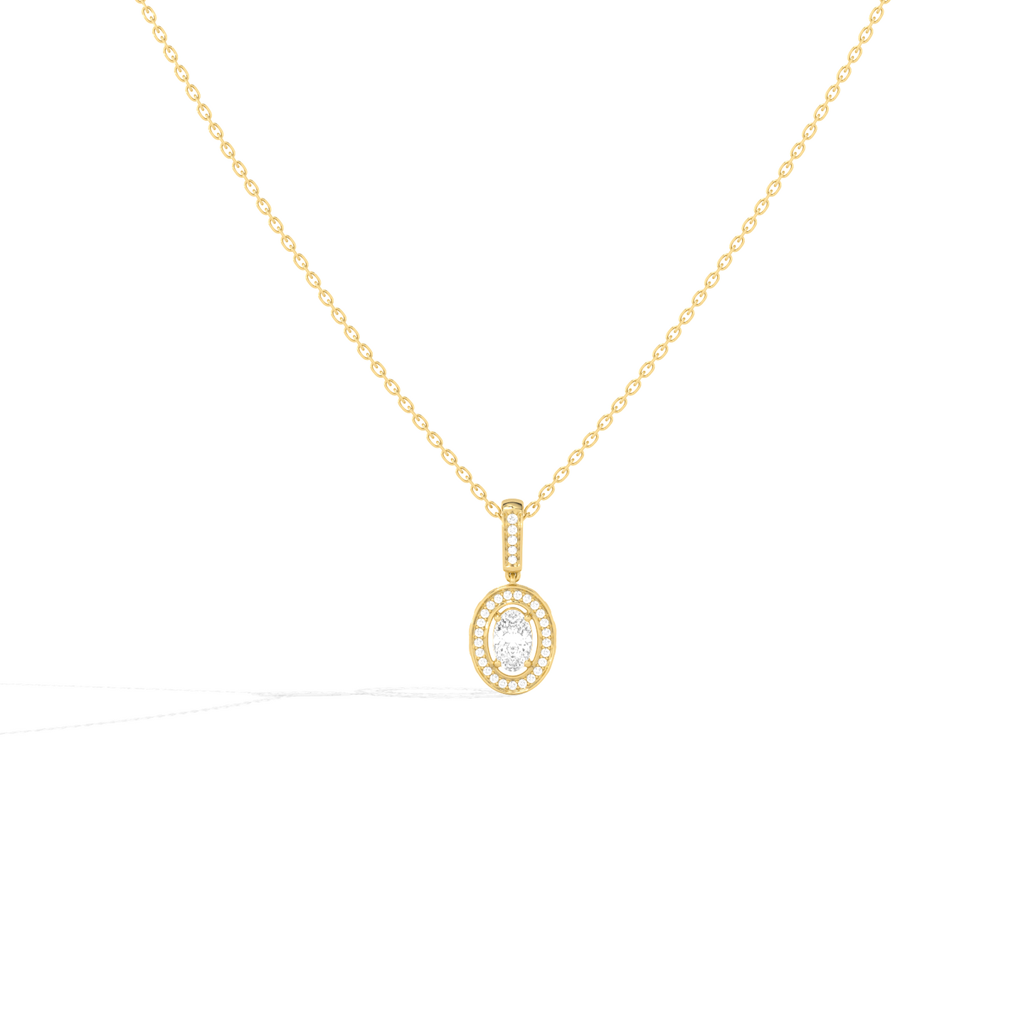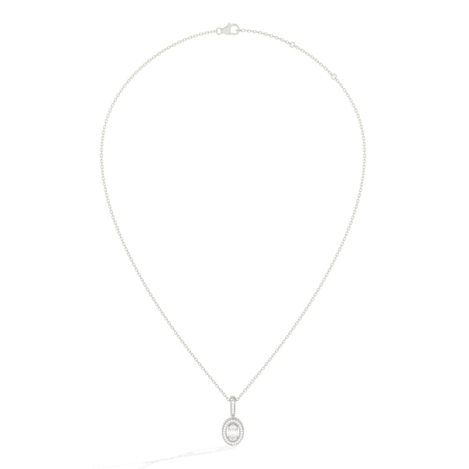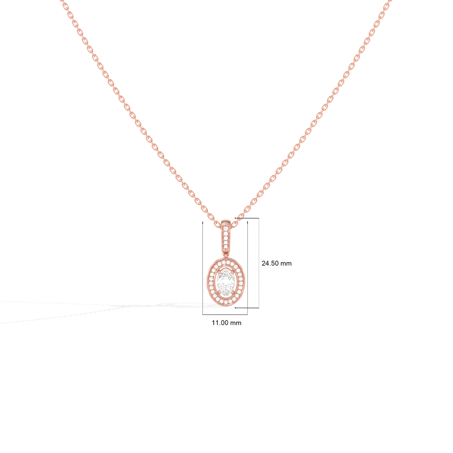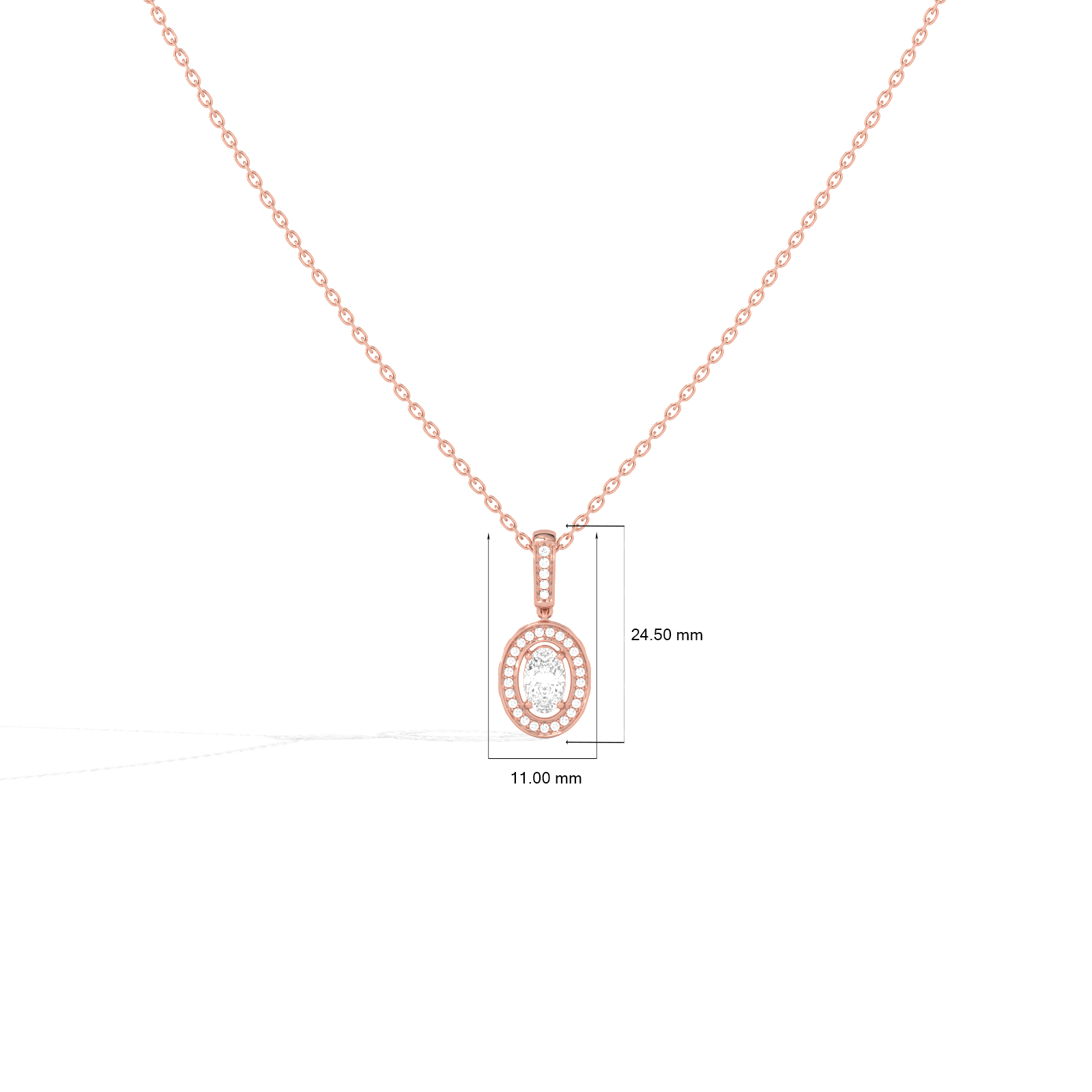 This pendant features a central oval solitaire diamond, surrounded by a sparkling round halo of smaller diamonds. The halo enhances the oval stone's brilliance, creating a captivating focal point. The pendant offers a classic yet modern design, perfect for adding a touch of elegance to any look.