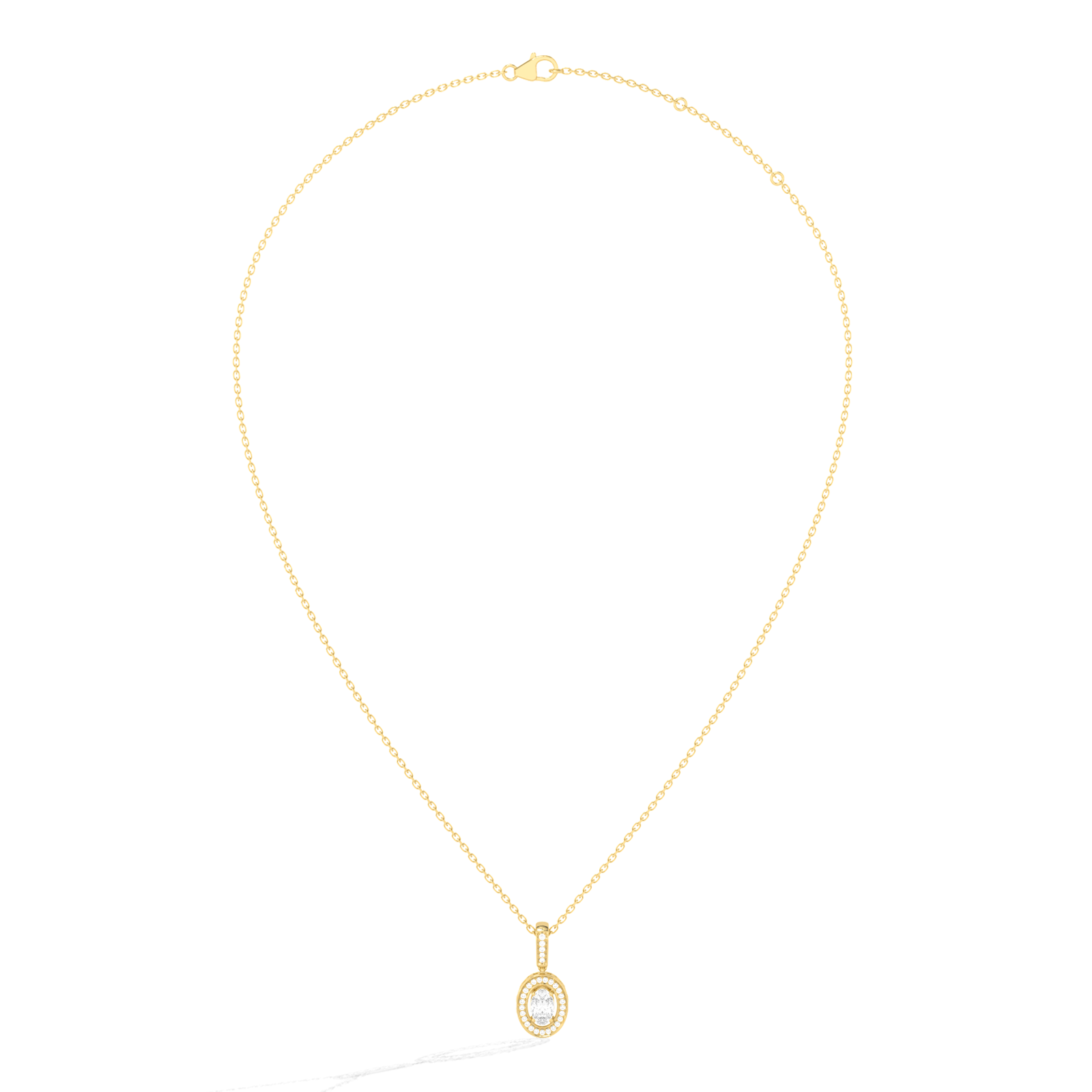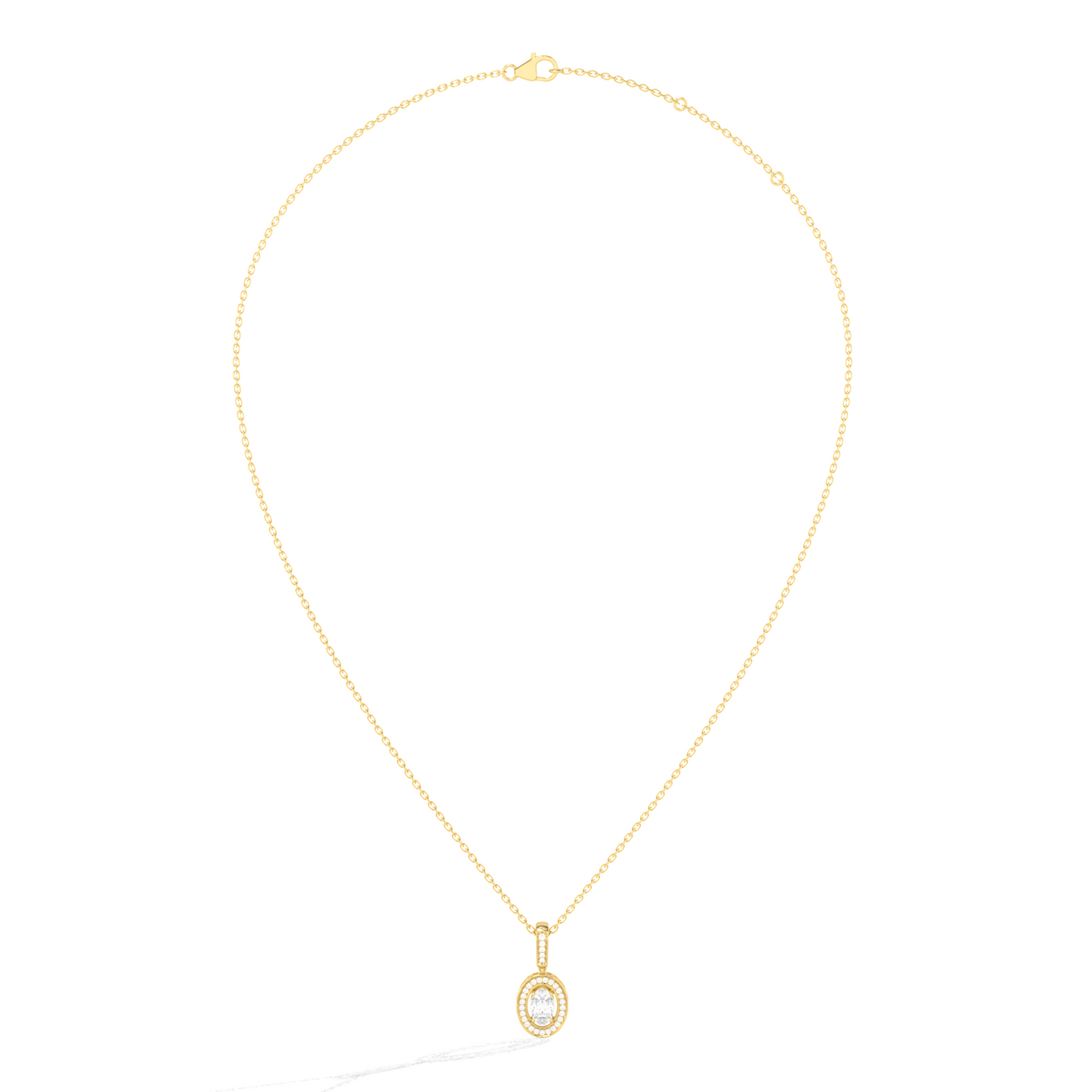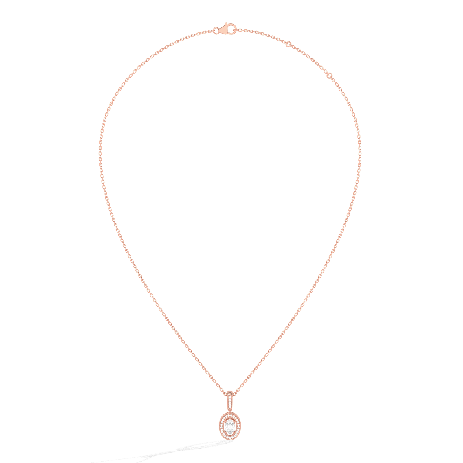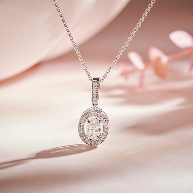 This pendant features a central oval solitaire diamond, surrounded by a sparkling round halo of smaller diamonds. The halo enhances the oval stone's brilliance, creating a captivating focal point. The pendant offers a classic yet modern design, perfect for adding a touch of elegance to any look.