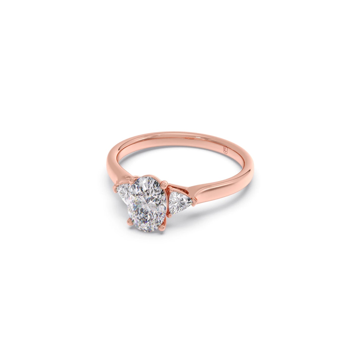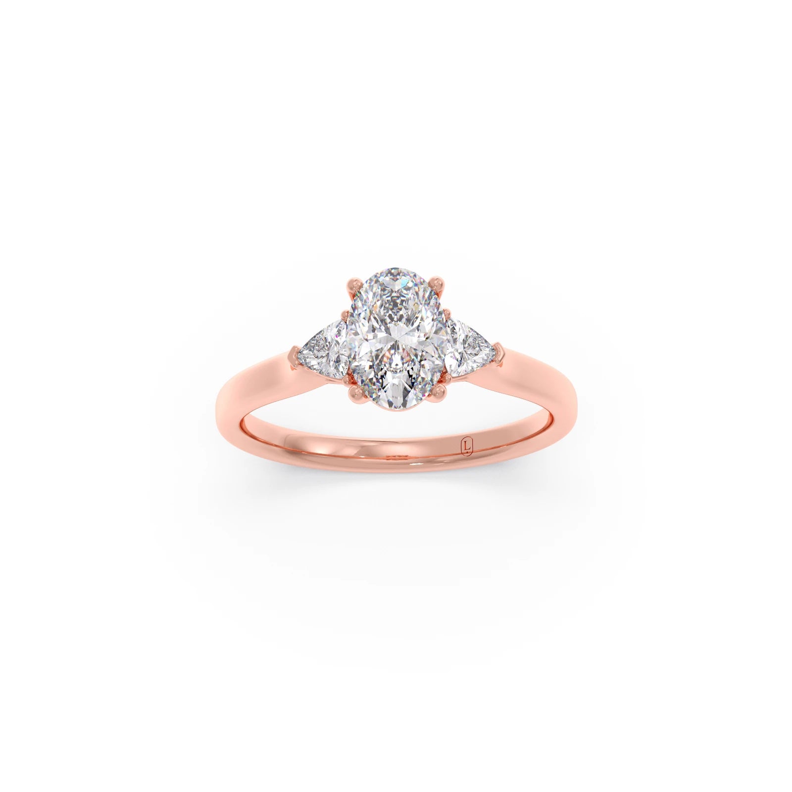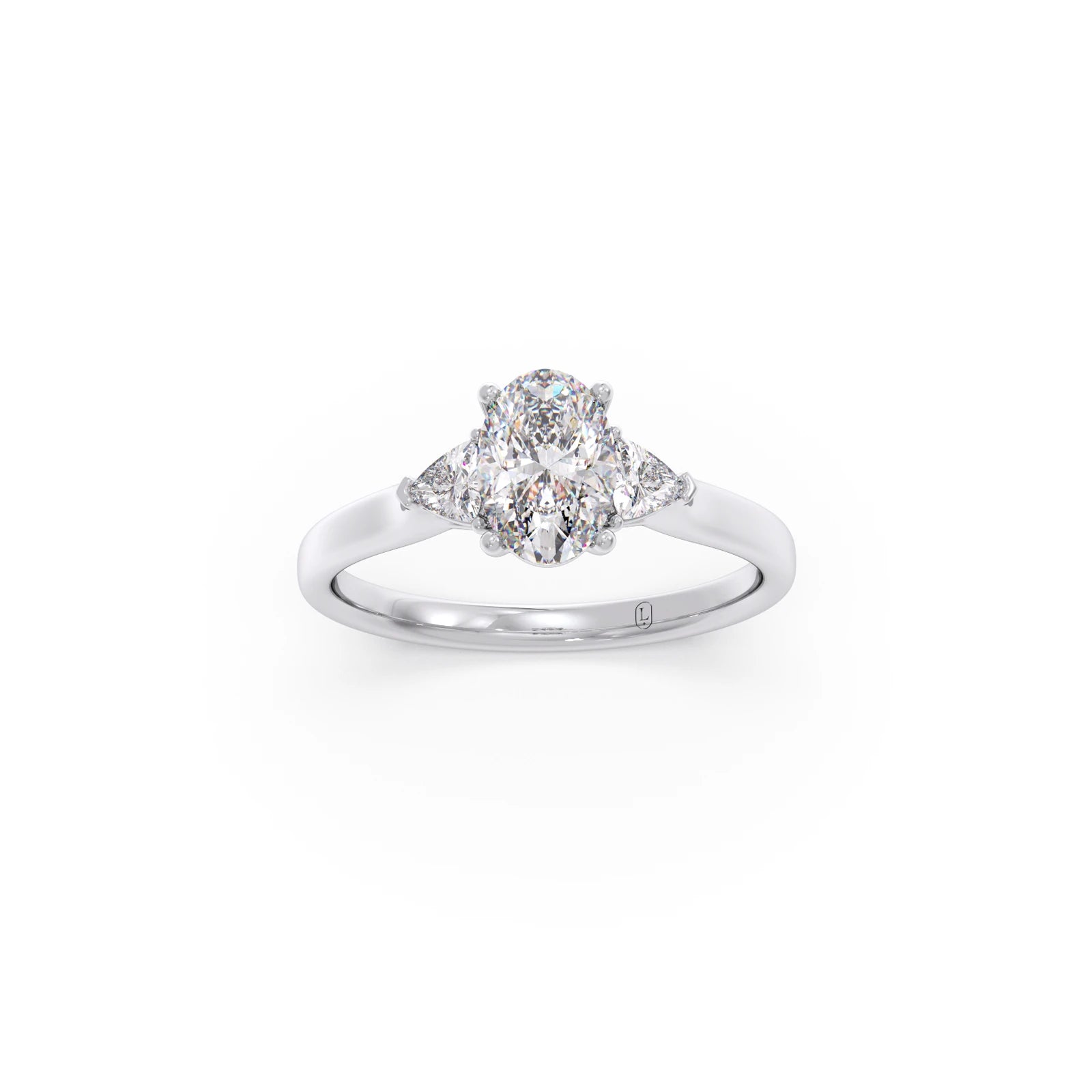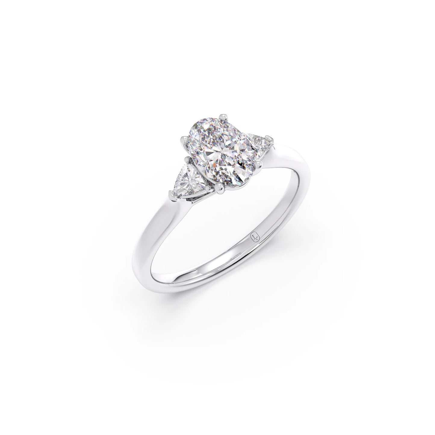 This elegant ring showcases a brilliant oval-cut diamond as its captivating centerpiece, set in a classic solitaire style. Flanking the oval are two striking trillion-cut diamonds, adding a modern geometric flair and enhancing the center stone's sparkle. The combination of the soft oval and the sharp angles of the trillions creates a balanced and sophisticated design, perfect for a timeless expression of love.