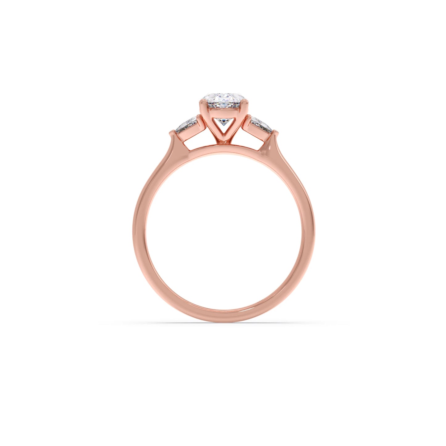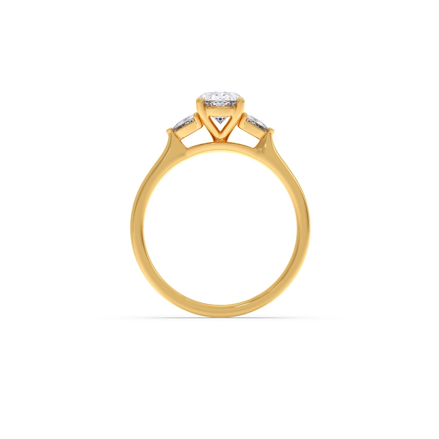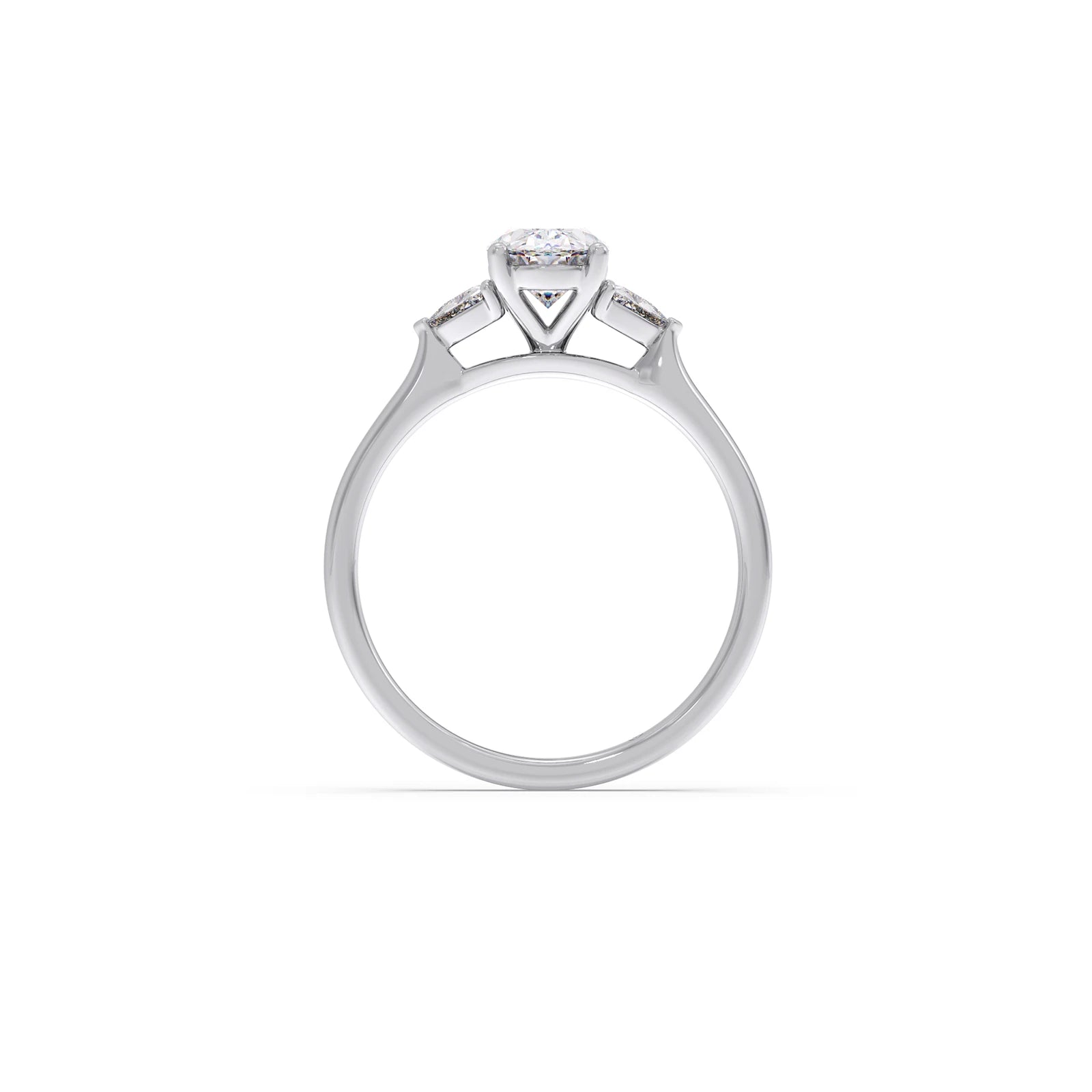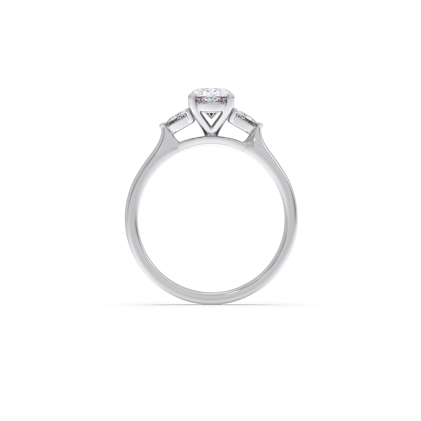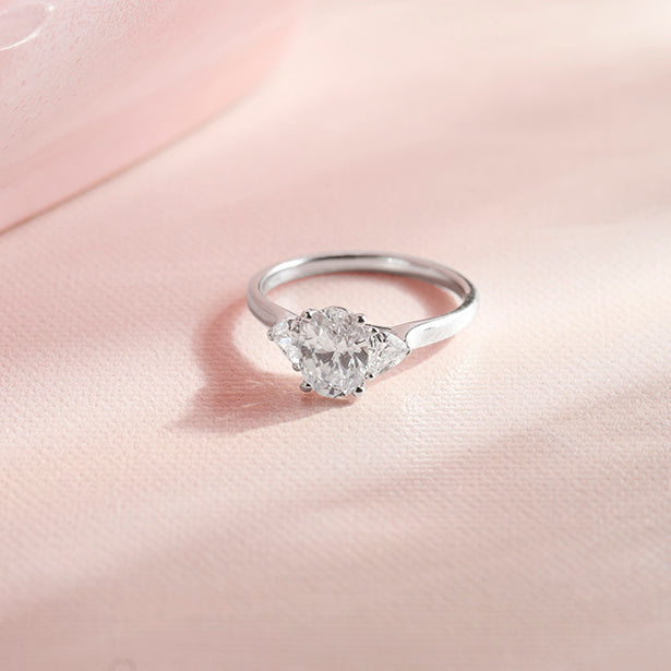 This elegant ring showcases a brilliant oval-cut diamond as its captivating centerpiece, set in a classic solitaire style. Flanking the oval are two striking trillion-cut diamonds, adding a modern geometric flair and enhancing the center stone's sparkle. The combination of the soft oval and the sharp angles of the trillions creates a balanced and sophisticated design, perfect for a timeless expression of love.