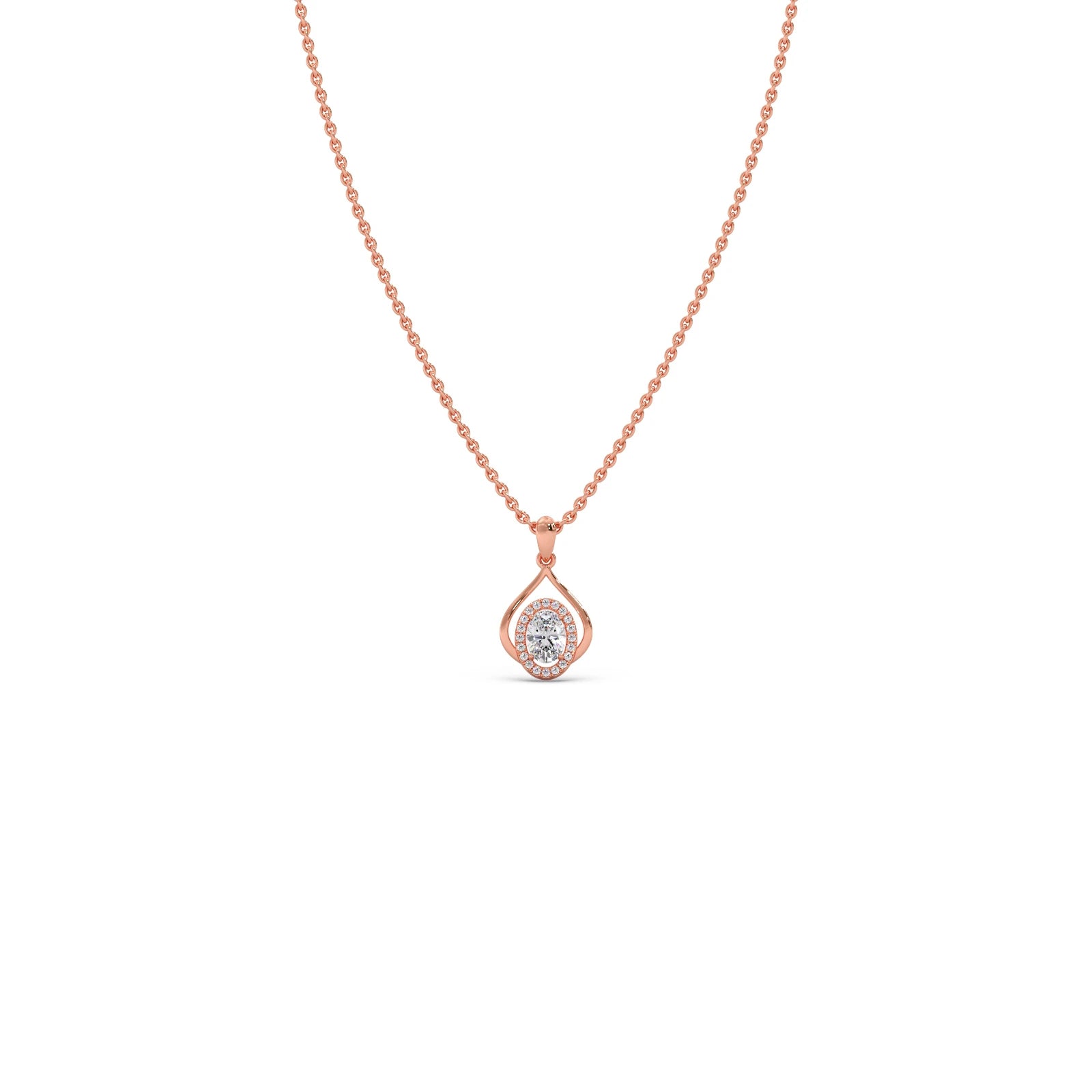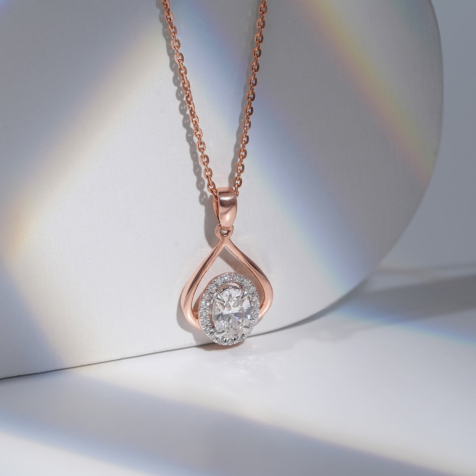 This pendant features an oval solitaire diamond, framed by a delicate halo of smaller round stones. The setting forms a stylized teardrop shape, adding a unique, elegant touch. The design balances classic solitaire brilliance with a modern, feminine silhouette, creating a captivating piece.