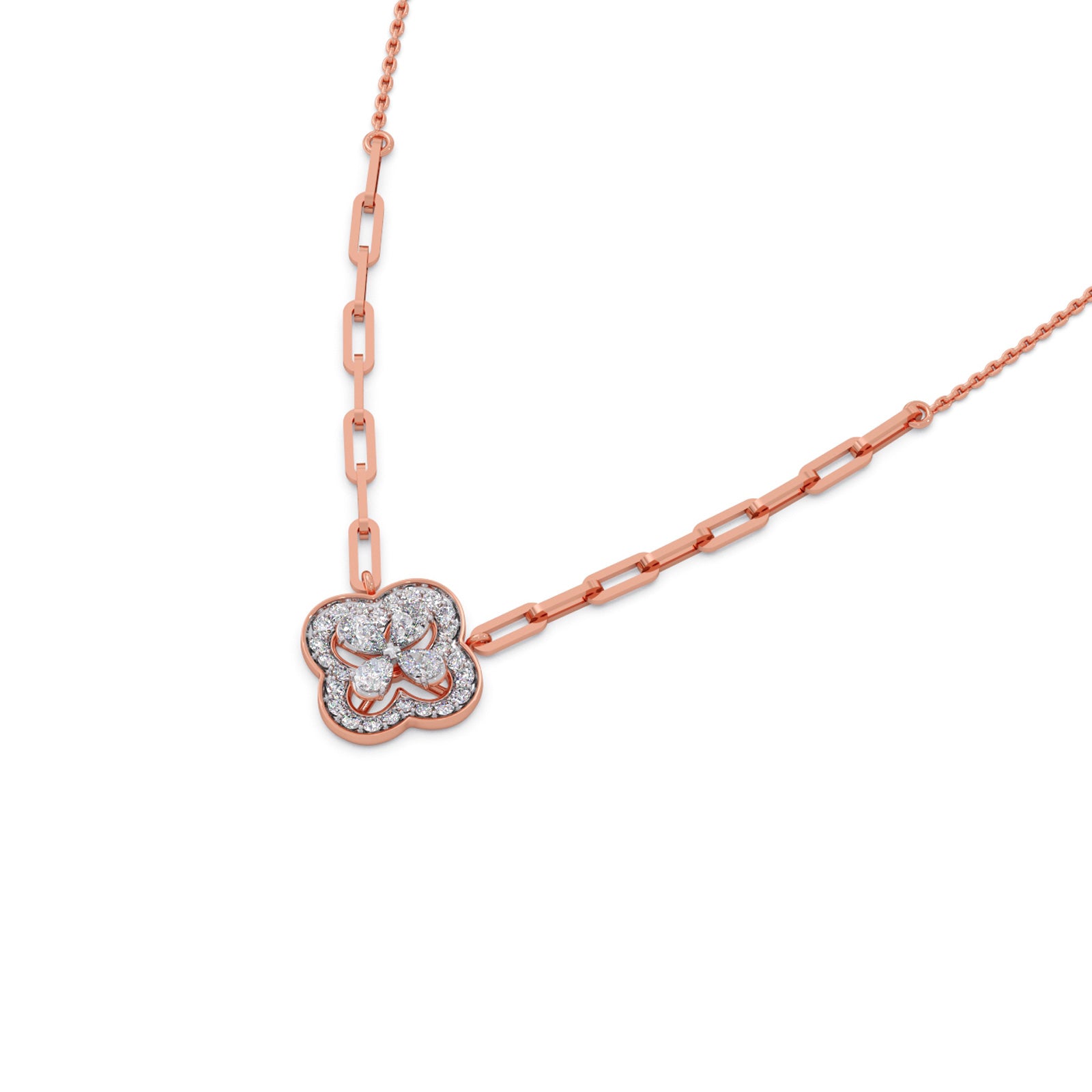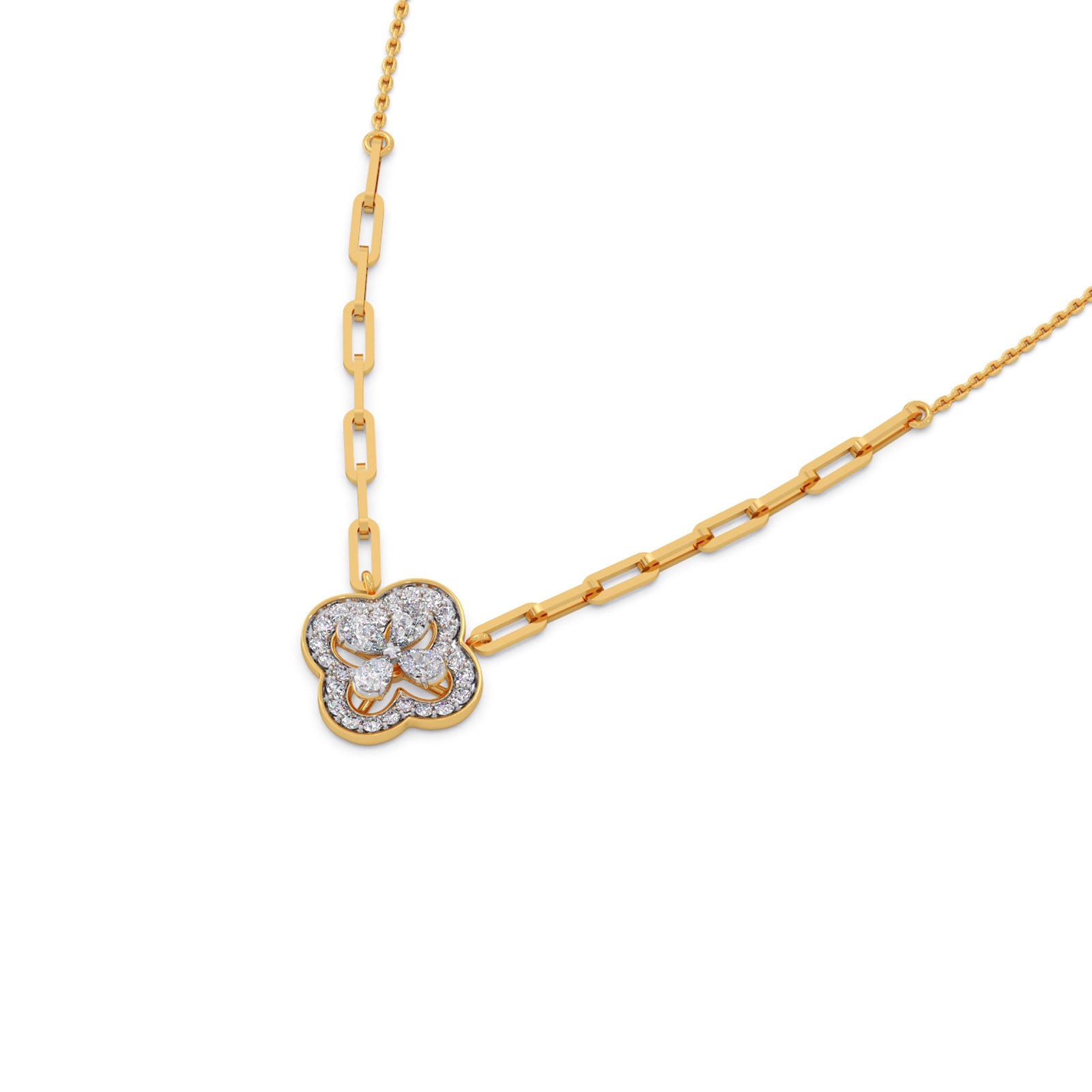 This necklace features a four-petal clover design, cluster set of 0.400ct Pear-Cut Diamonds. The clover is embellished with Classic Halo Round Diamonds,the piece utilizes a unique paperclip gold chain style, as it approaches the pendant. This necklace is designed to be a versatile modern classic that transitions easily between different styles.
