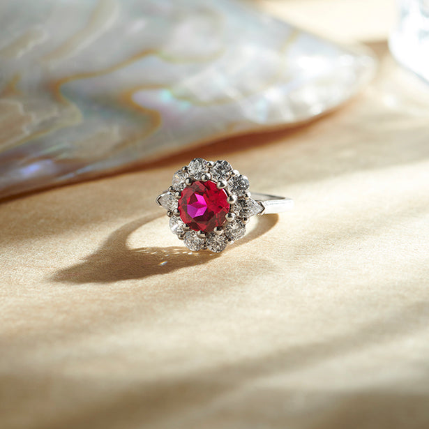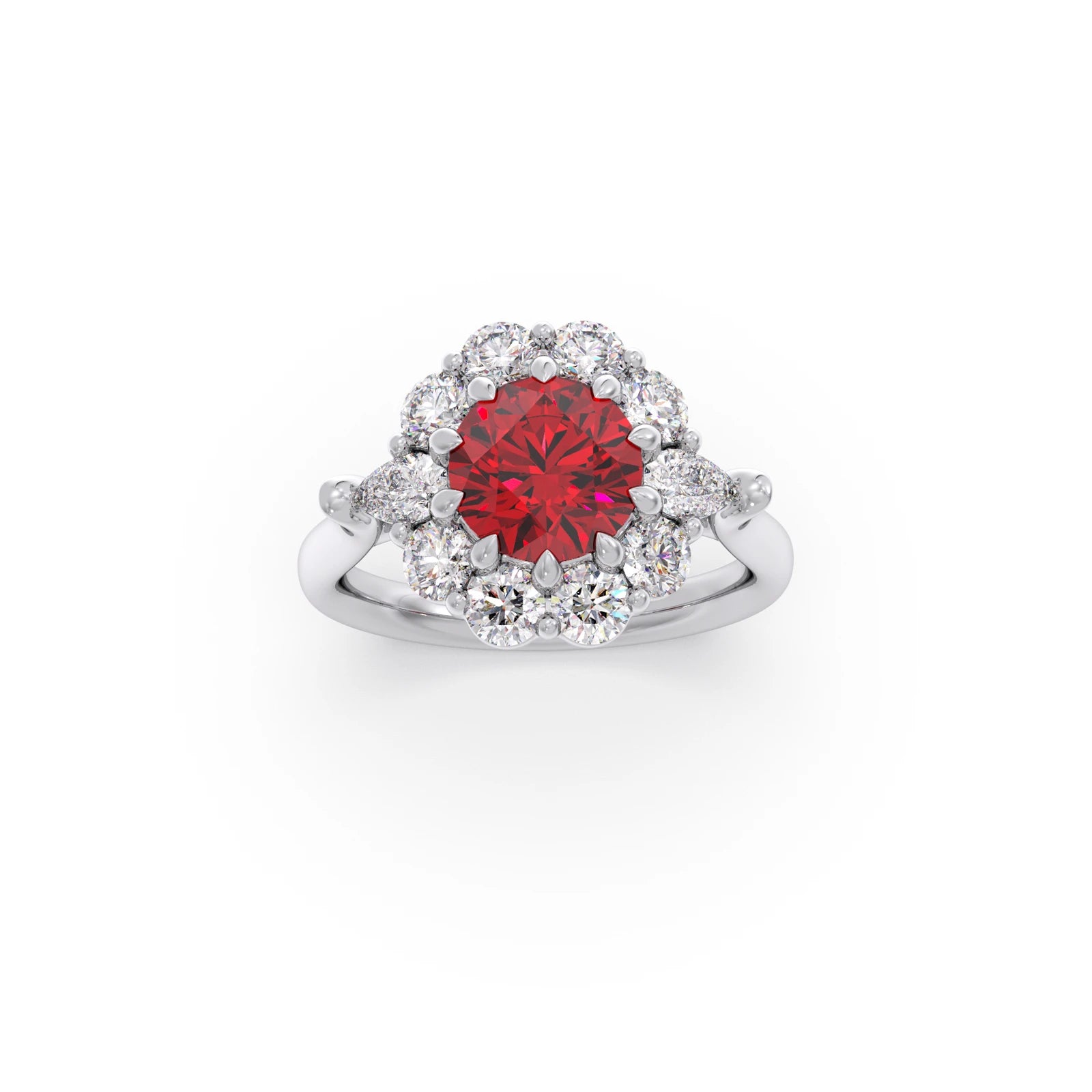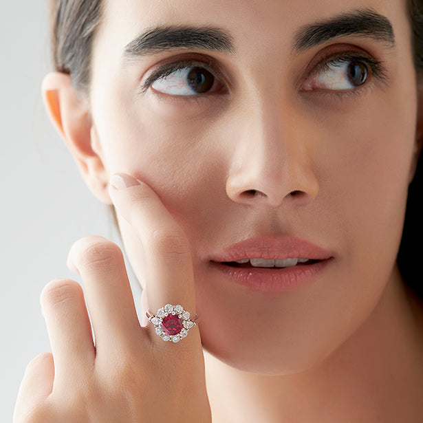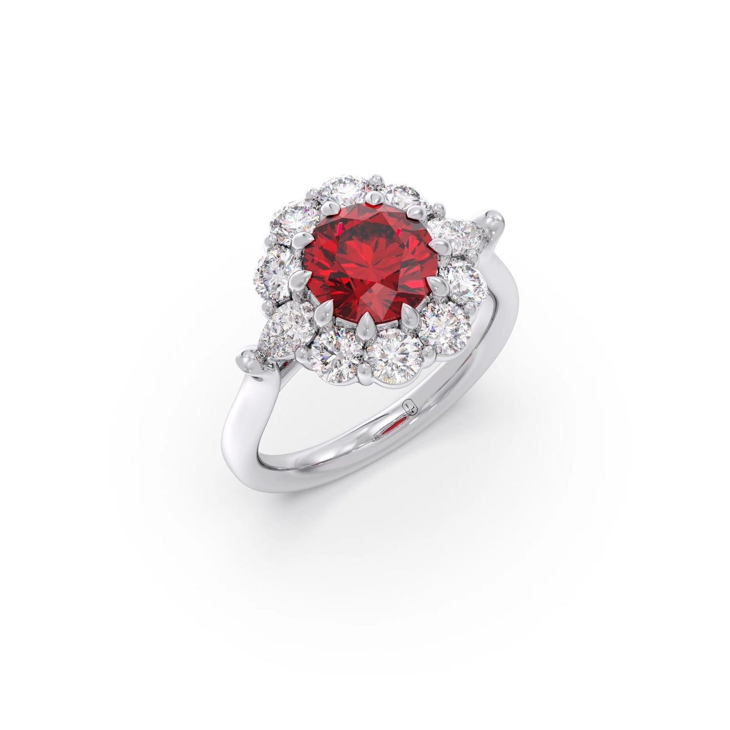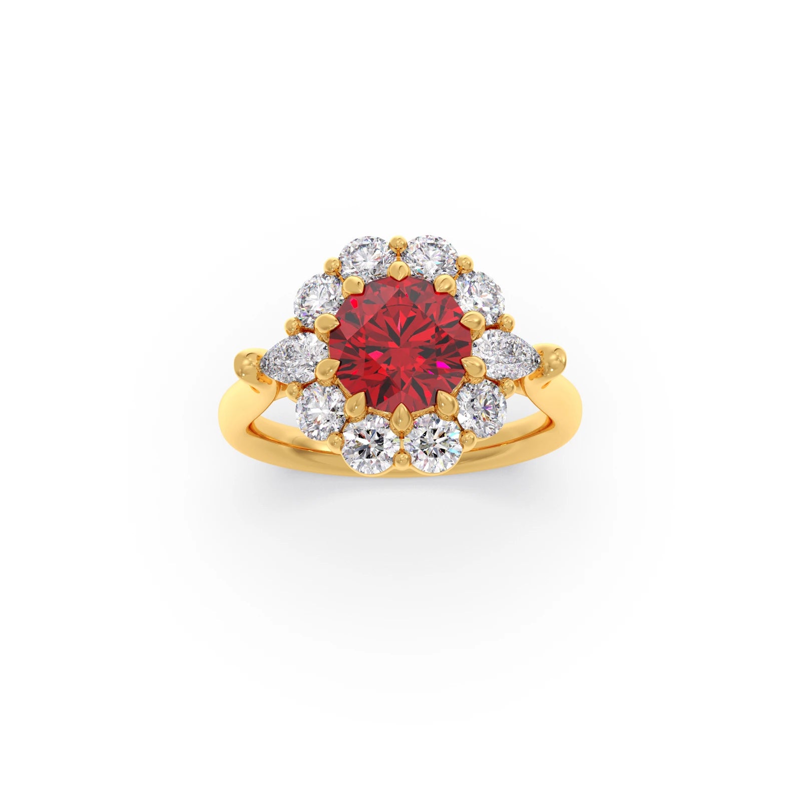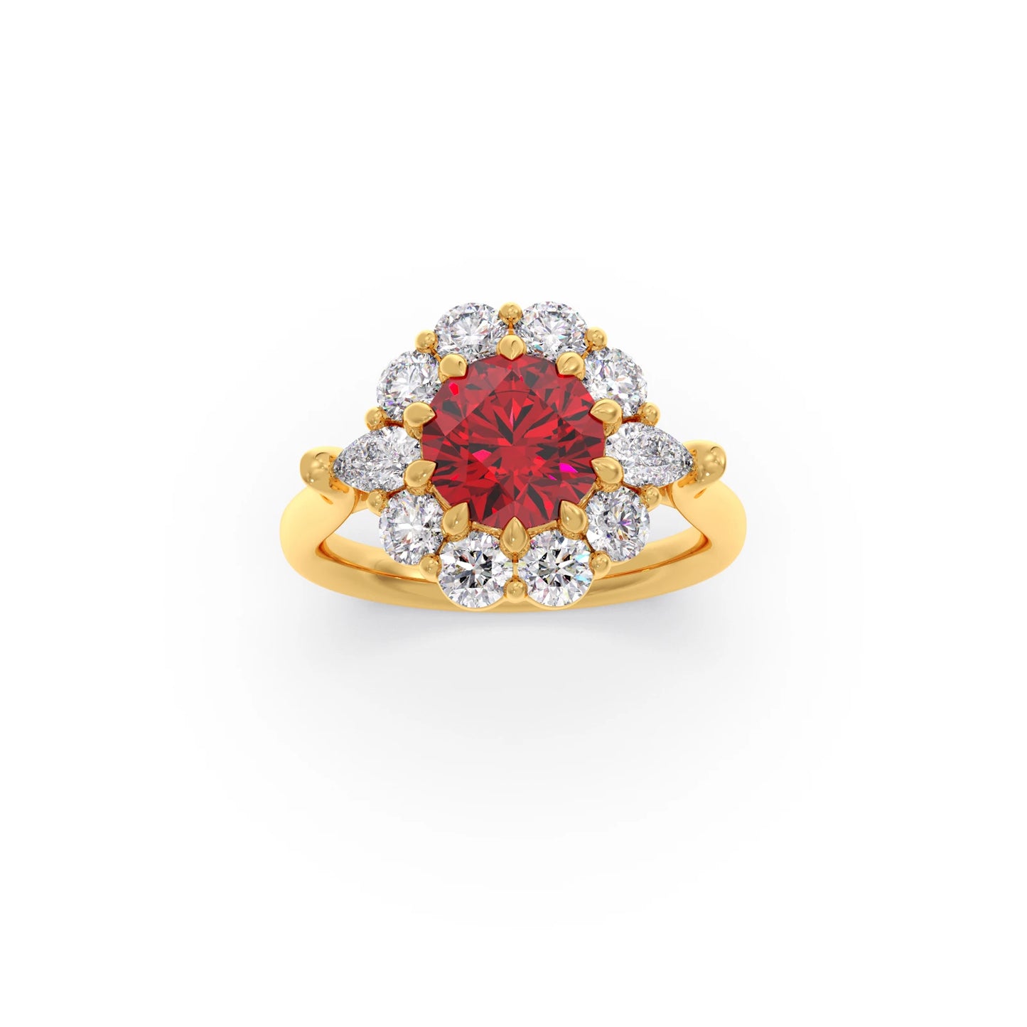 The Pear and Round Diamond Halo Ring with Centre Gemstone features a vibrant centre stone, elegantly framed by a halo of pear and round diamonds. This unique design blends classic sparkle with a bold focal point, creating a striking and sophisticated ring perfect for making a statement.