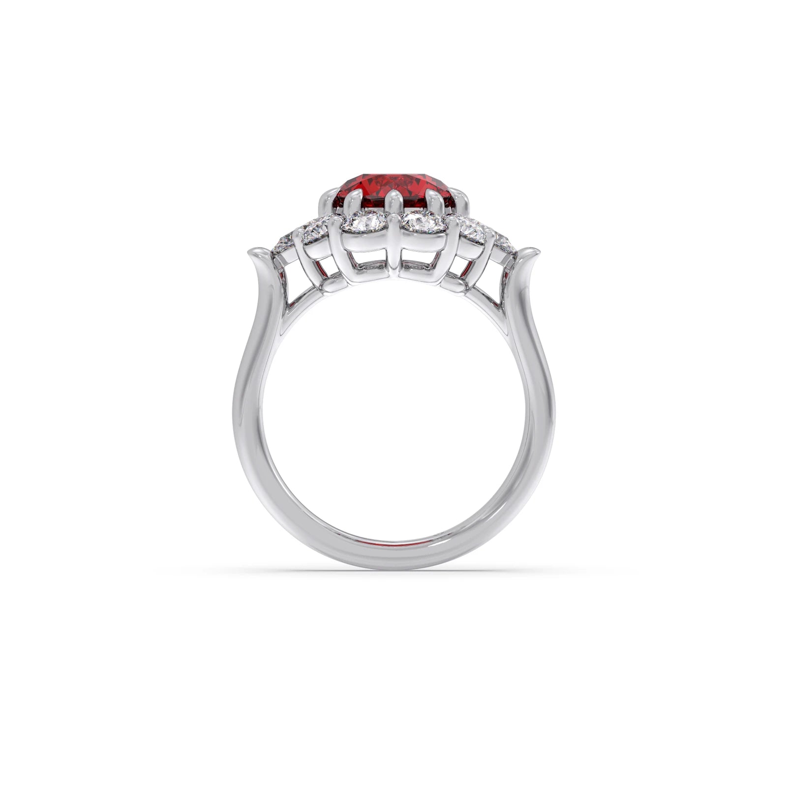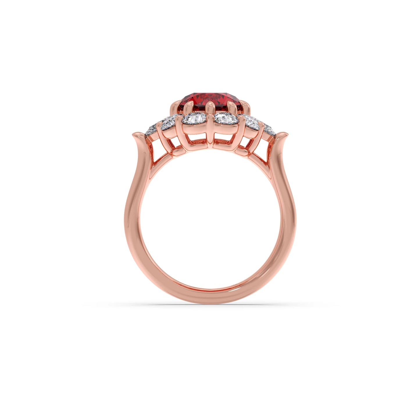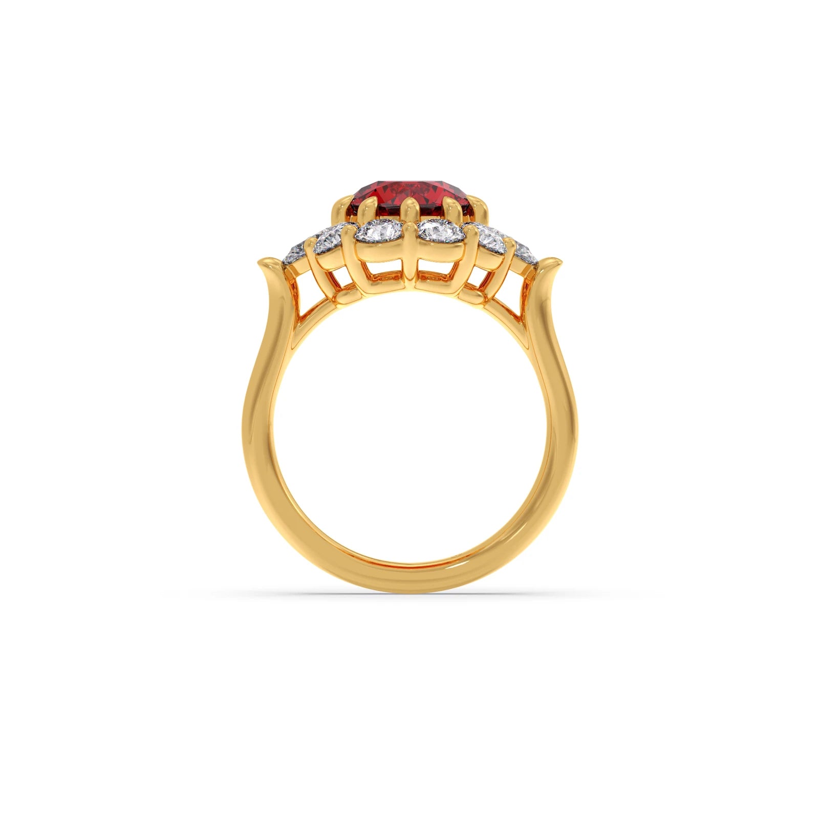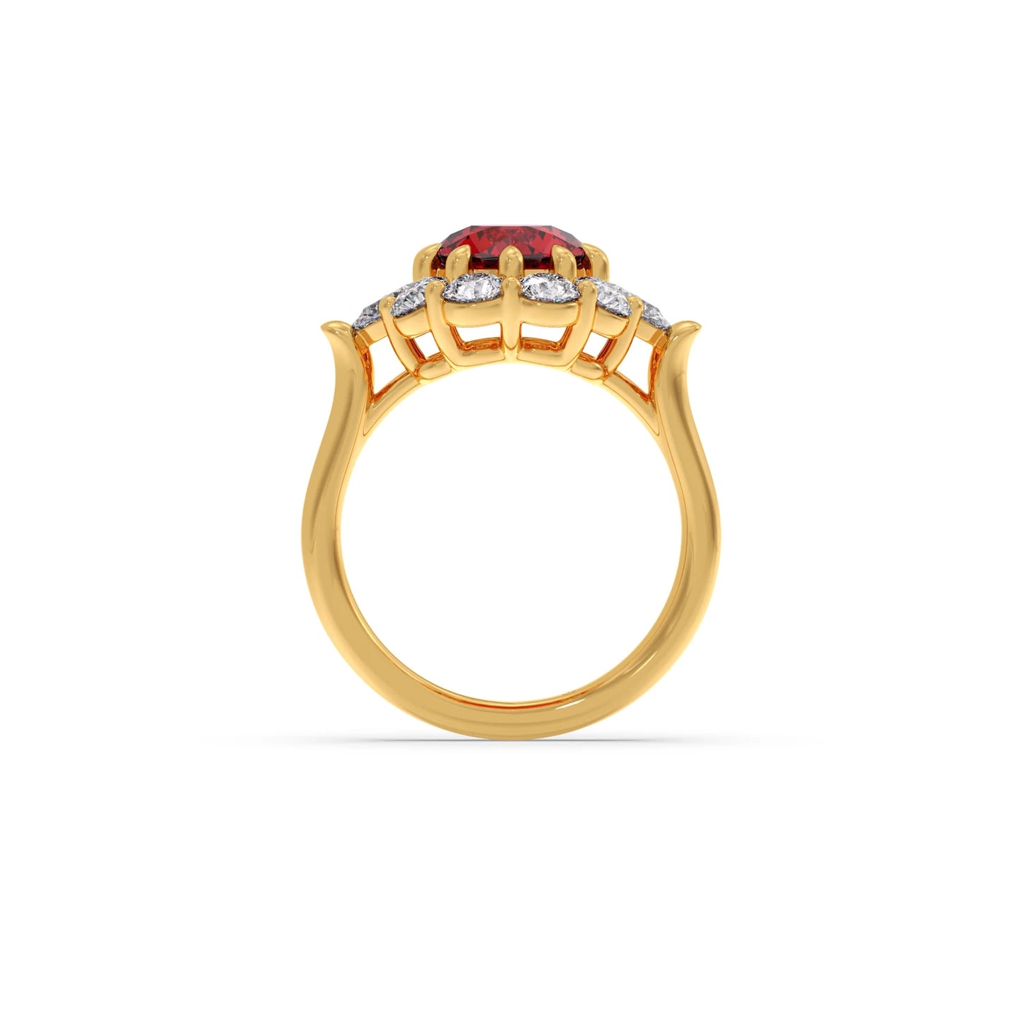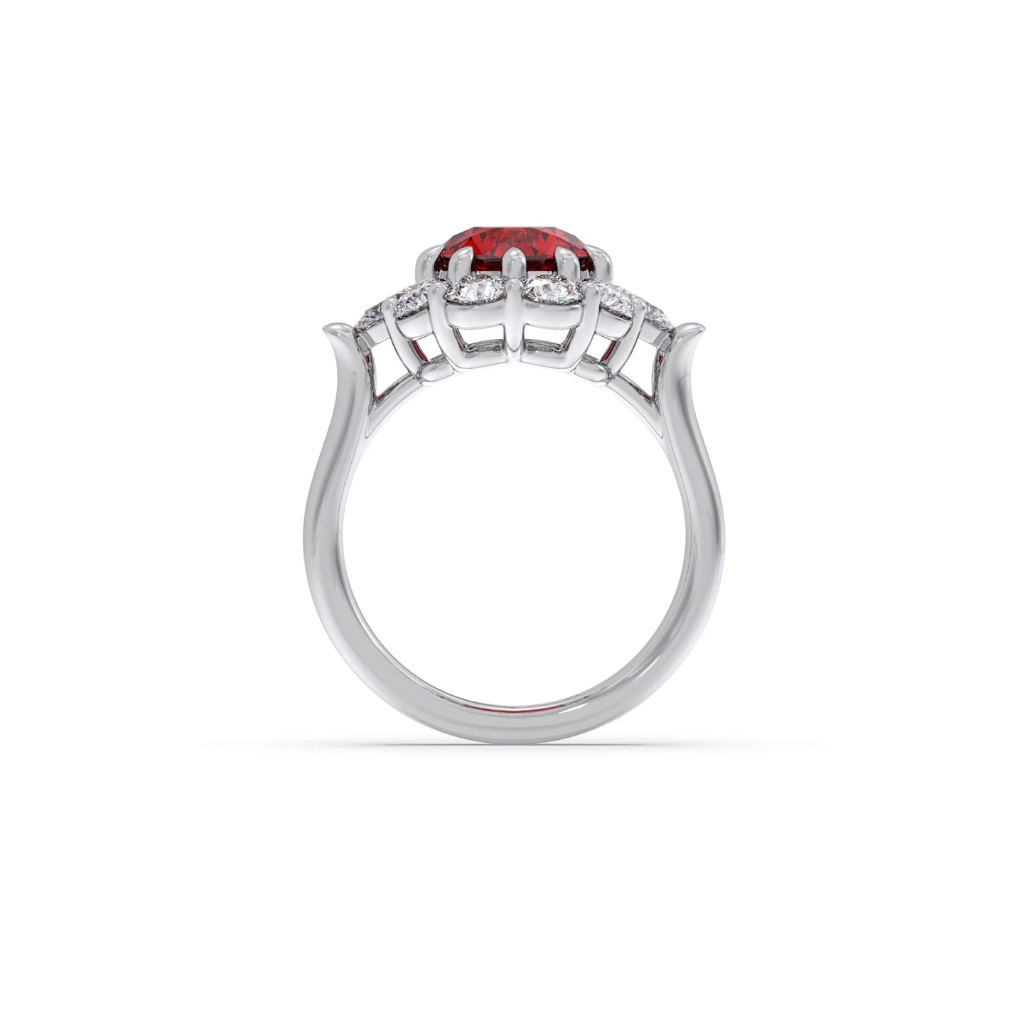 The Pear and Round Diamond Halo Ring with Centre Gemstone features a vibrant centre stone, elegantly framed by a halo of pear and round diamonds. This unique design blends classic sparkle with a bold focal point, creating a striking and sophisticated ring perfect for making a statement.