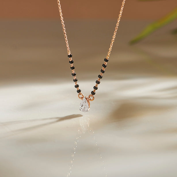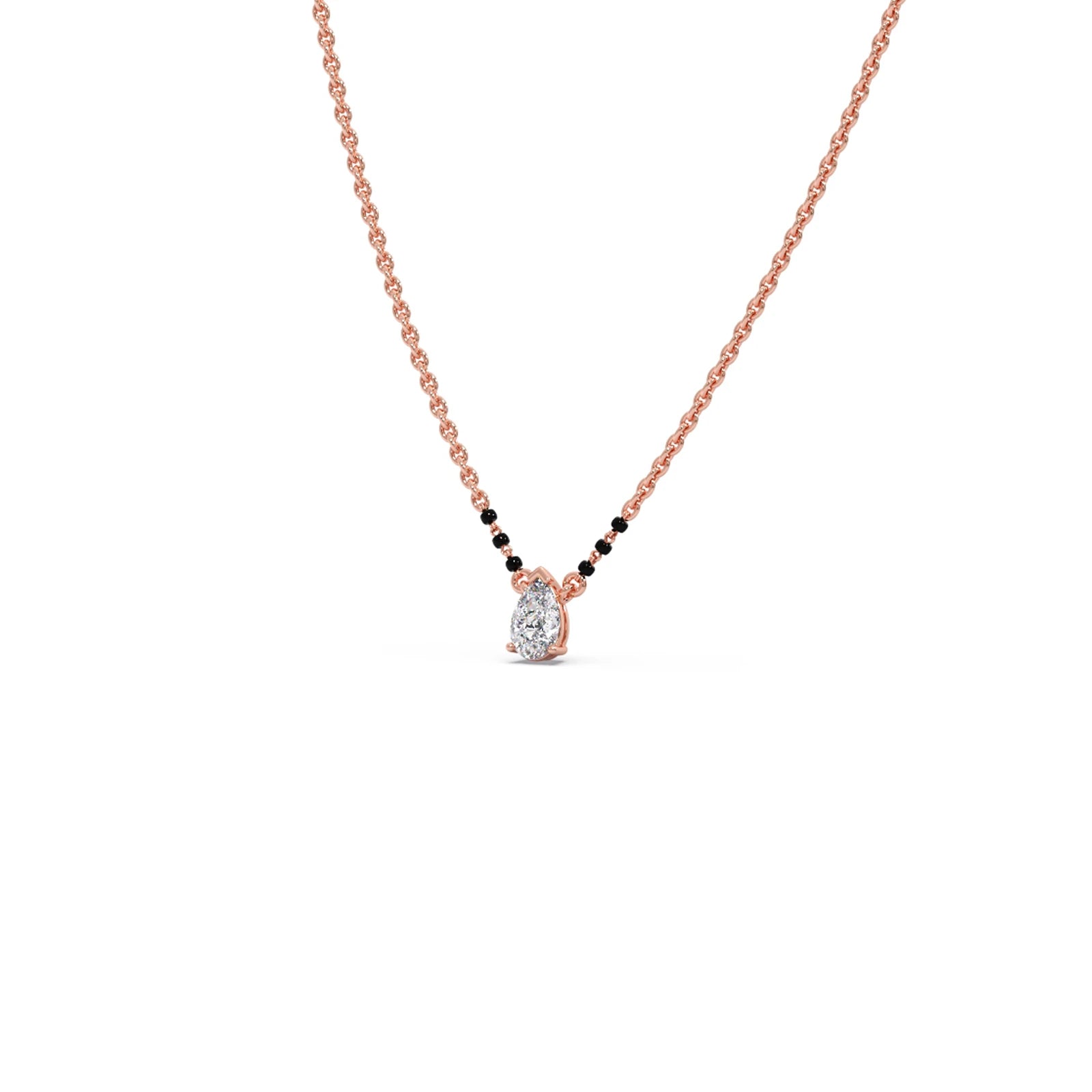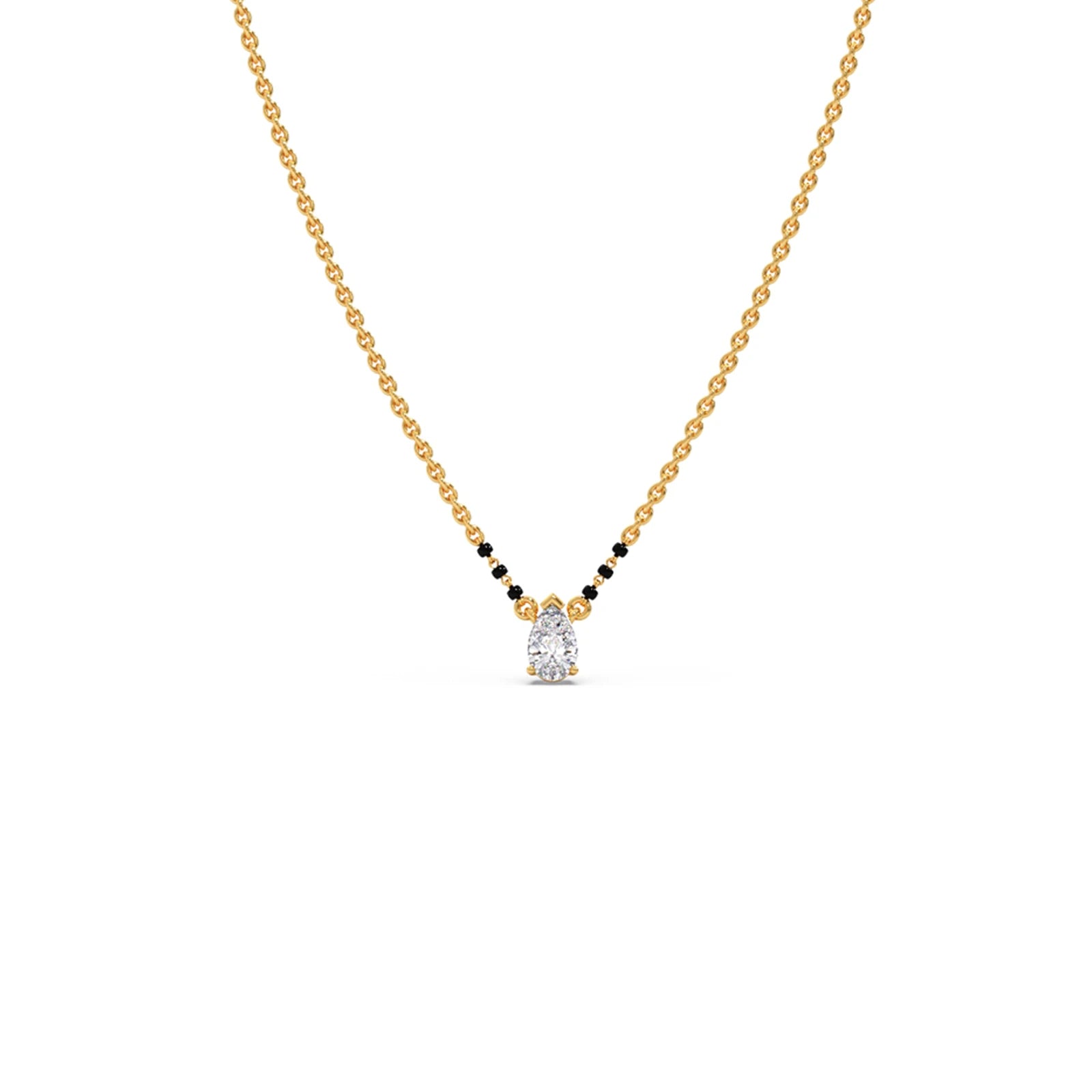 The Pear-Cut Diamond Solitaire Mangalsutra is a delicate fusion of elegance and symbolism. The teardrop-shaped diamond, gracefully suspended on a fine gold chain with traditional black beads, represents love, strength, and new beginnings. Designed for the modern woman who cherishes her roots while embracing contemporary sophistication, this mangalsutra is a perfect balance of tradition and timeless allure.