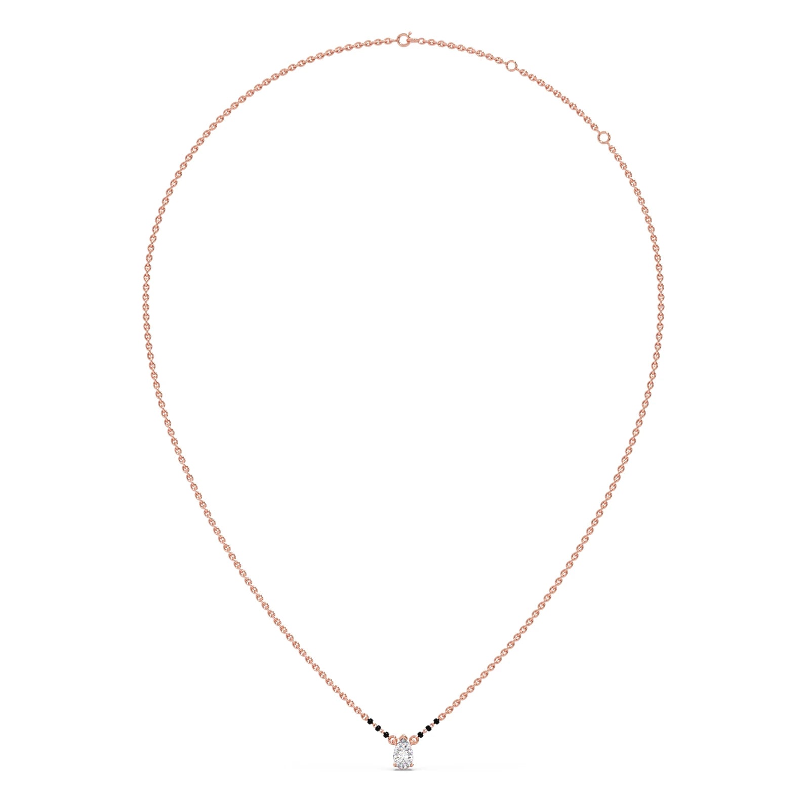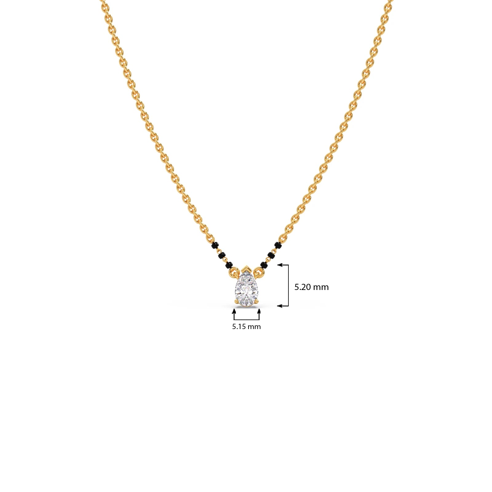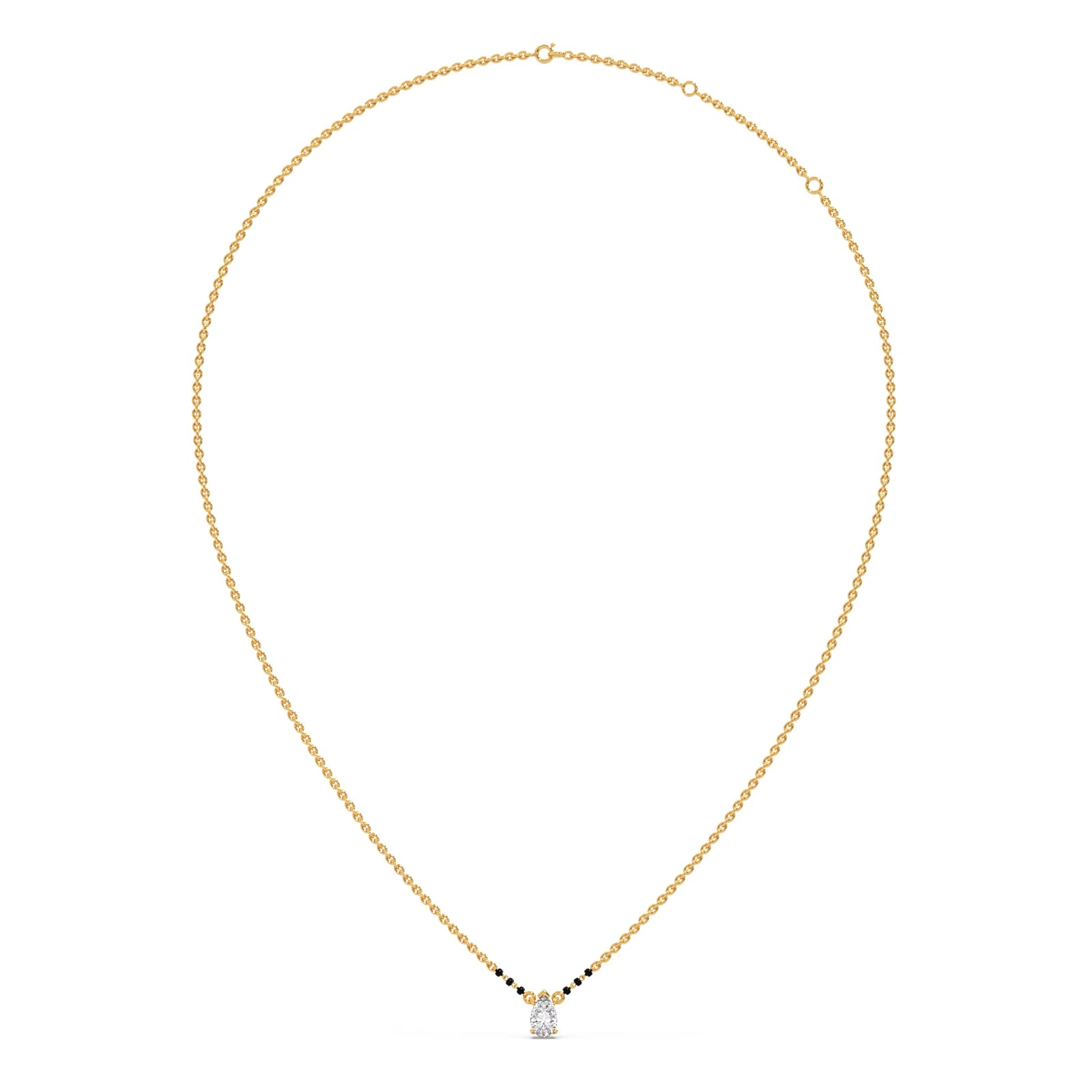 The Pear-Cut Diamond Solitaire Mangalsutra is a delicate fusion of elegance and symbolism. The teardrop-shaped diamond, gracefully suspended on a fine gold chain with traditional black beads, represents love, strength, and new beginnings. Designed for the modern woman who cherishes her roots while embracing contemporary sophistication, this mangalsutra is a perfect balance of tradition and timeless allure.