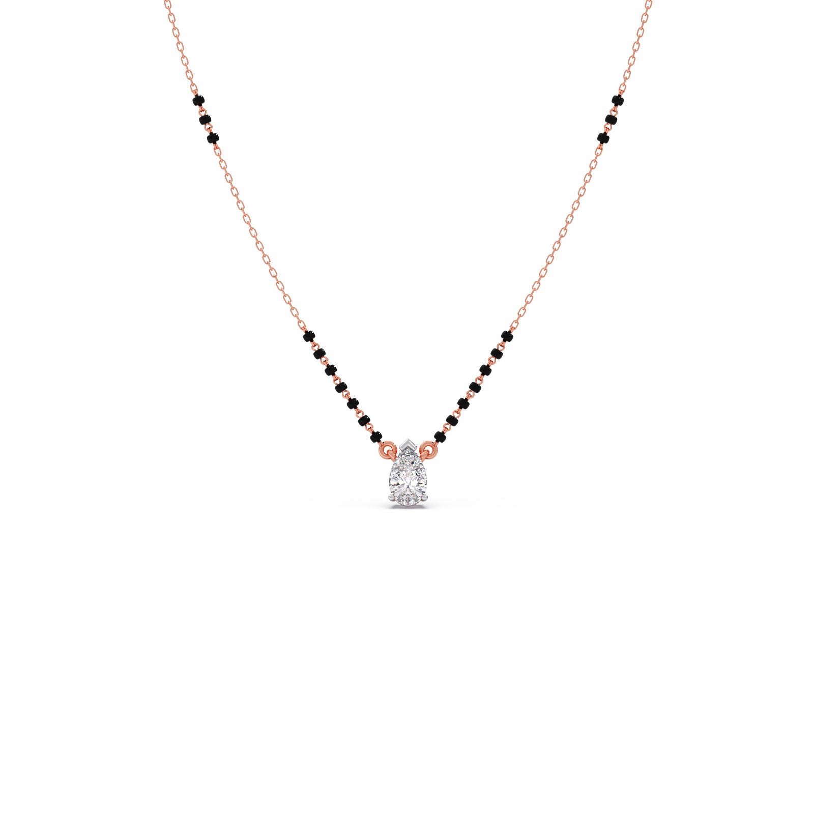The Pear-Cut Diamond Solitaire Mangalsutra is a delicate fusion of elegance and symbolism. The teardrop-shaped diamond, gracefully suspended on a fine gold chain with traditional black beads, represents love, strength, and new beginnings. Designed for the modern woman who cherishes her roots while embracing contemporary sophistication, this mangalsutra is a perfect balance of tradition and timeless allure.