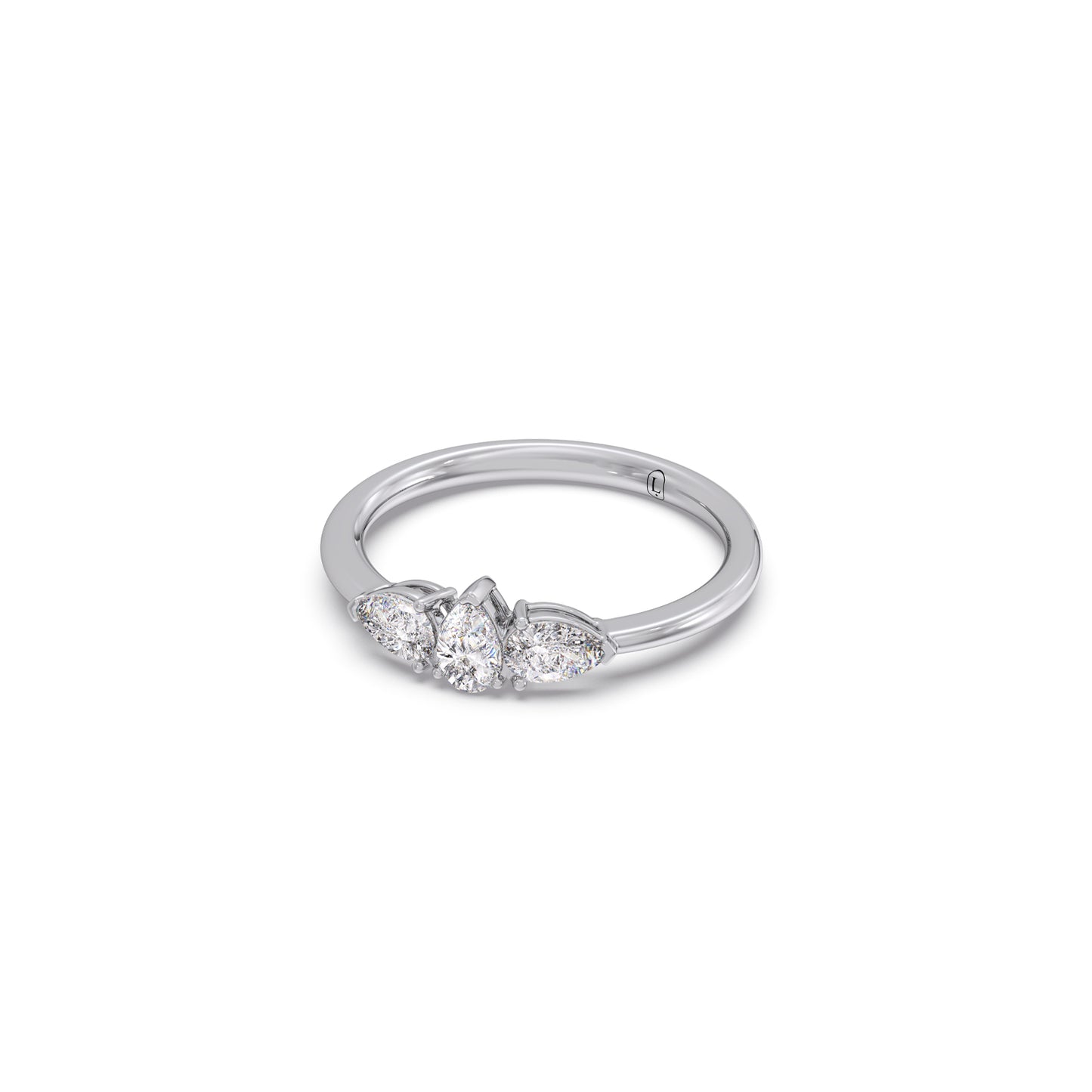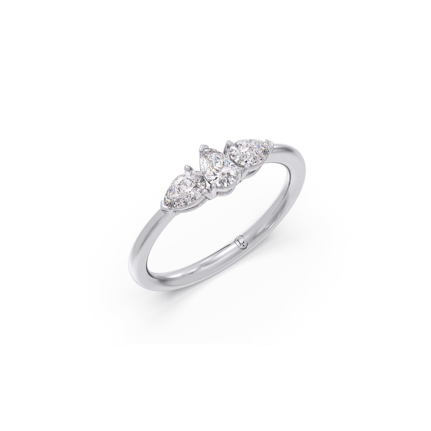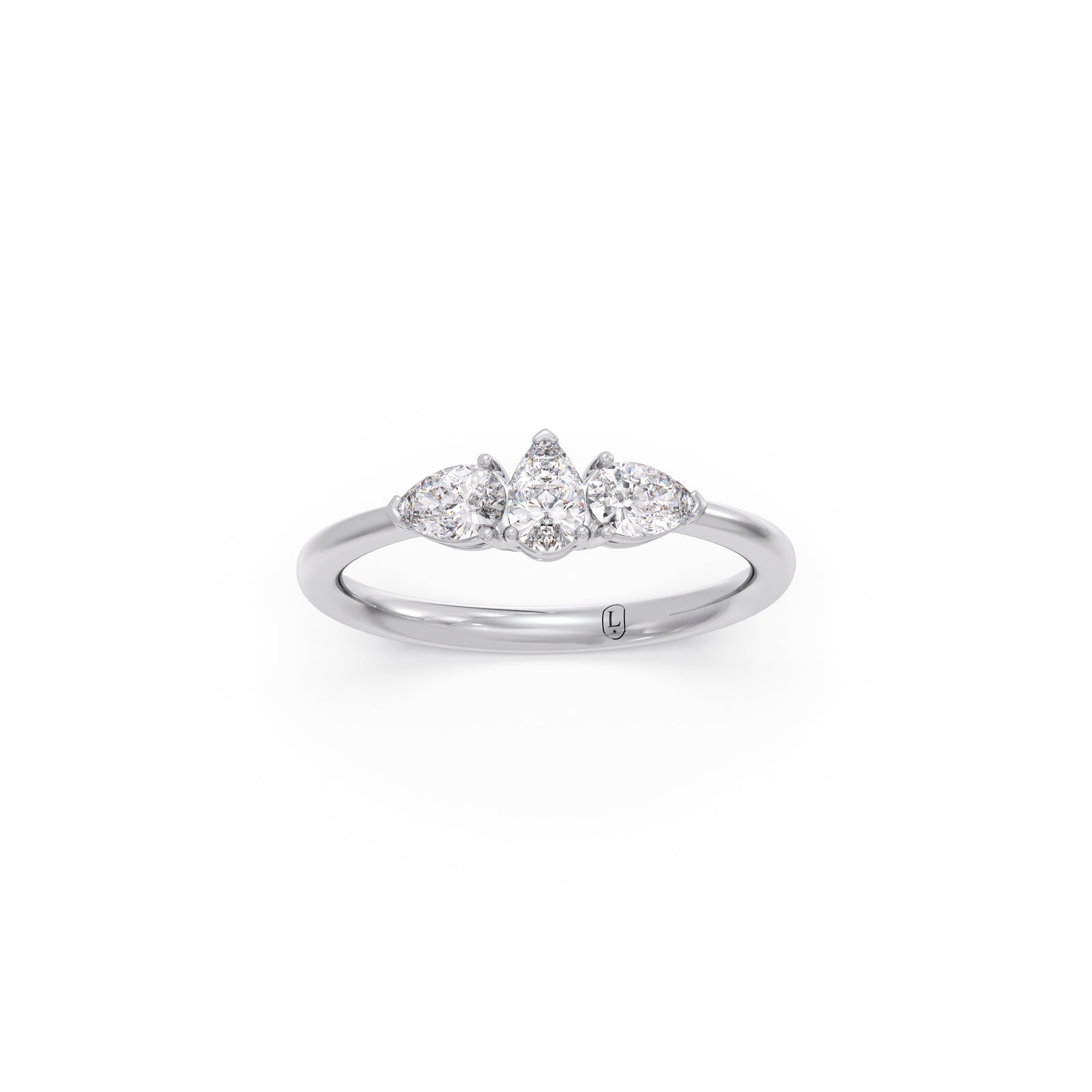 An elegant three-stone ring featuring beautifully matched pear-shaped diamonds. The center stone is complemented by two side pears, creating a refined silhouette with a soft, graceful flow. A timeless design with a modern edge.
