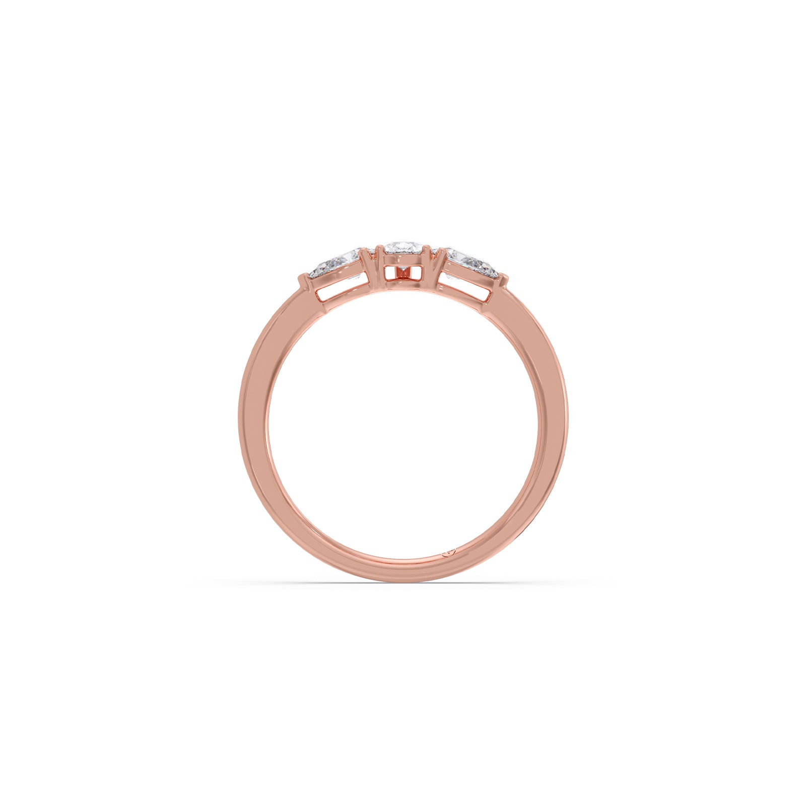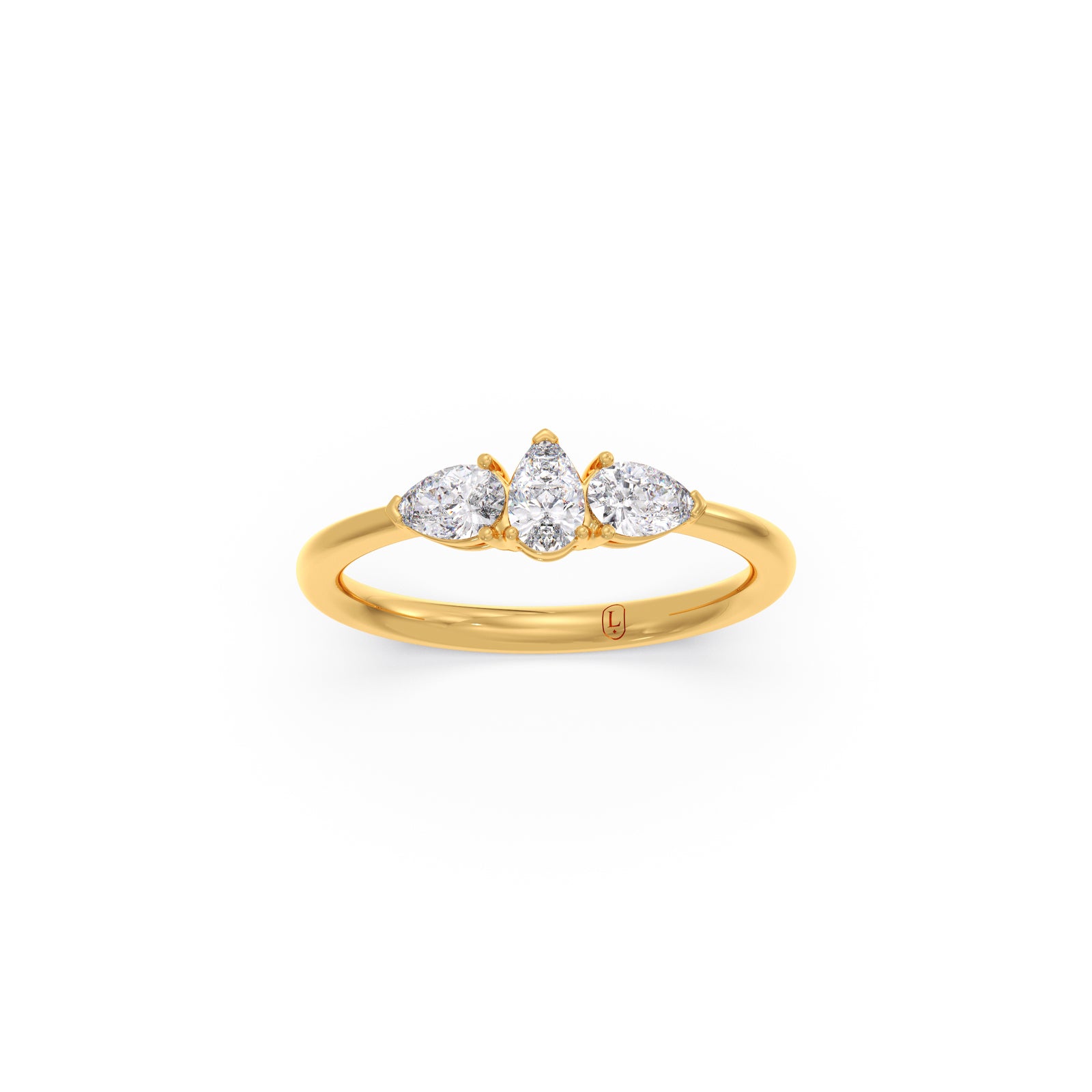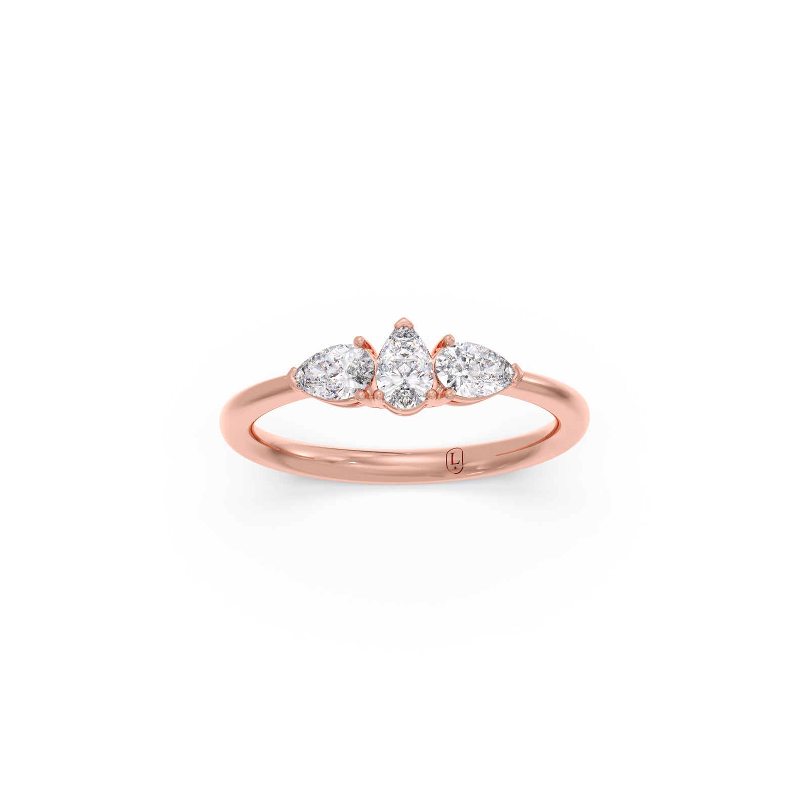 An elegant three-stone ring featuring beautifully matched pear-shaped diamonds. The center stone is complemented by two side pears, creating a refined silhouette with a soft, graceful flow. A timeless design with a modern edge.