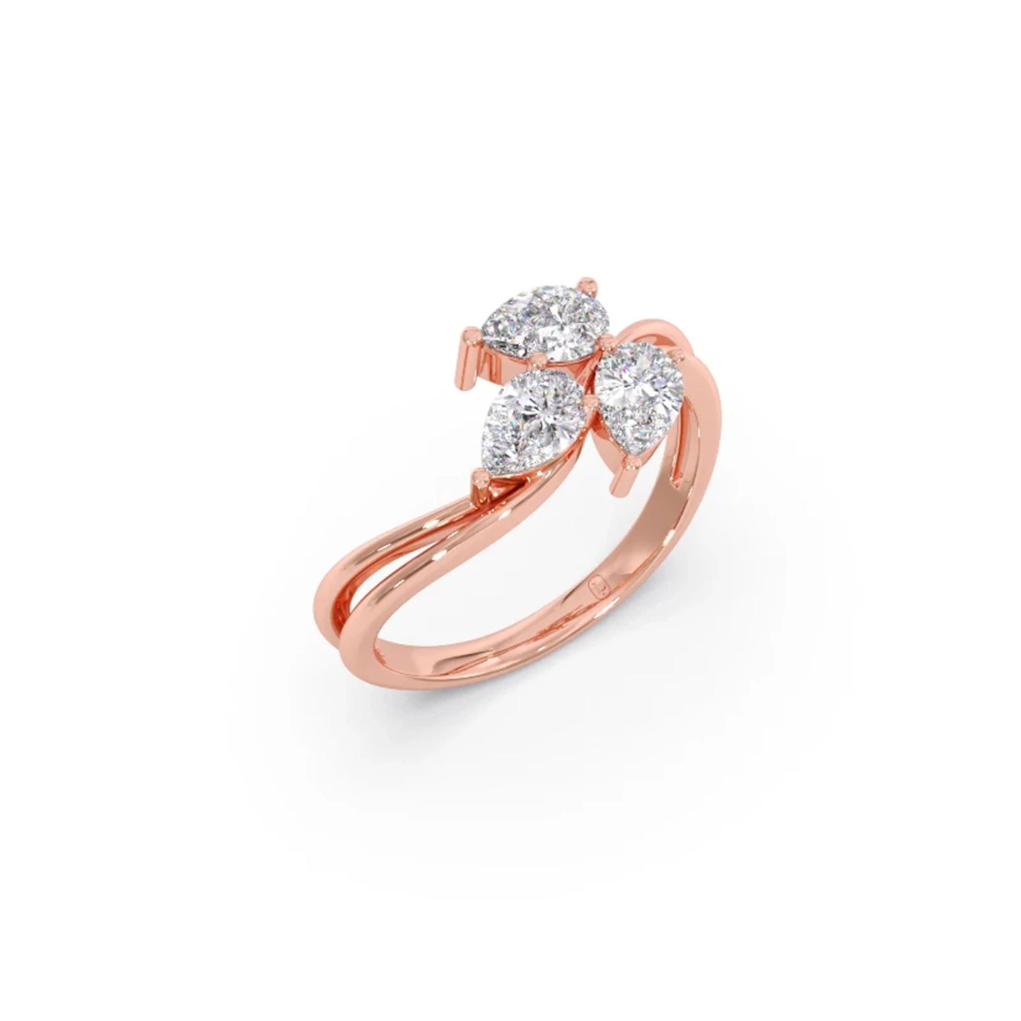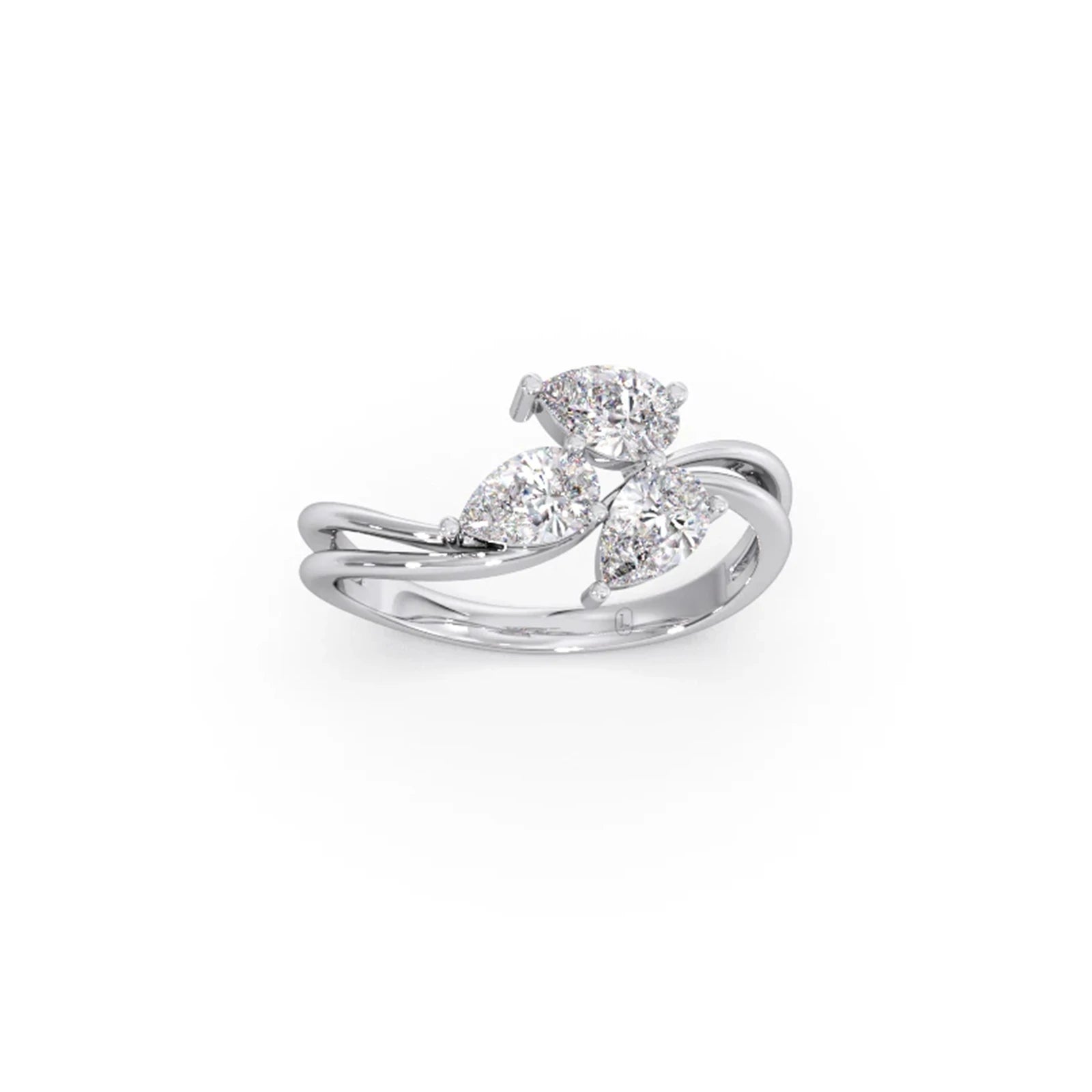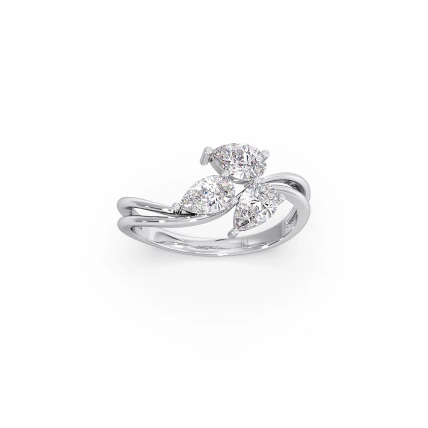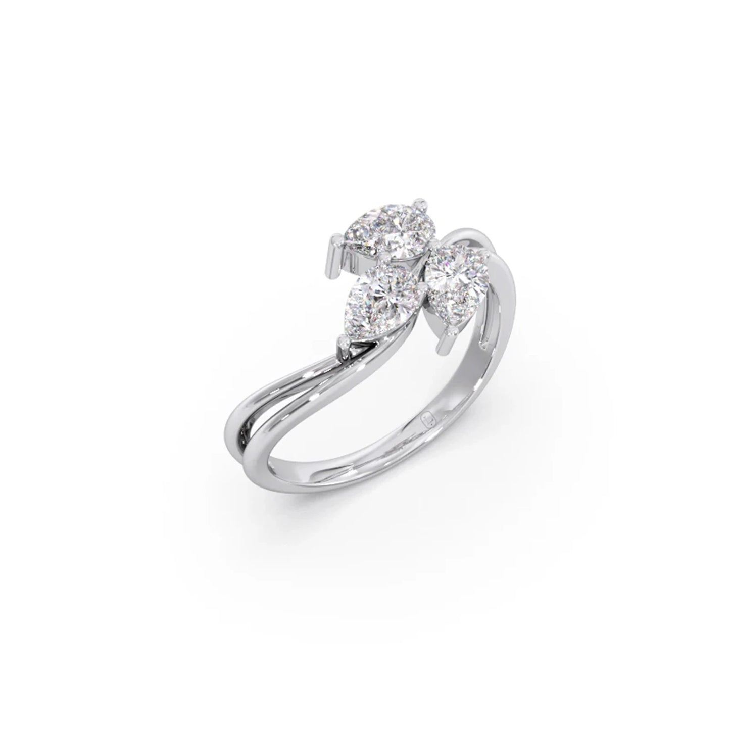 This unique engagement ring features three pear-shaped diamonds in a captivating design, making it a truly special and unforgettable piece of jewelry.