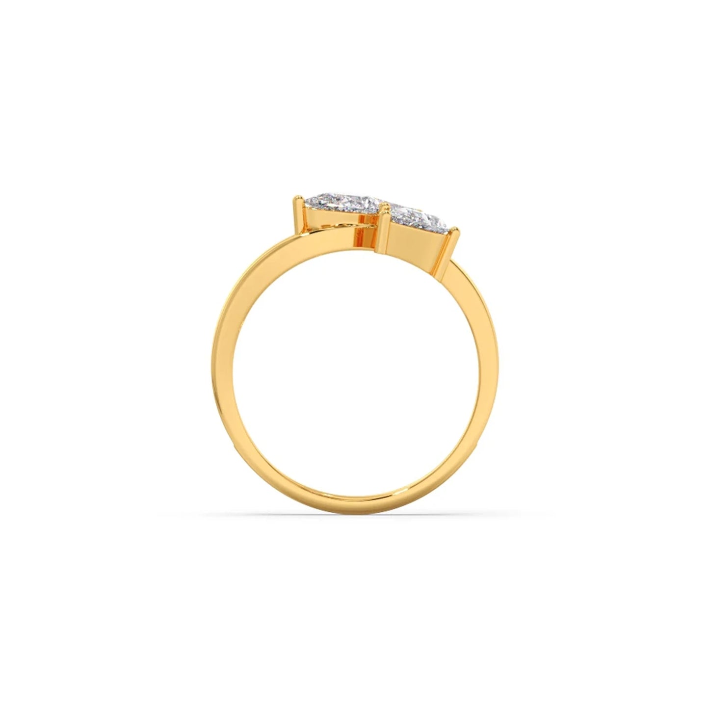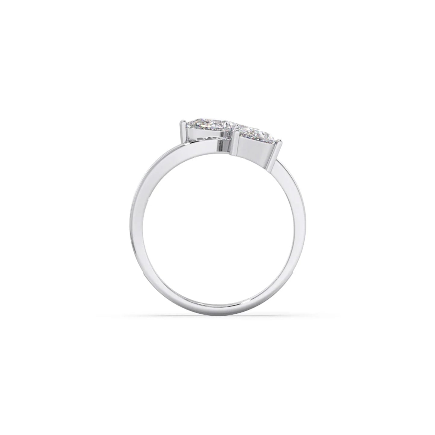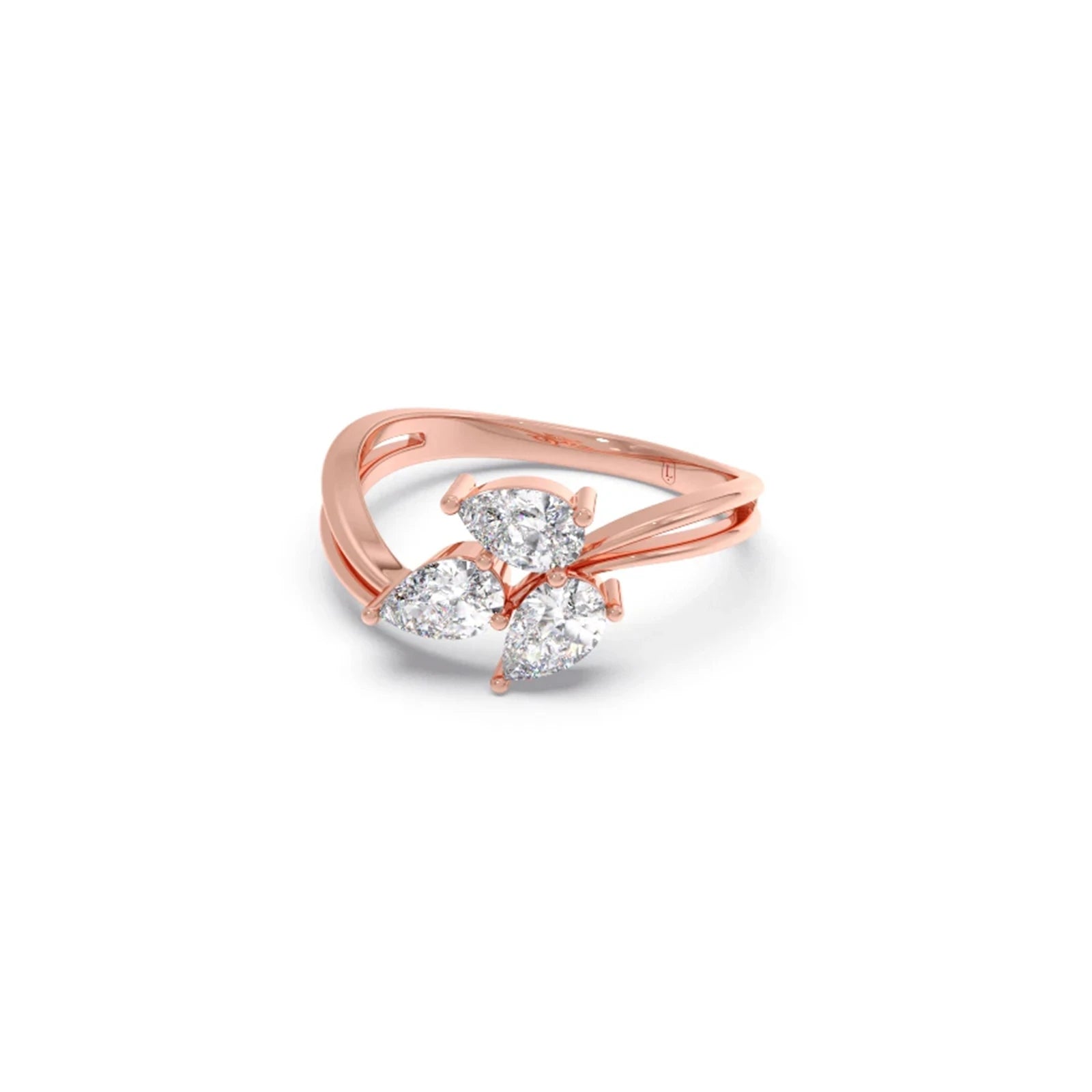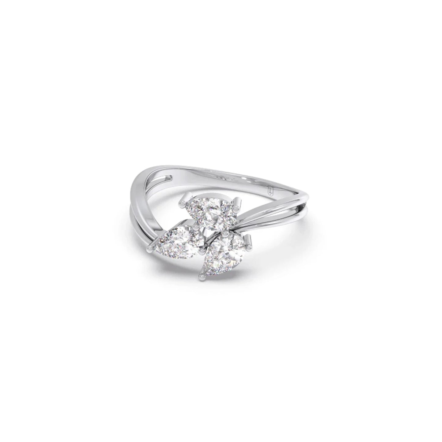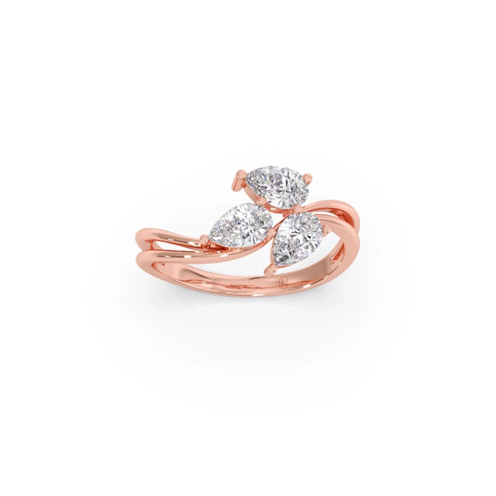This unique engagement ring features three pear-shaped diamonds in a captivating design, making it a truly special and unforgettable piece of jewelry.