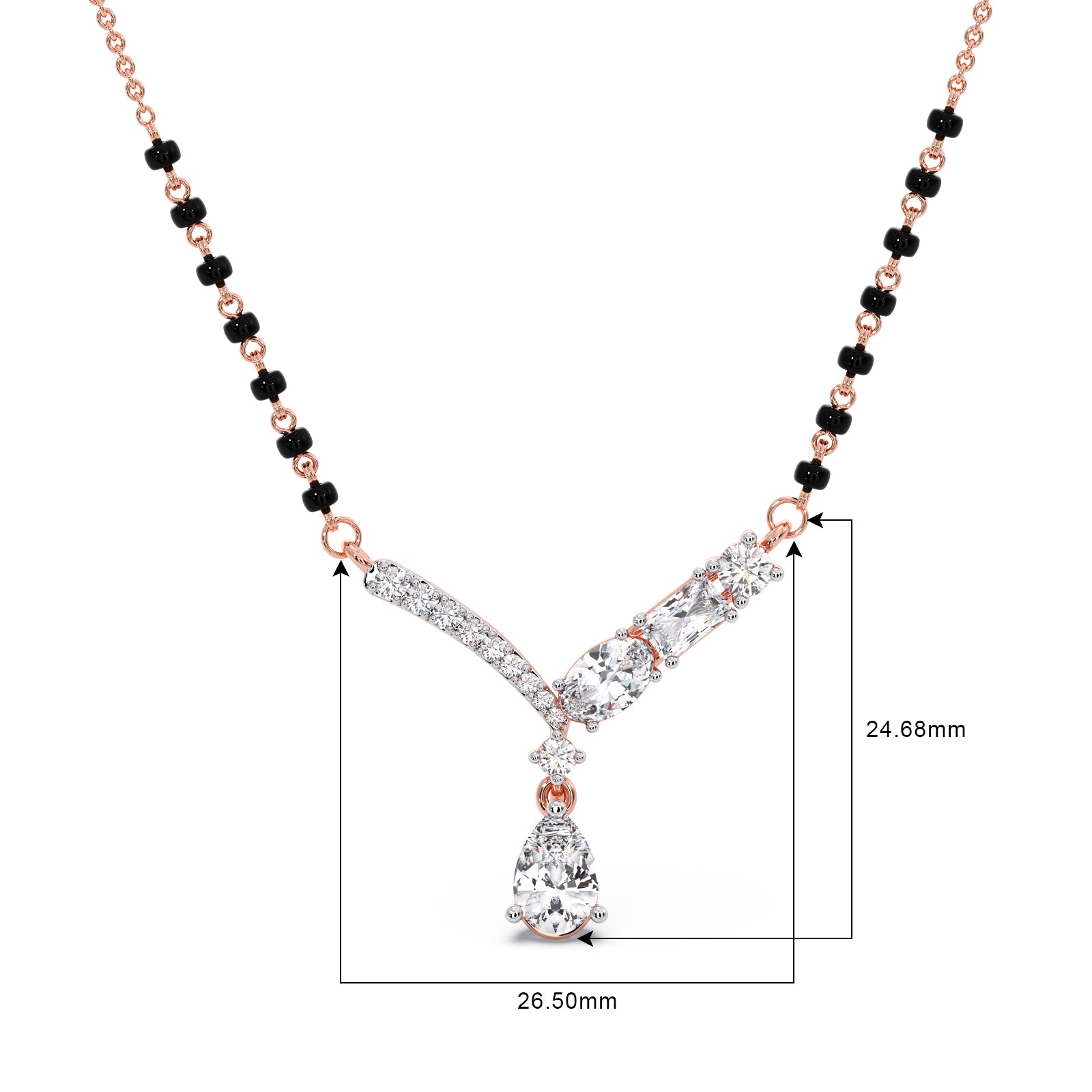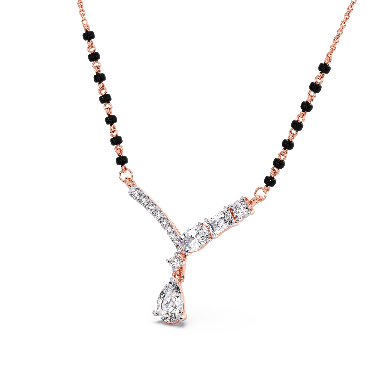 A stunning Pear Drop Multi-Cut Diamond Mangalsutra, featuring a graceful V-shaped design adorned with a mix of pear, oval, round, and baguette-cut diamonds. Set in rose gold with delicate black beads, this modern piece blends tradition with contemporary elegance.
