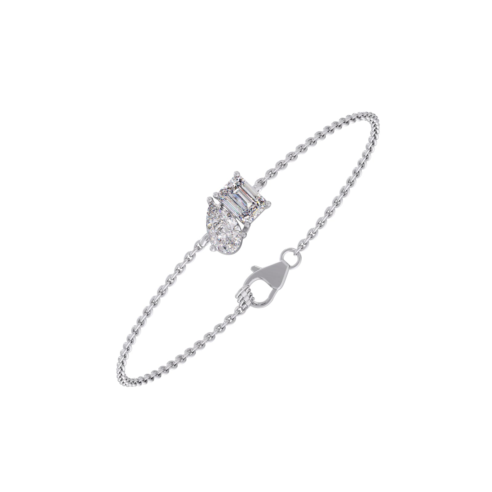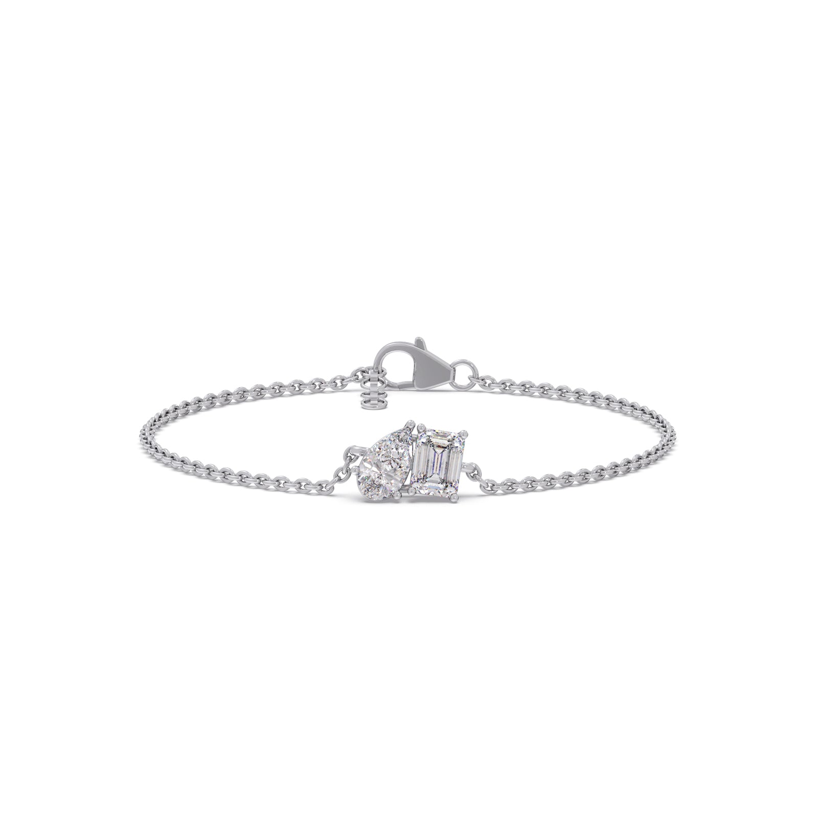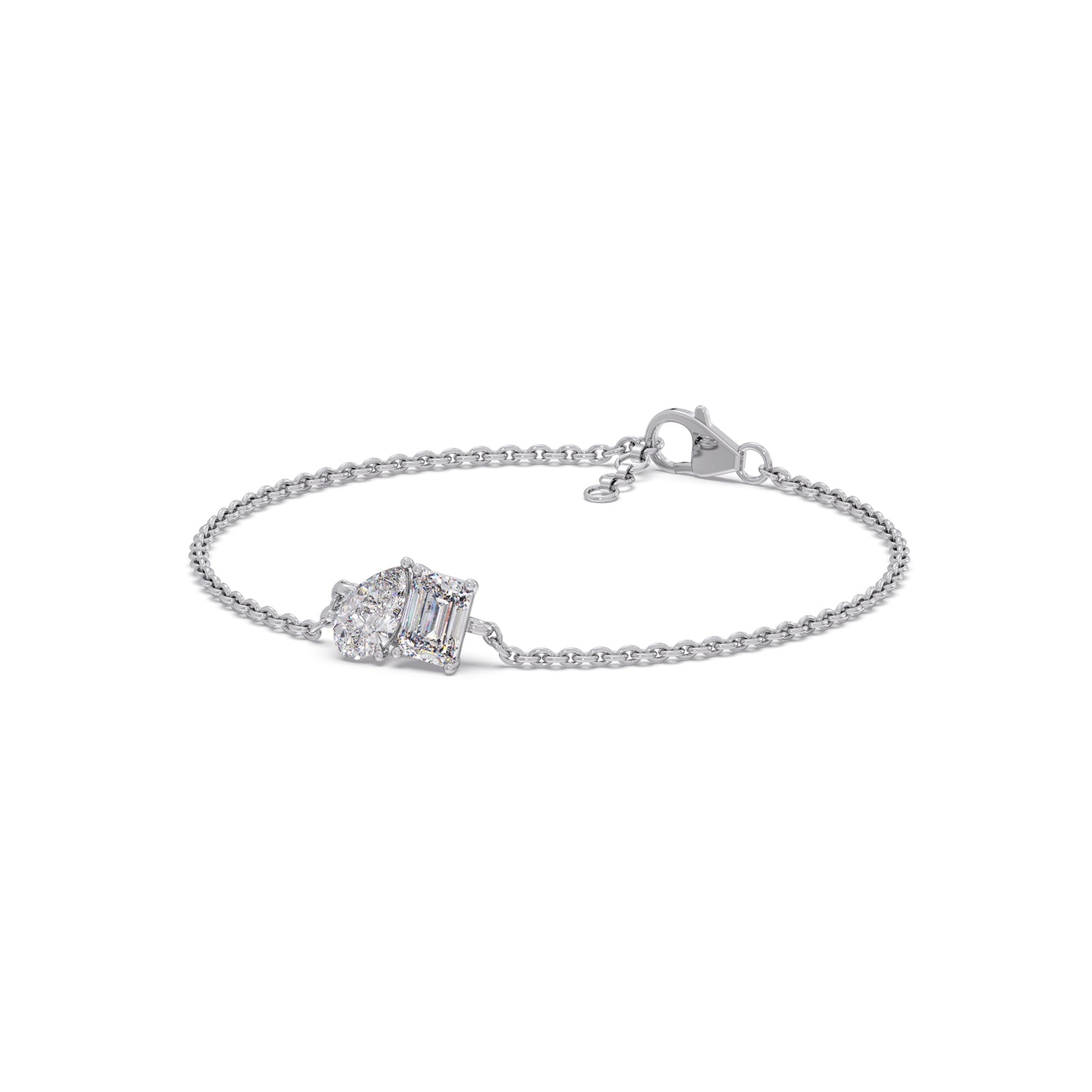 A delicate chain bracelet features a central setting showcasing a pear and emerald cut diamond. The stones are likely set closely, creating a unique focal point. The thin chain, possibly in a precious metal, emphasizes the delicate nature of the bracelet, offering subtle elegance.