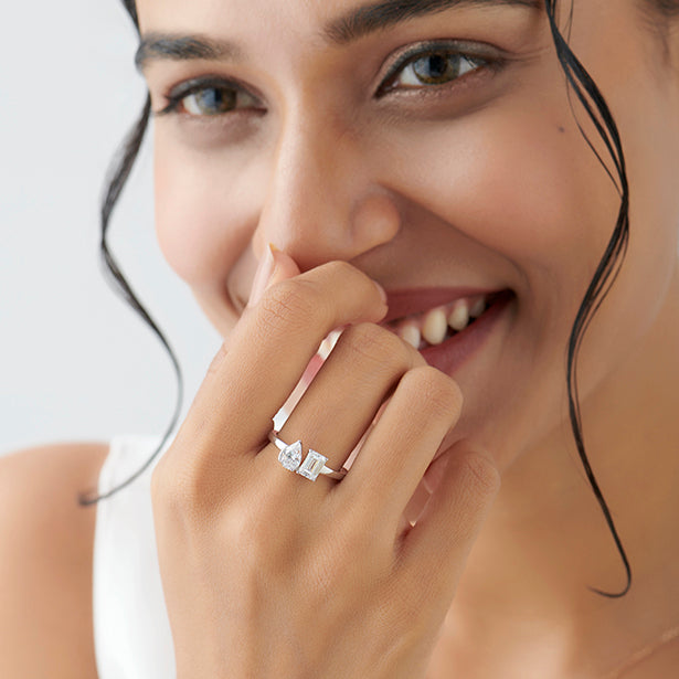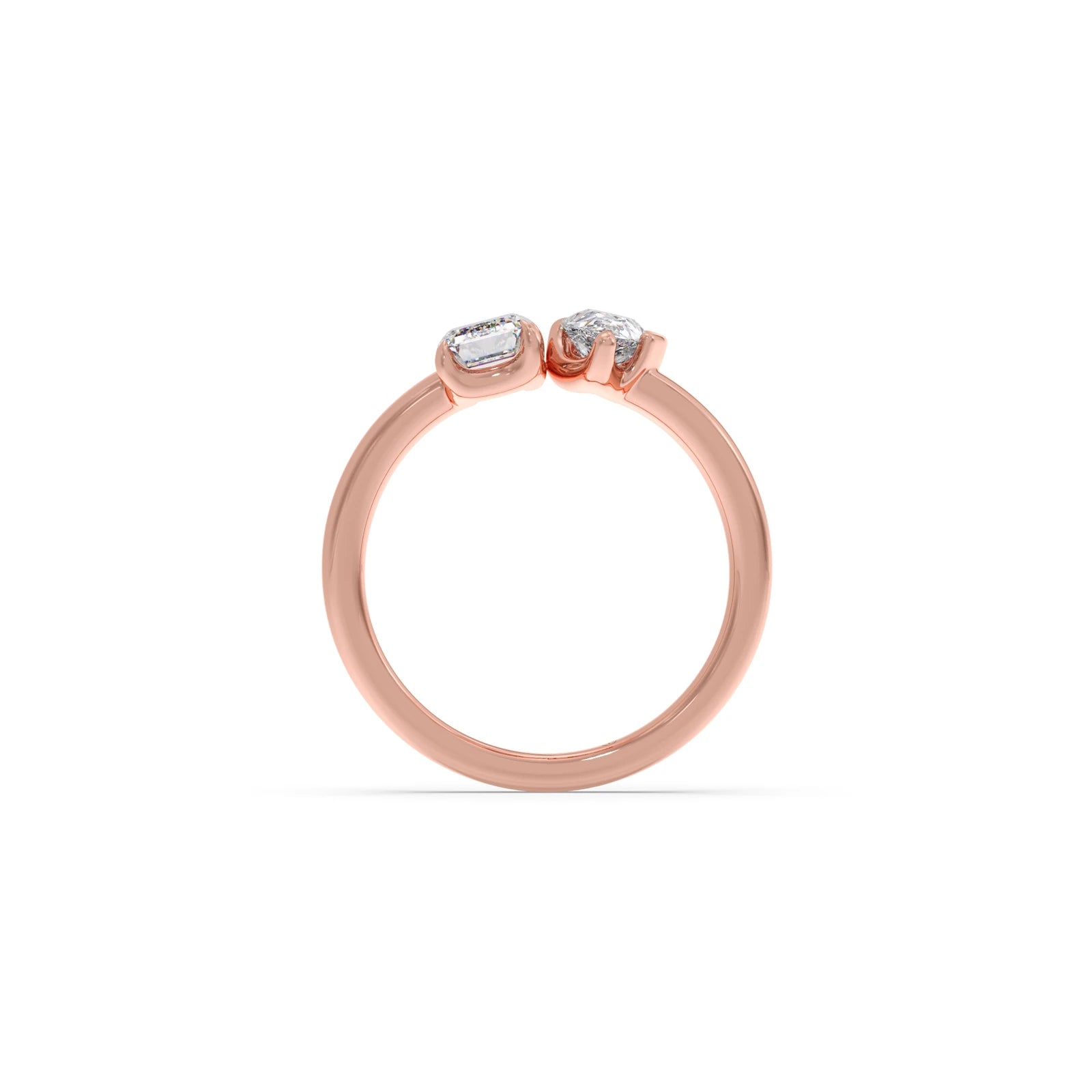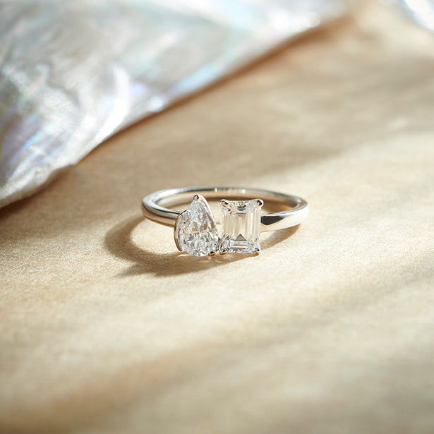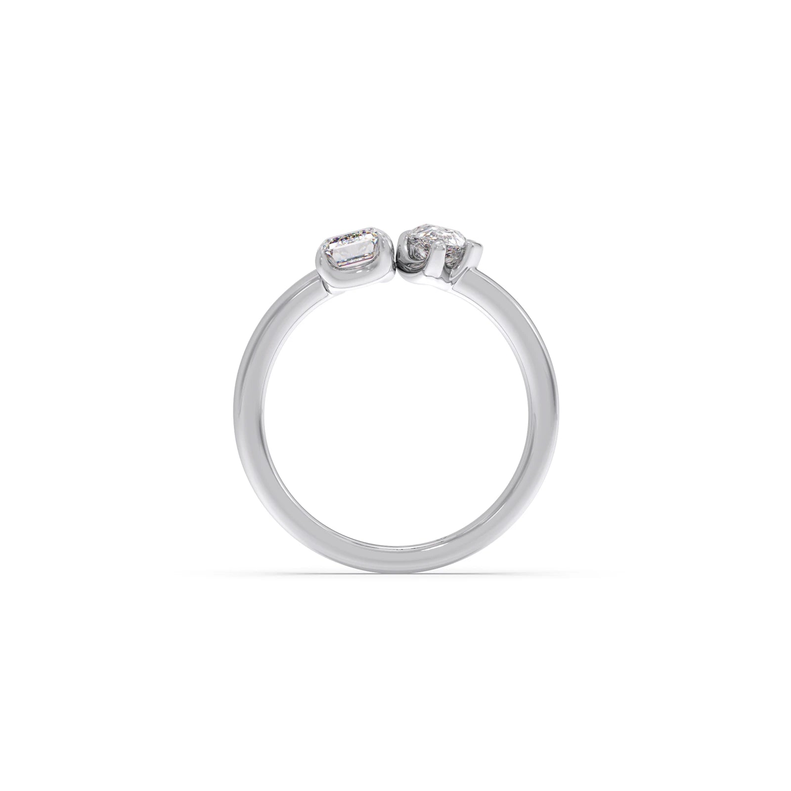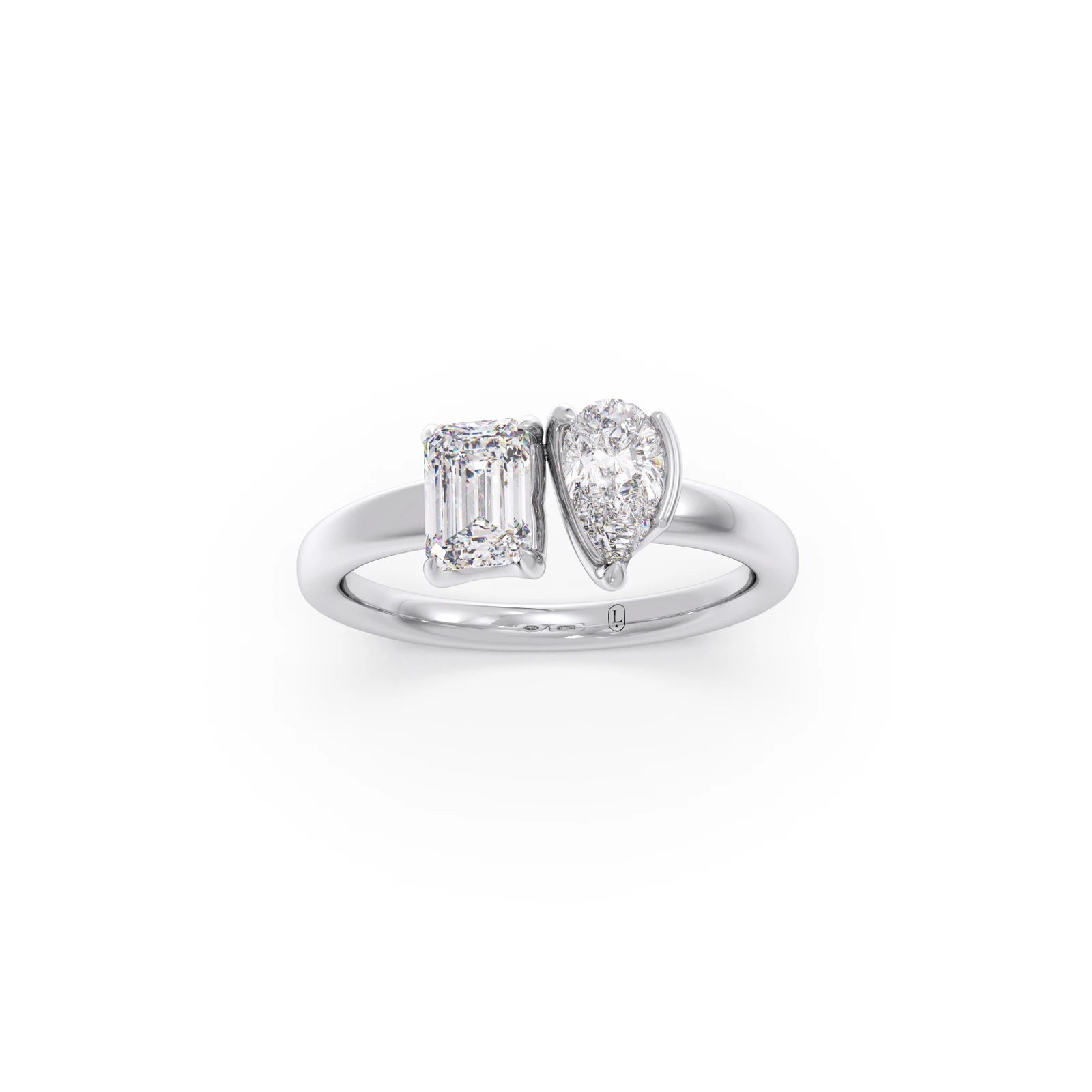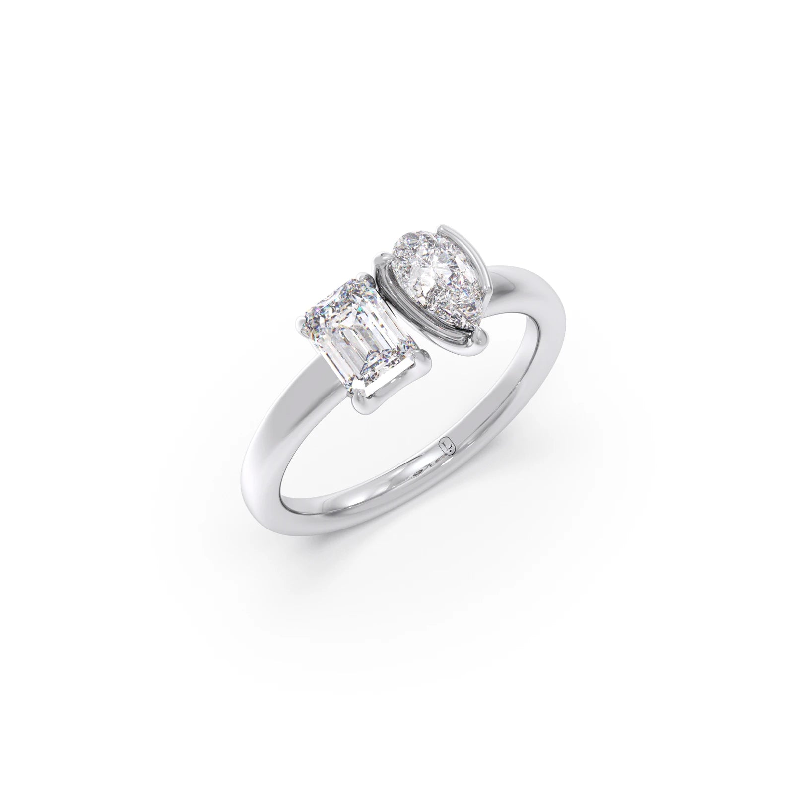Two souls, one love. It’s a timeless symbol of two lives coming together, perfectly balanced yet beautifully distinct. Each stone represents a soul, standing side by side, intertwined in love, respect, and shared destiny. This elegant Toi et Moi ring brings together a 0.75 ct. emerald-cut diamond and a 0.5 ct. pear-cut diamond — two distinct shapes that beautifully reflect the harmony of two souls in love.