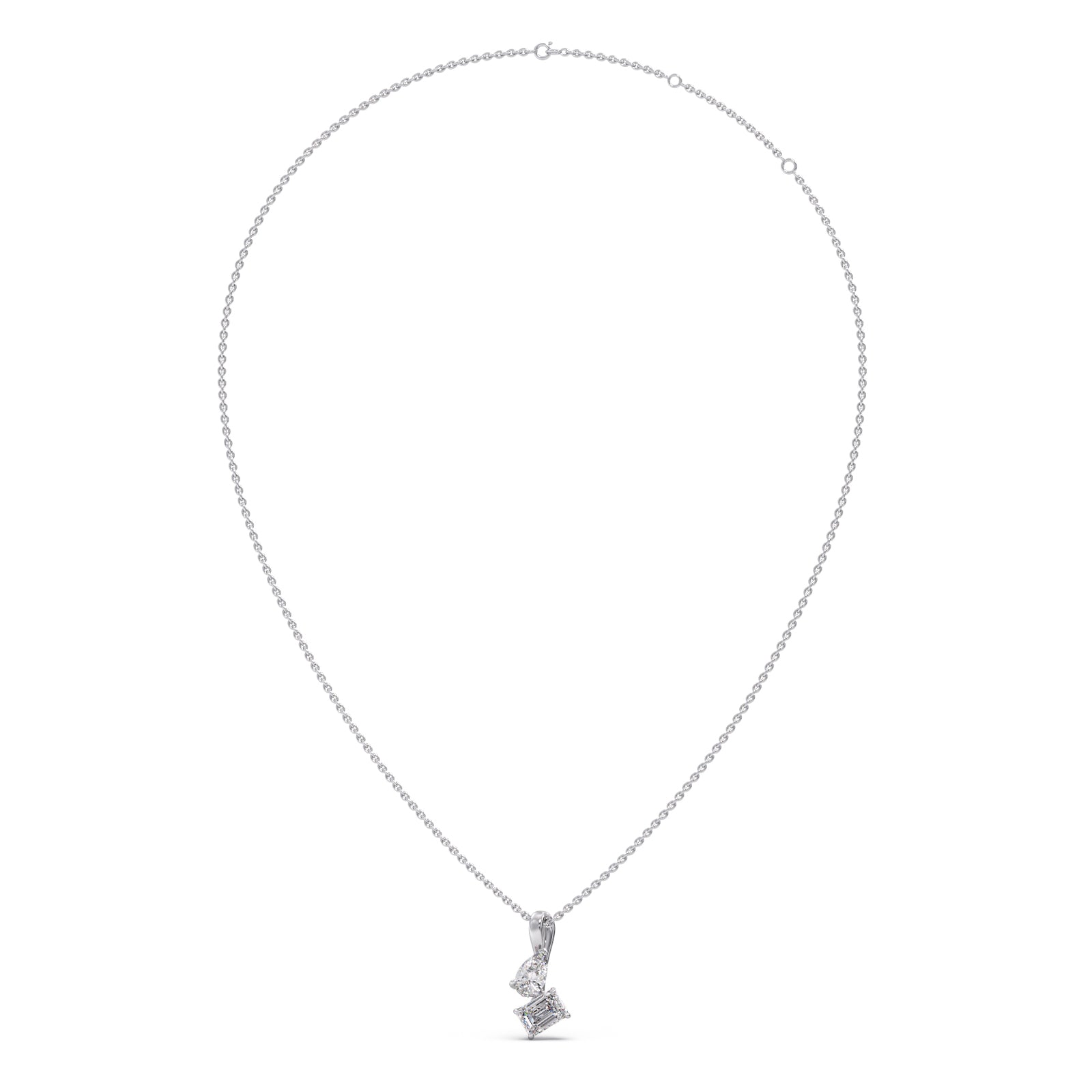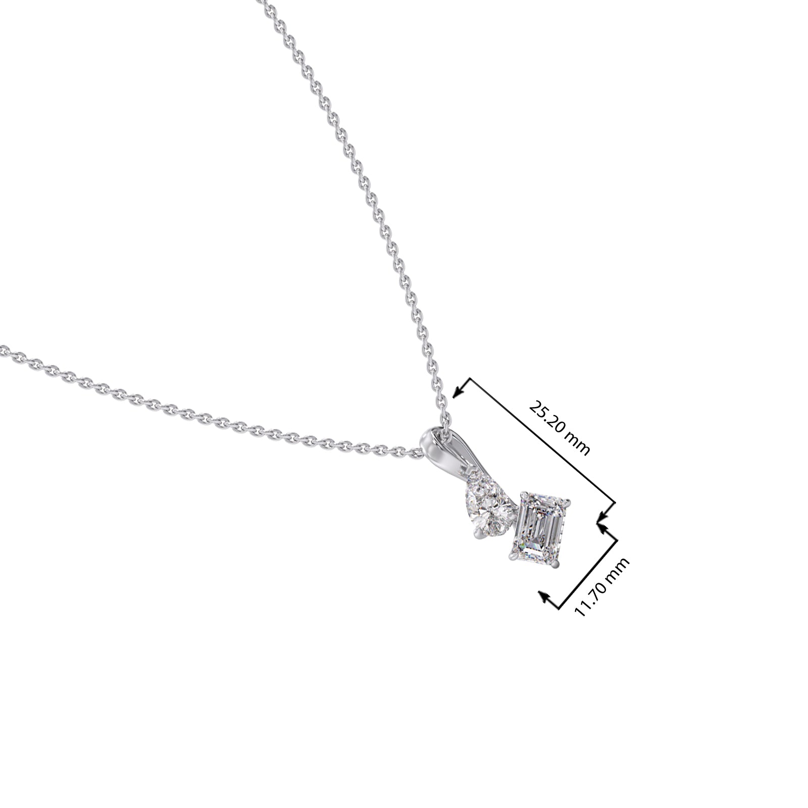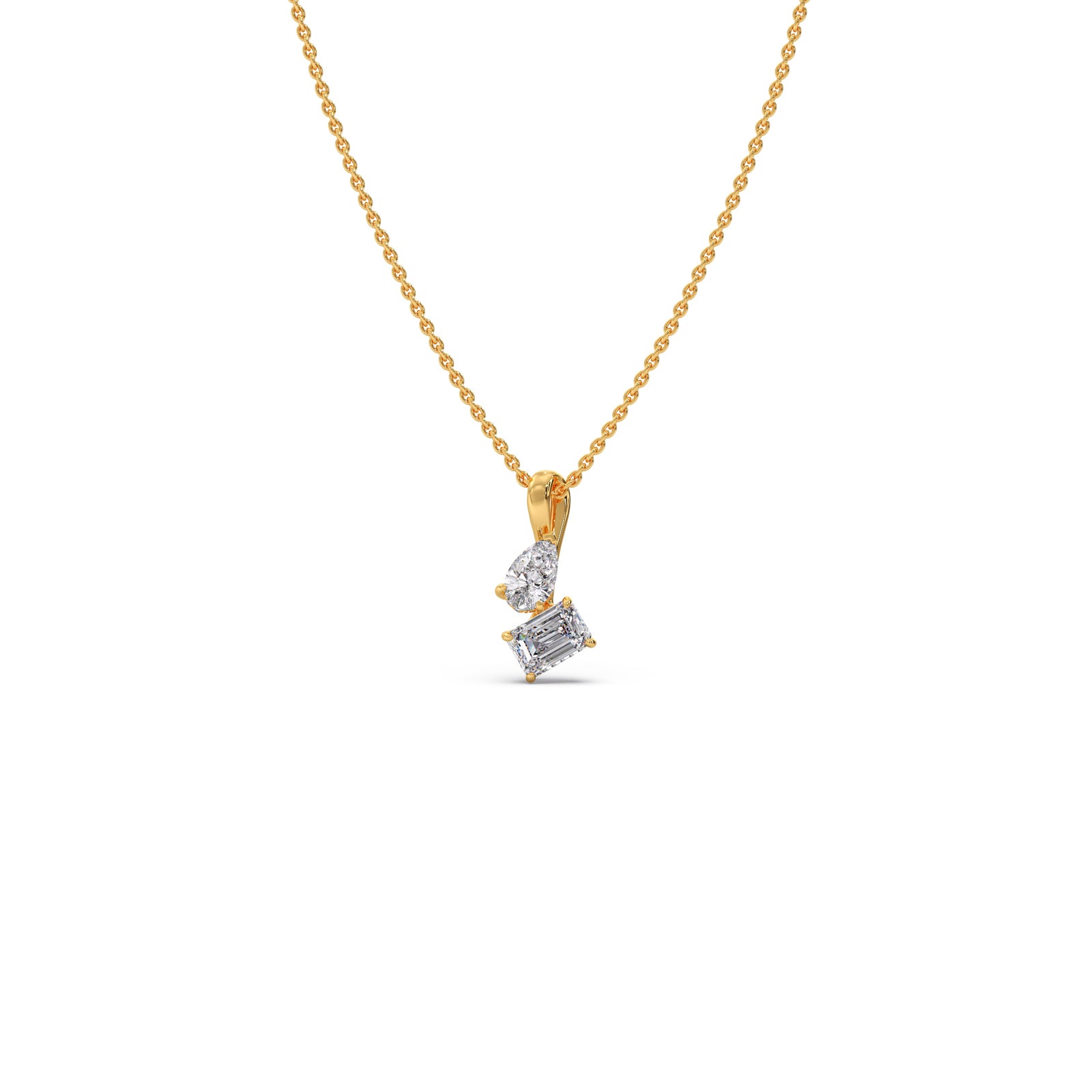 Dazzle with our exquisite pendant, featuring a captivating pear-shaped diamond paired with a stunning emerald-cut diamond. This unique design radiates timeless elegance and modern sophistication, perfect for adding a touch of brilliance to any occasion
