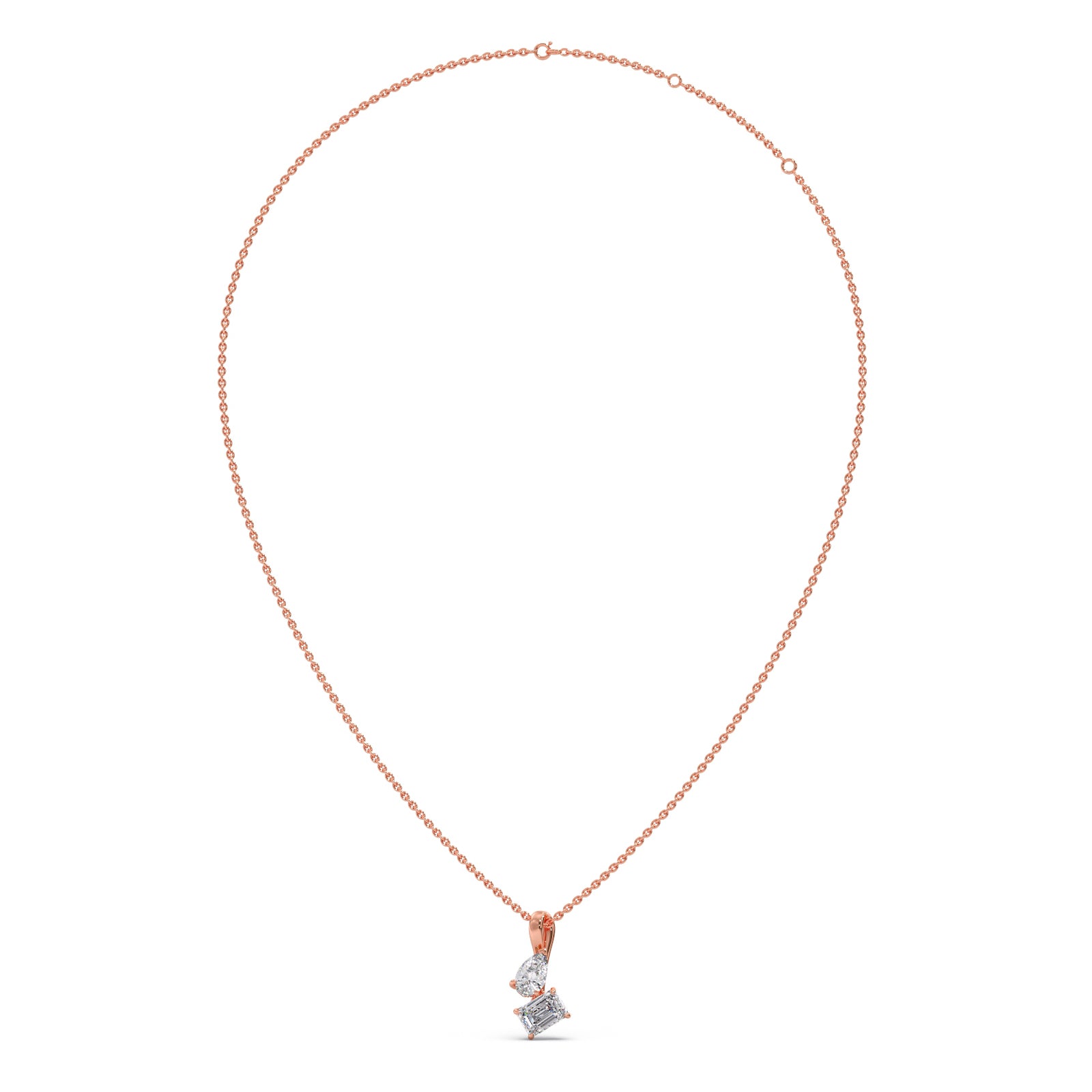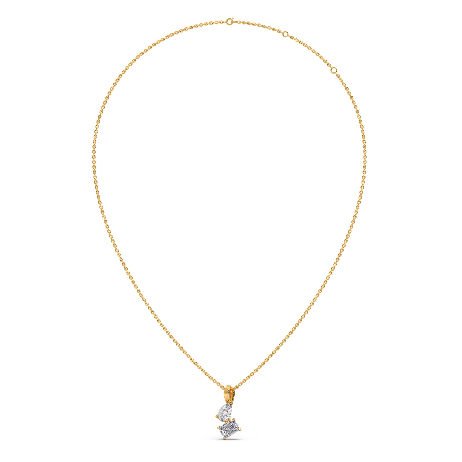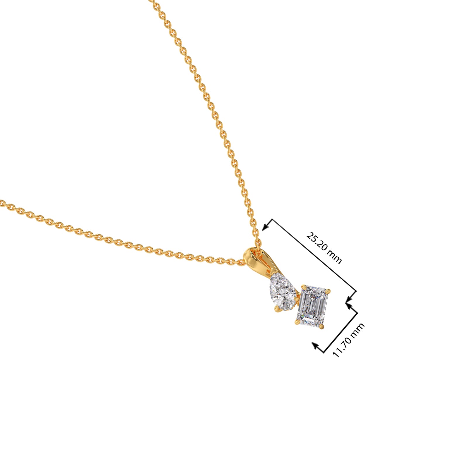 Dazzle with our exquisite pendant, featuring a captivating pear-shaped diamond paired with a stunning emerald-cut diamond. This unique design radiates timeless elegance and modern sophistication, perfect for adding a touch of brilliance to any occasion