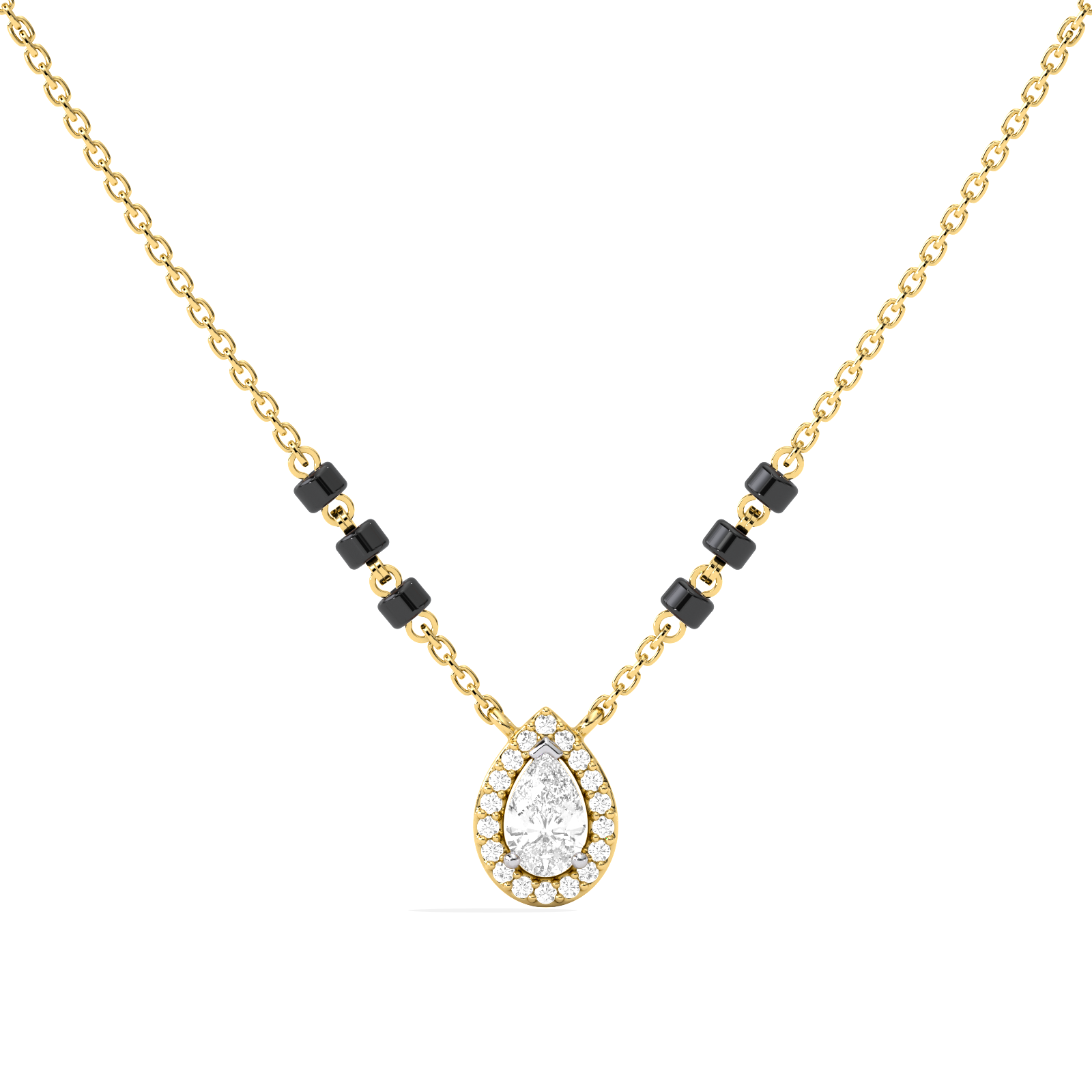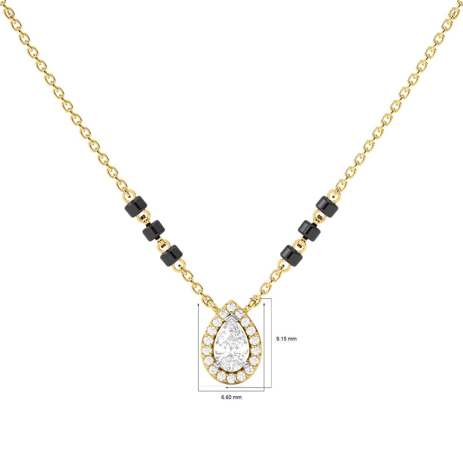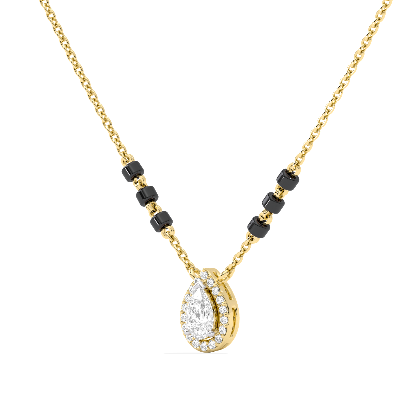 The Pear Halo Diamond Mangalsutra Necklace is more than just jewelry. it's a symbol of love, strength, and the journey of a woman. The pear-cut diamond, wrapped in a shimmering halo, catches the light beautifully, just like the glow of a bride on her special day. The delicate black beads add a touch of tradition, blending heritage with modern style.