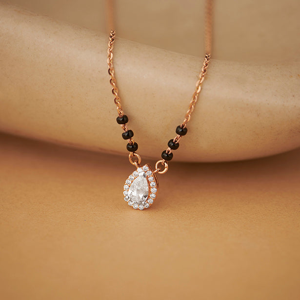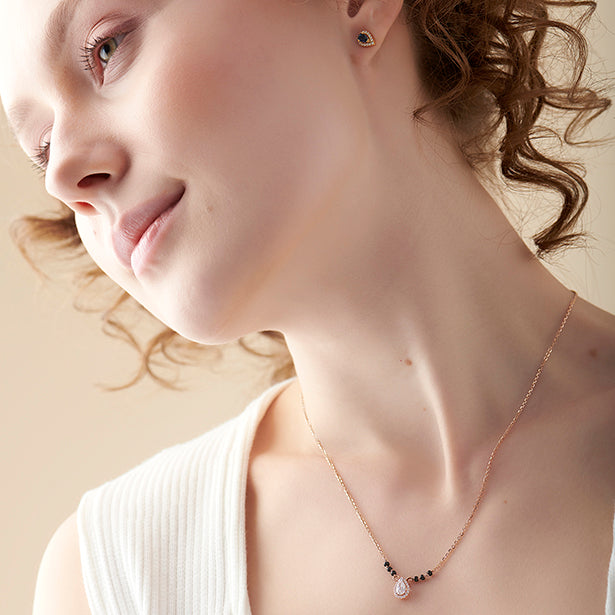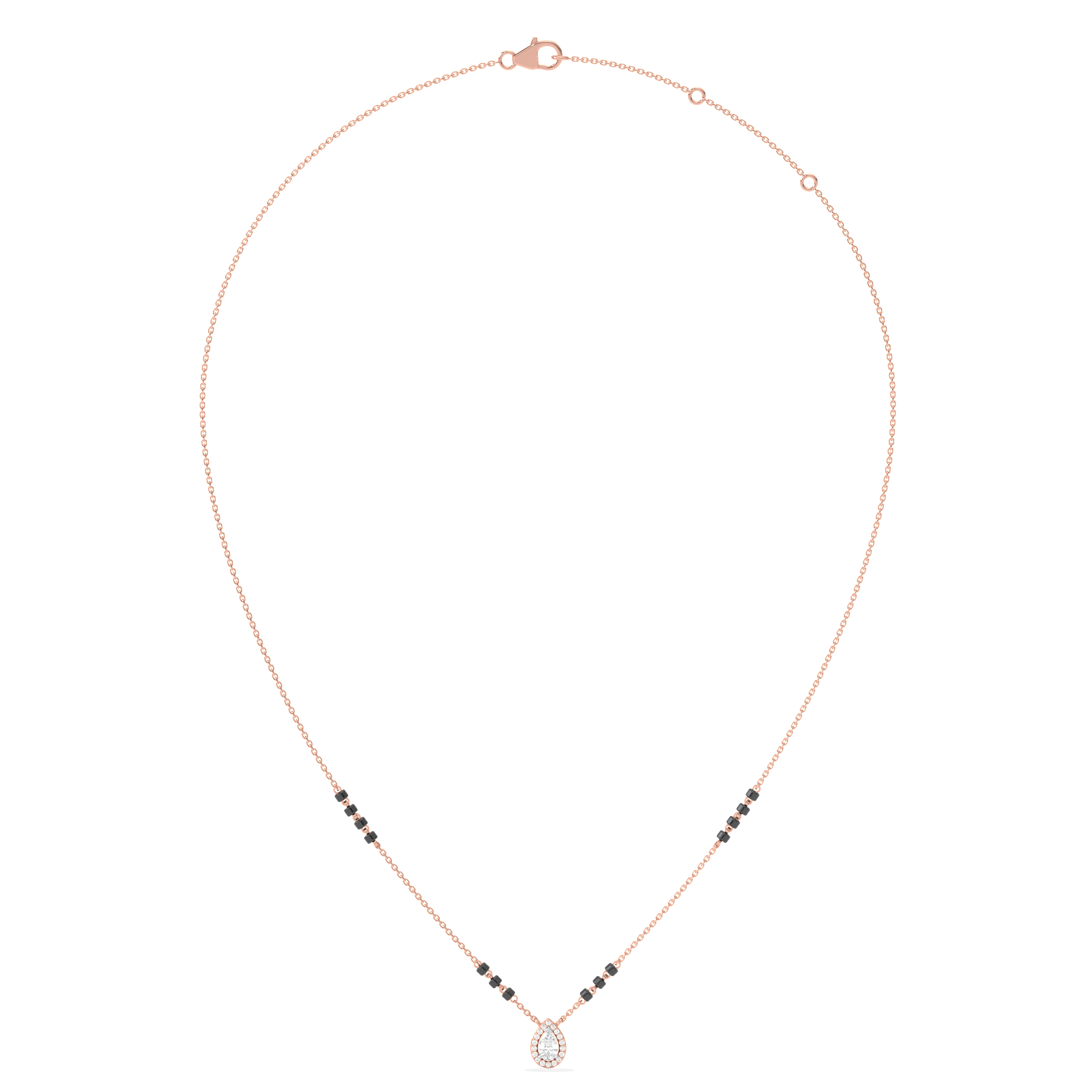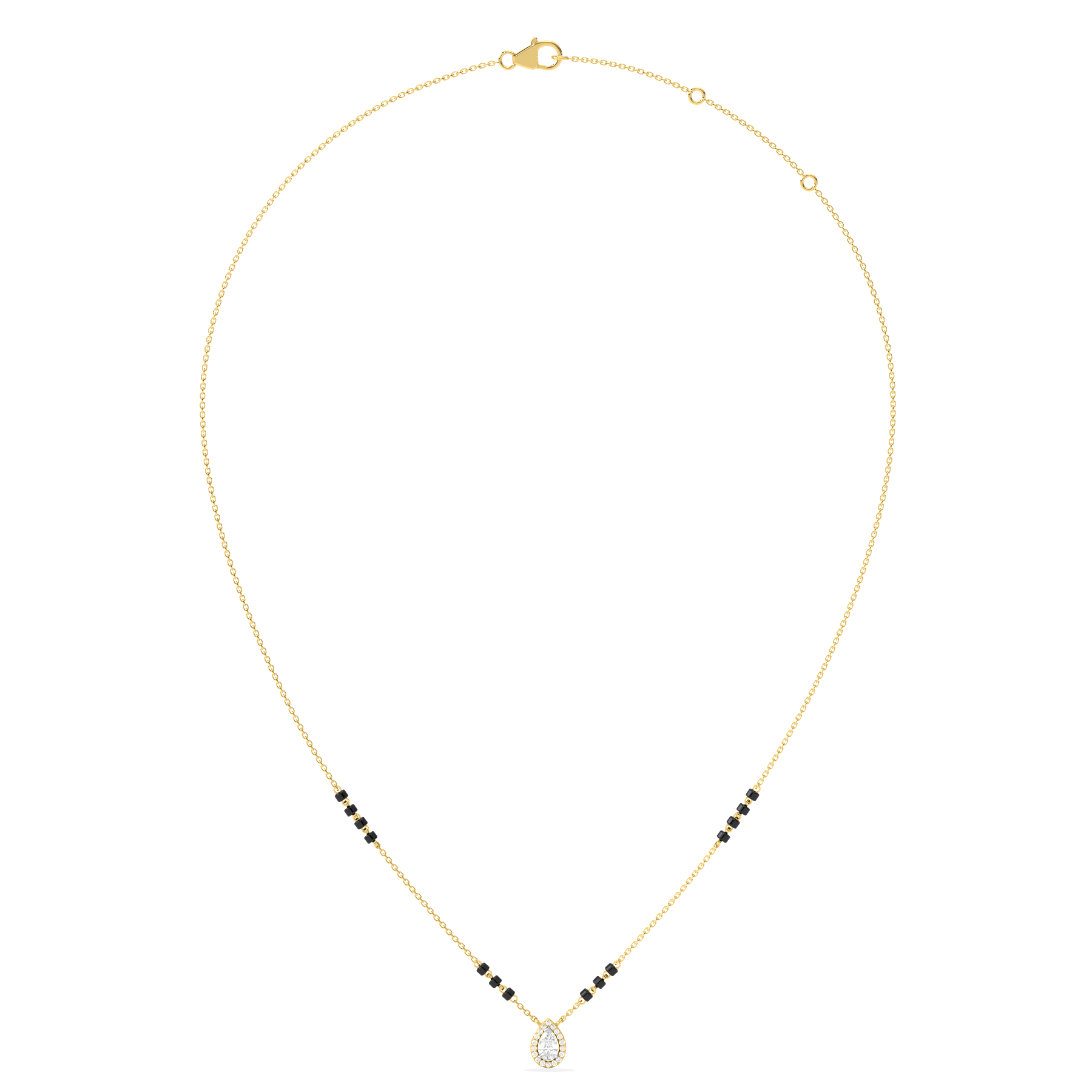 The Pear Halo Diamond Mangalsutra Necklace is more than just jewelry. it's a symbol of love, strength, and the journey of a woman. The pear-cut diamond, wrapped in a shimmering halo, catches the light beautifully, just like the glow of a bride on her special day. The delicate black beads add a touch of tradition, blending heritage with modern style.