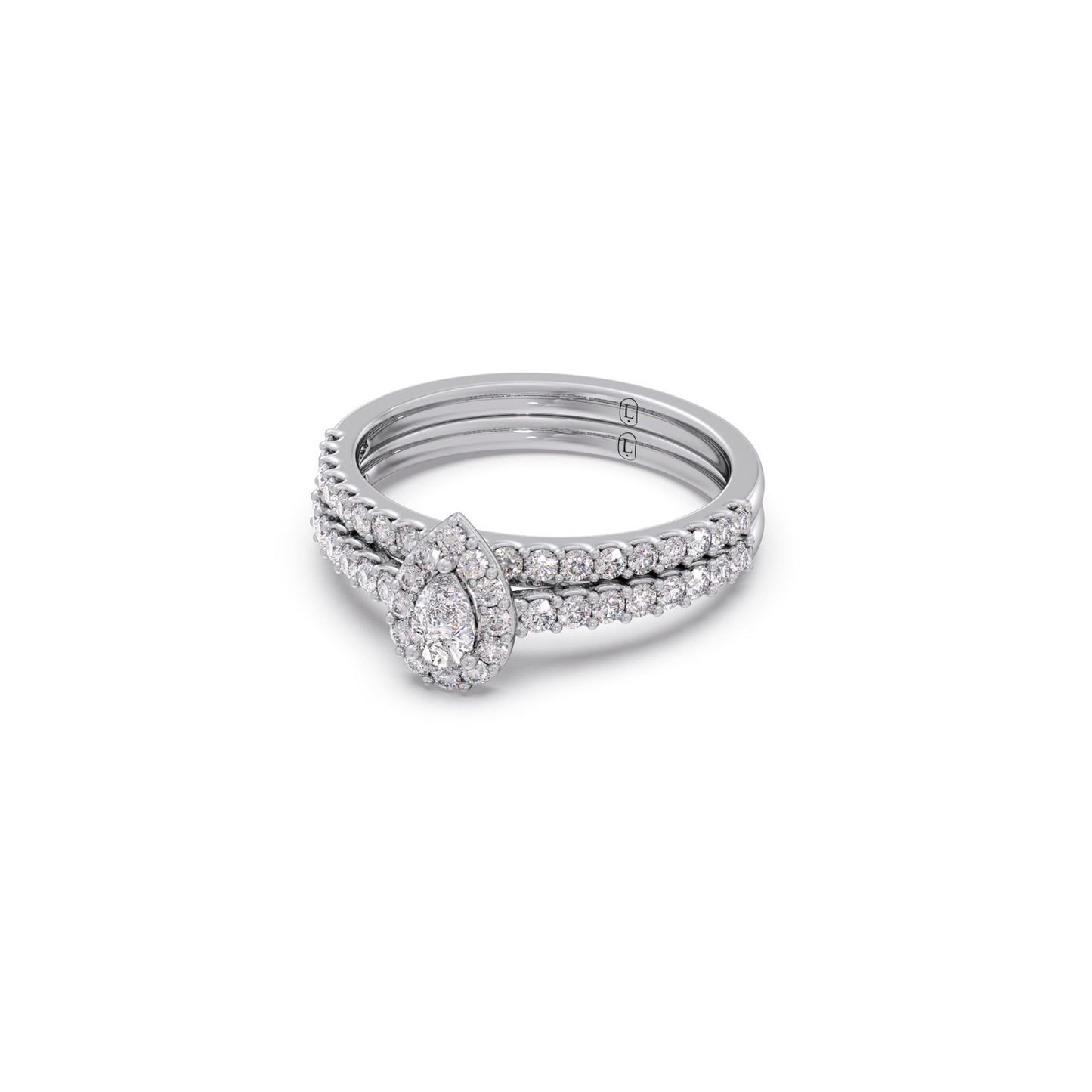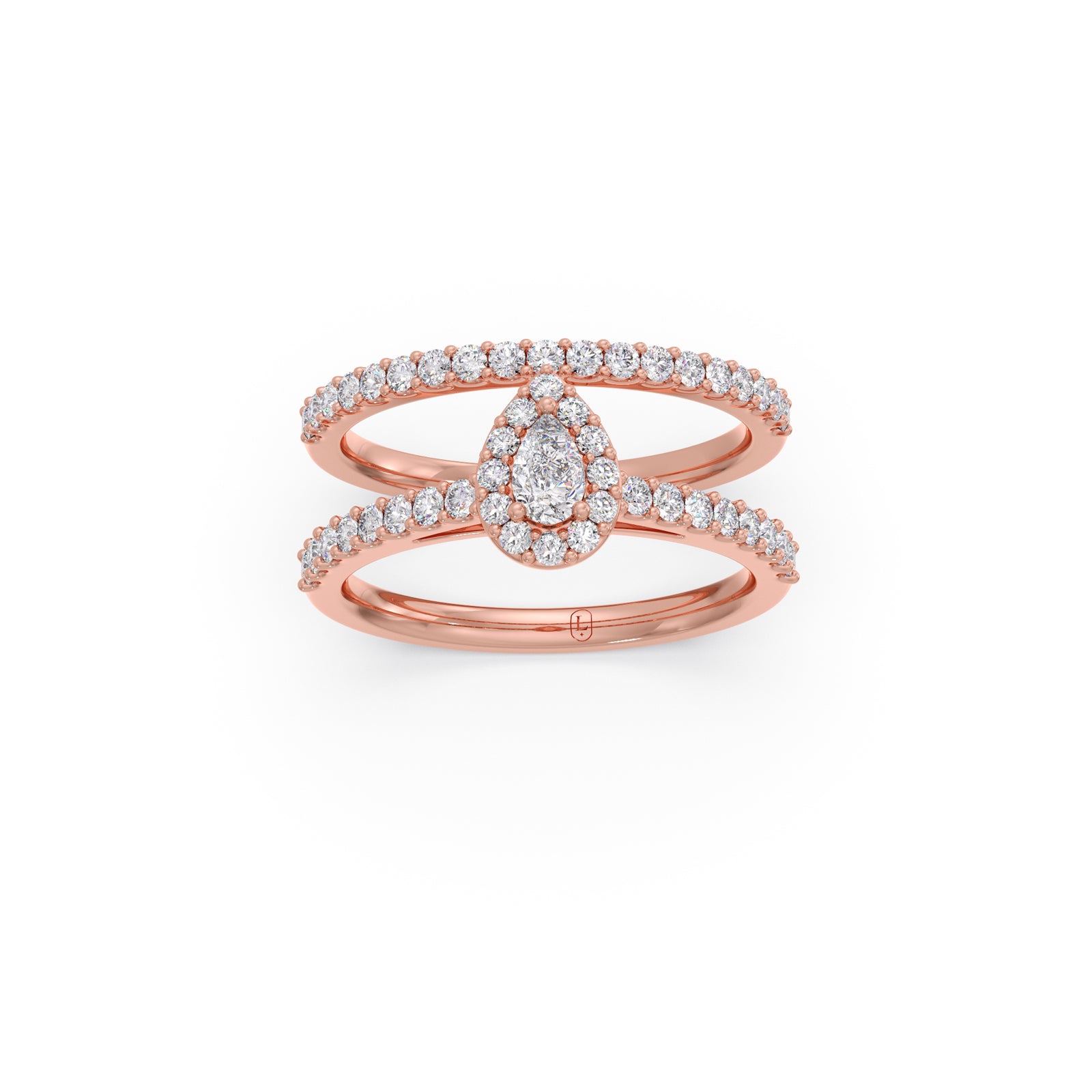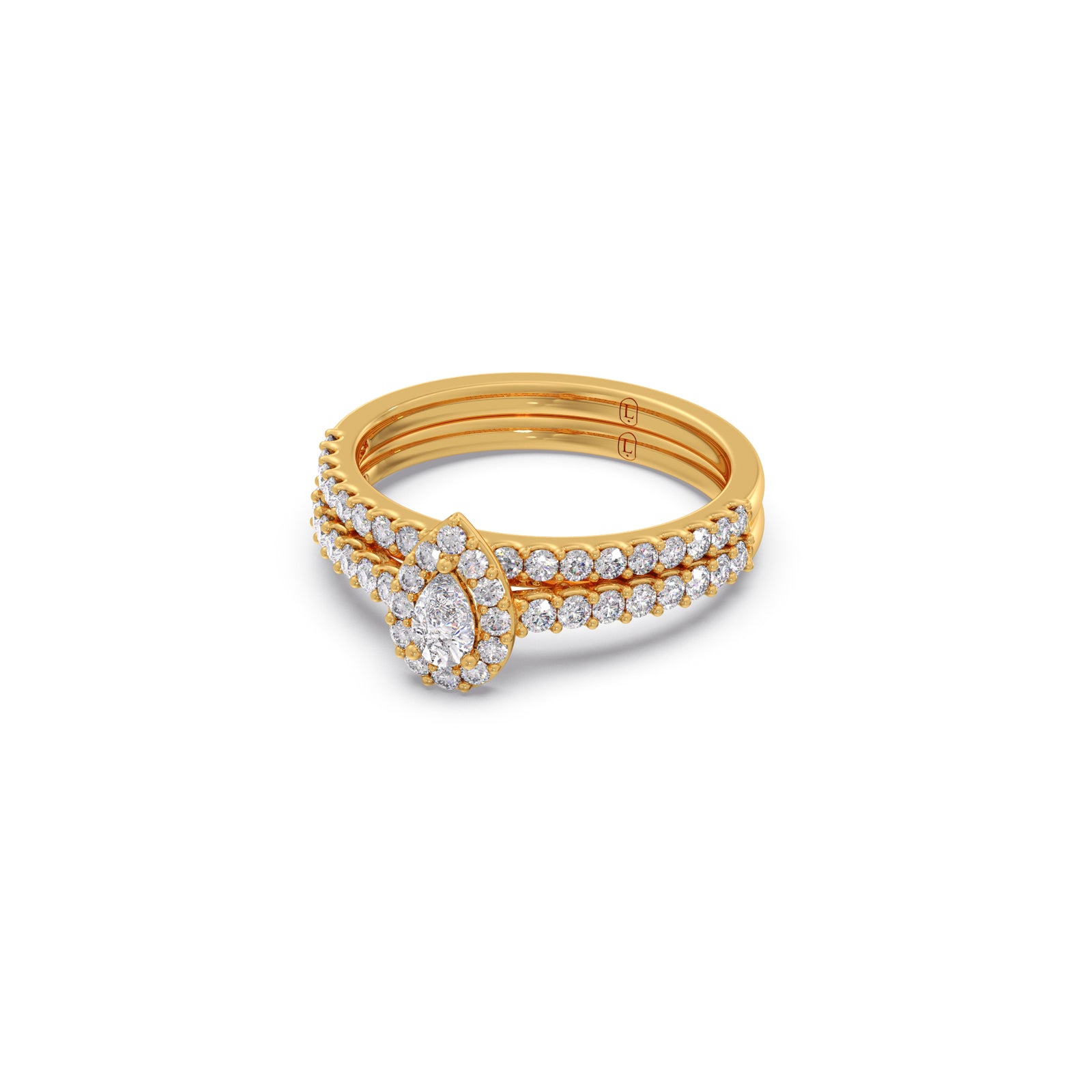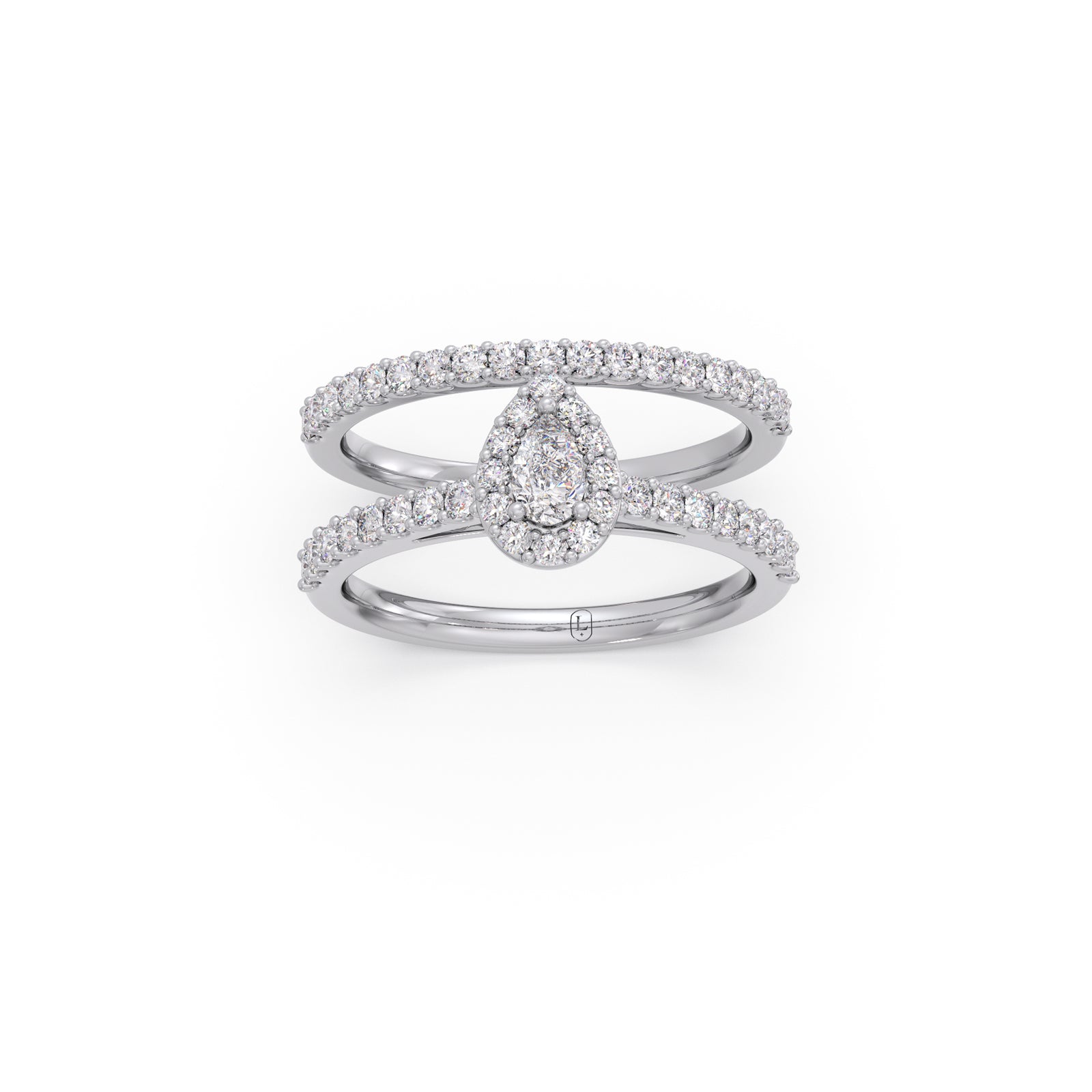 Elevate your stack with this graceful ring featuring a captivating pear-shaped diamond as its focal point. Delicate accents of smaller diamonds enhance its unique silhouette, adding a touch of subtle sparkle. Designed for effortless layering, this ring brings a sophisticated and distinctive charm to any ensemble. A beautiful expression of individual style.