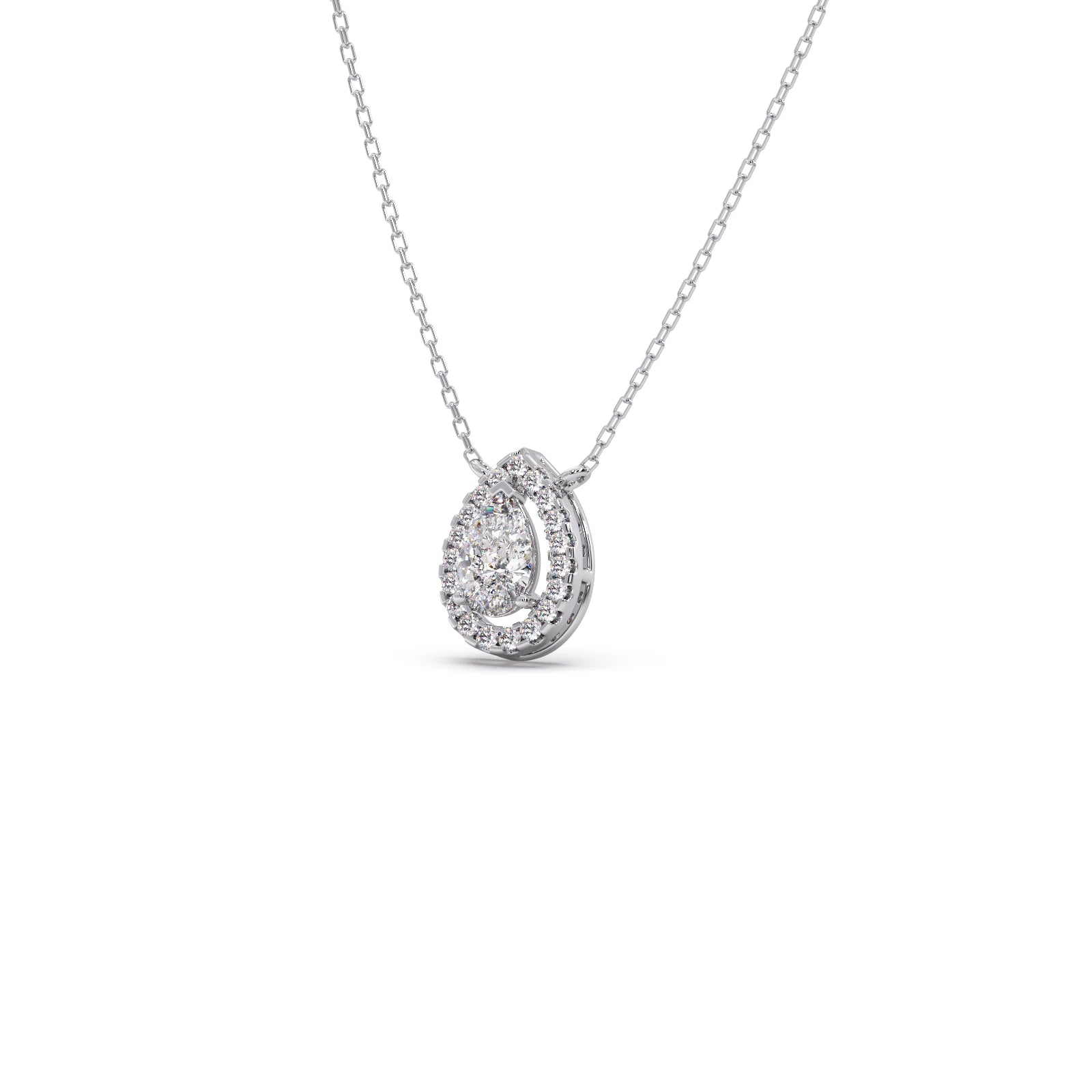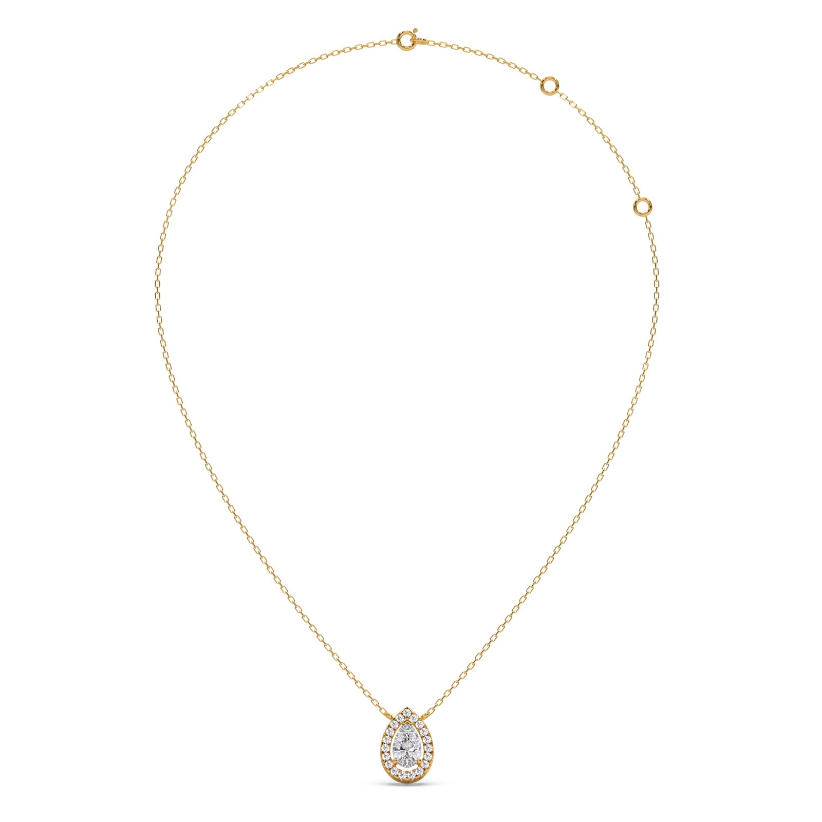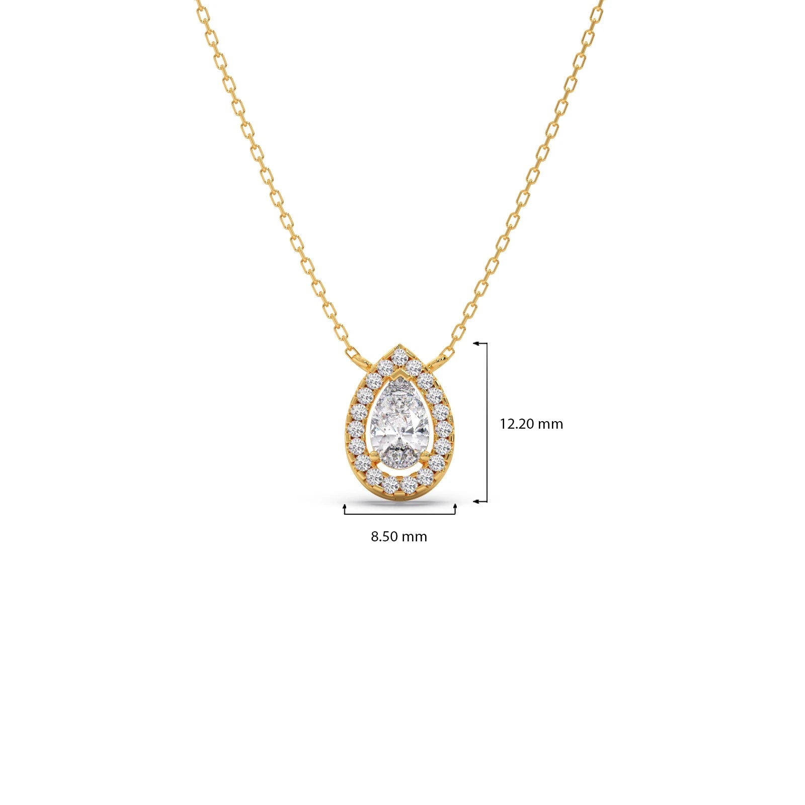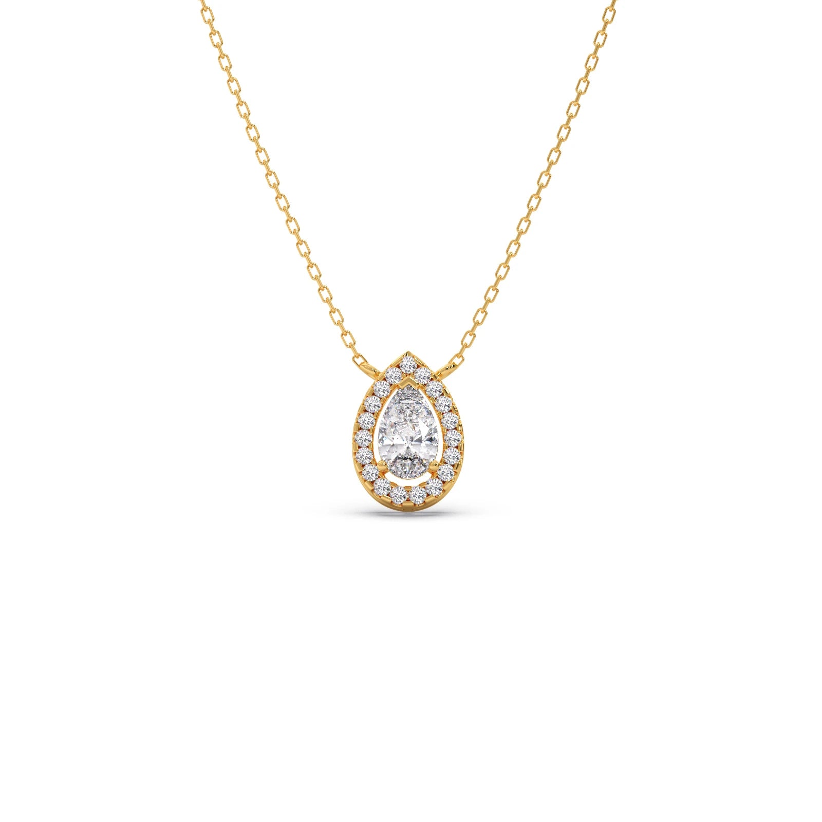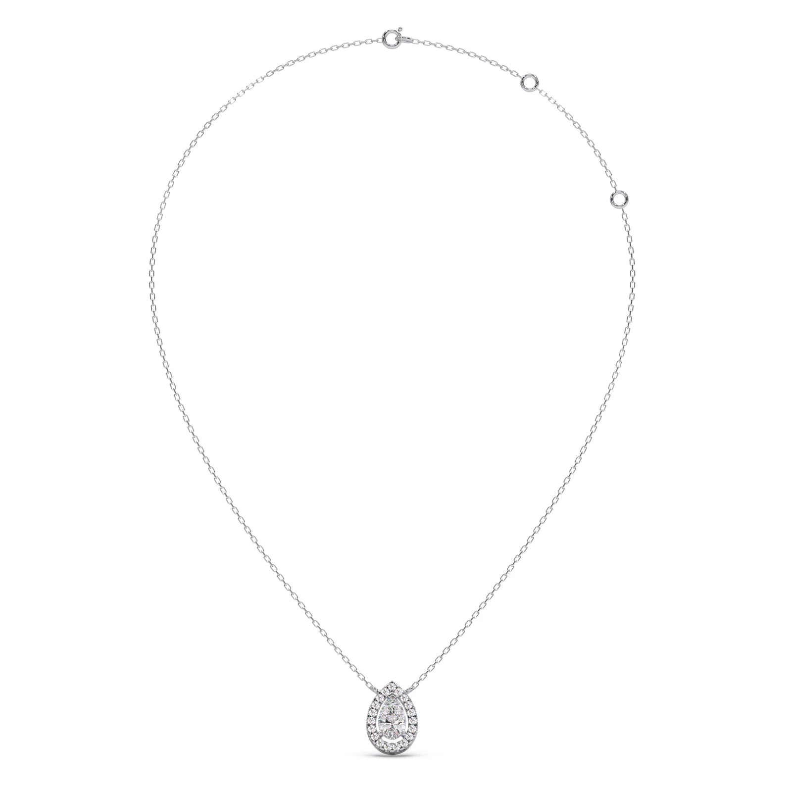 This elegant necklace features a captivating pear-shaped diamond center, encircled by a delicate halo of smaller diamonds. The design offers a classic yet modern aesthetic, perfect for adding a touch of sparkle to any occasion. The pendant hangs gracefully from a fine chain, enhancing its refined beauty.