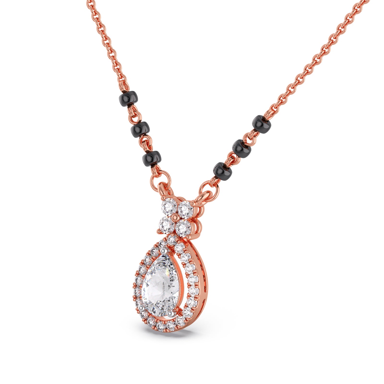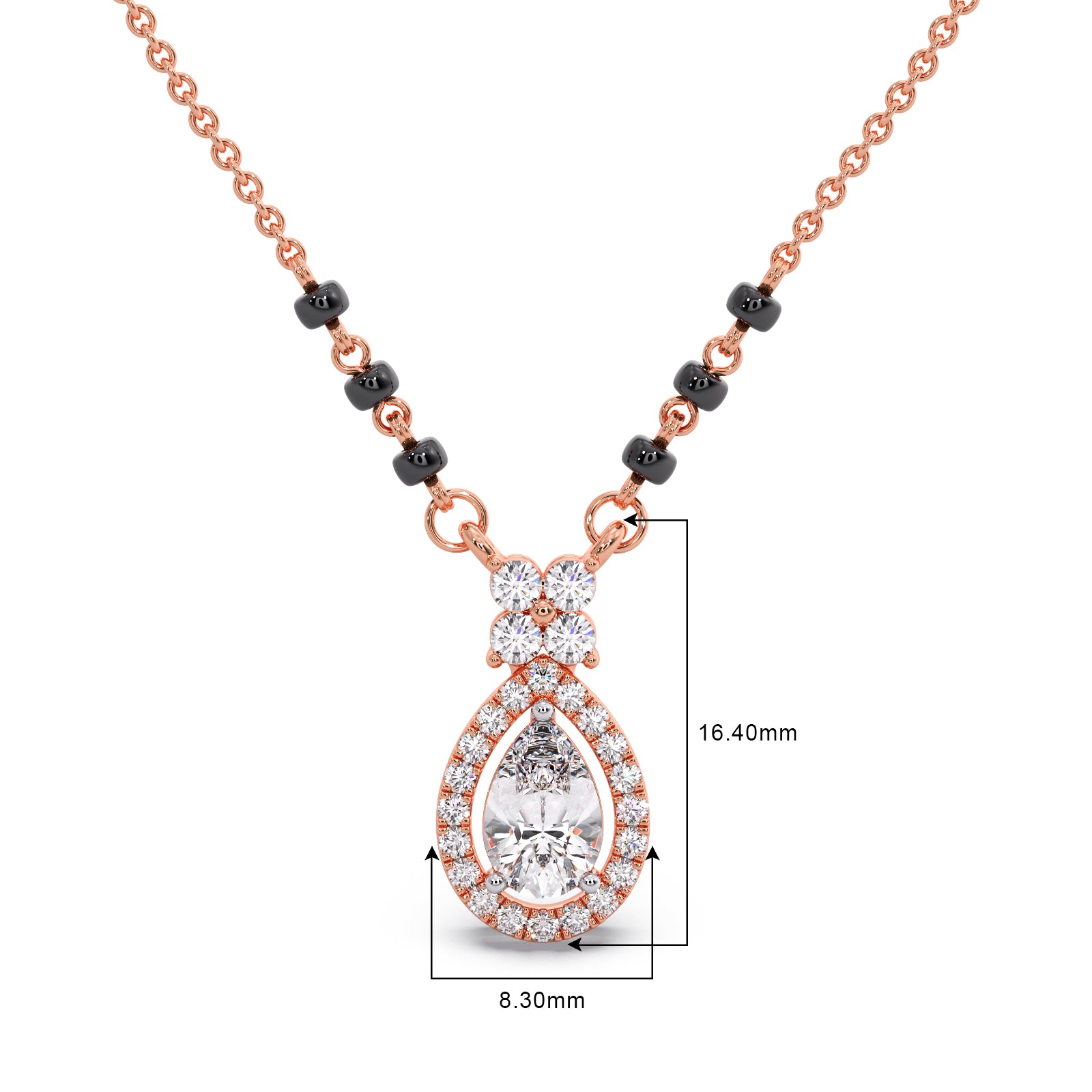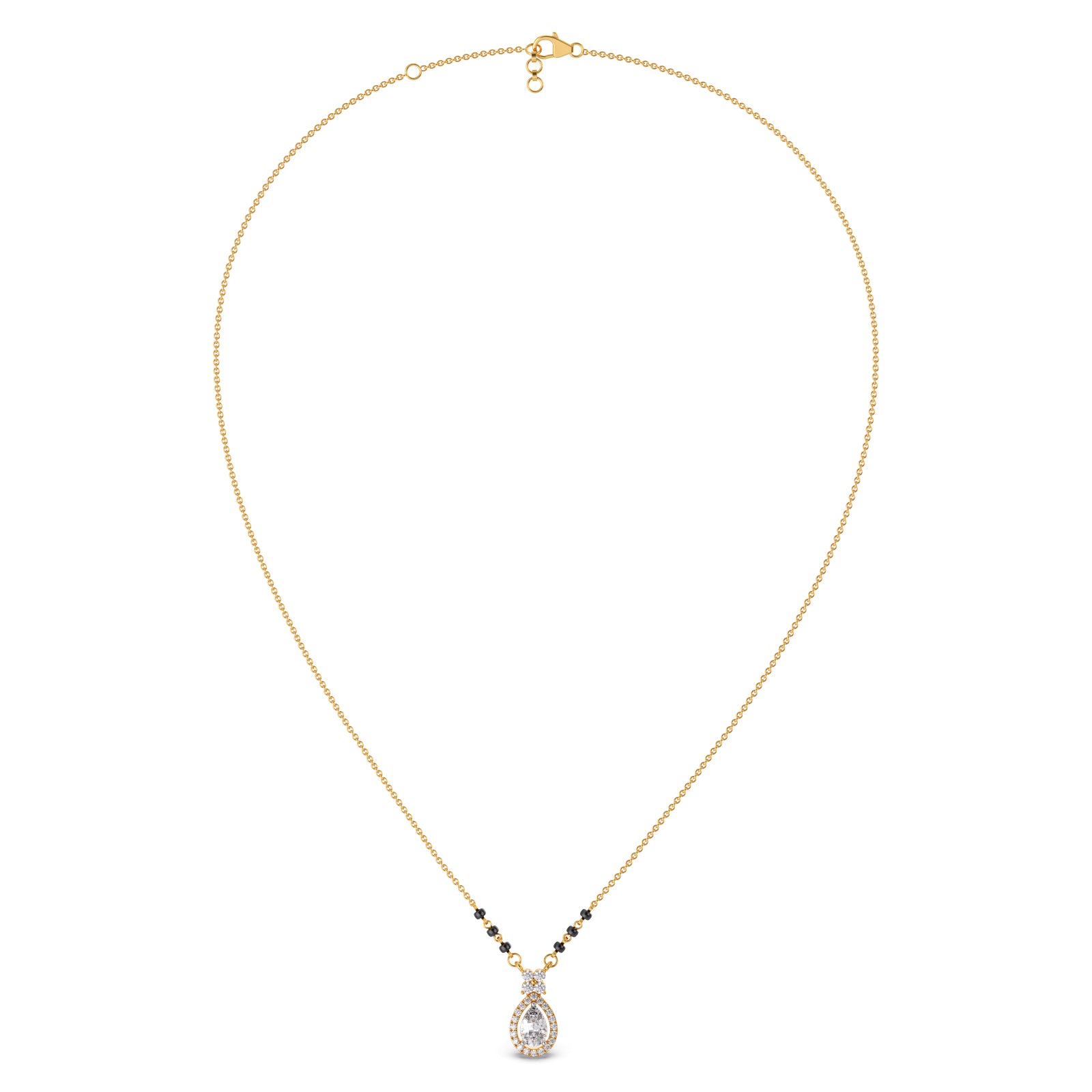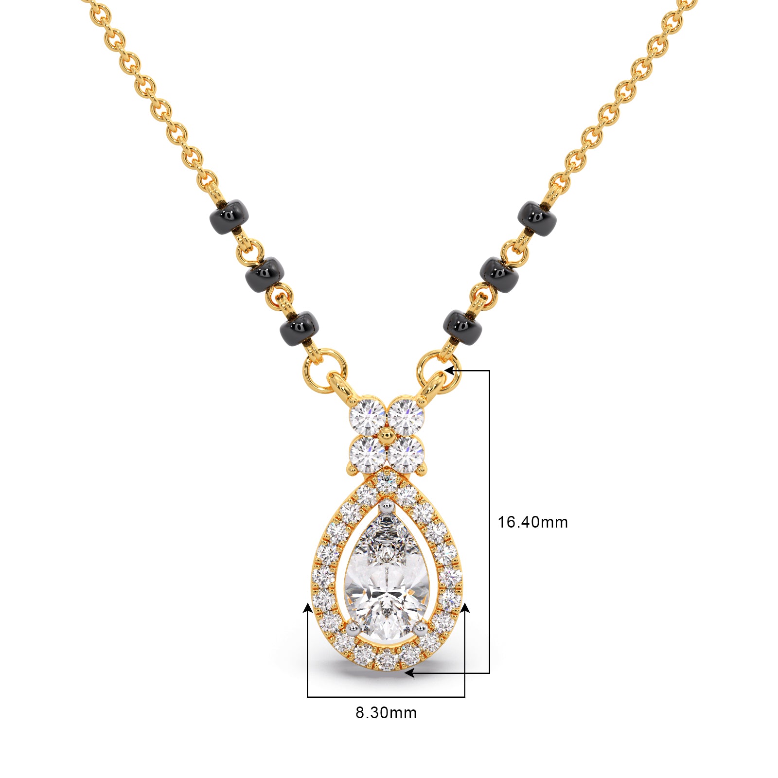 A perfect blend of tradition and elegance, this gold mangalsutra features a pear-shaped diamond centerpiece surrounded by a halo of shimmering diamonds. The delicate floral motif adds charm, while classic black beads symbolize protection and prosperity. Ideal for everyday wear and special occasions, this timeless piece is a must-have for modern brides.