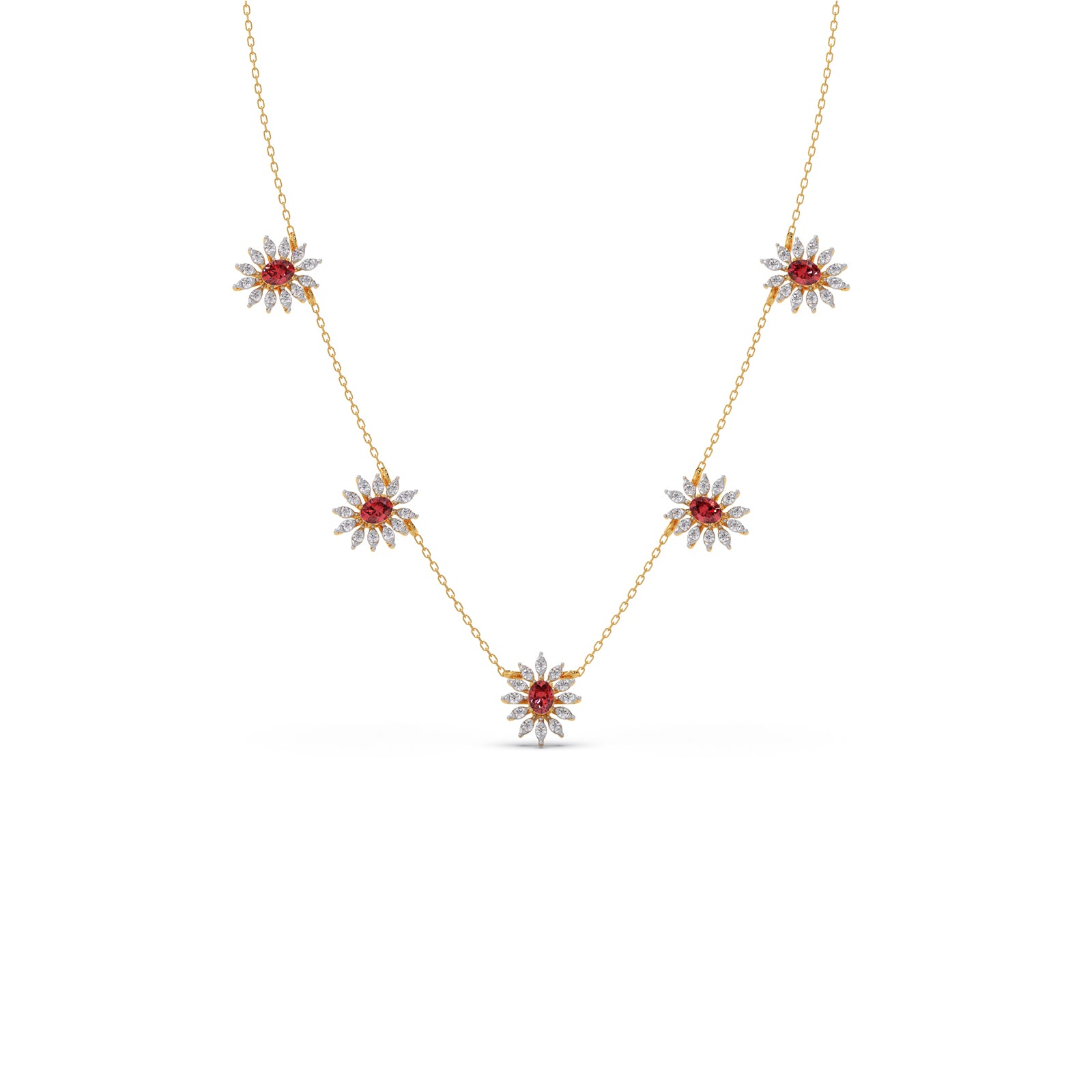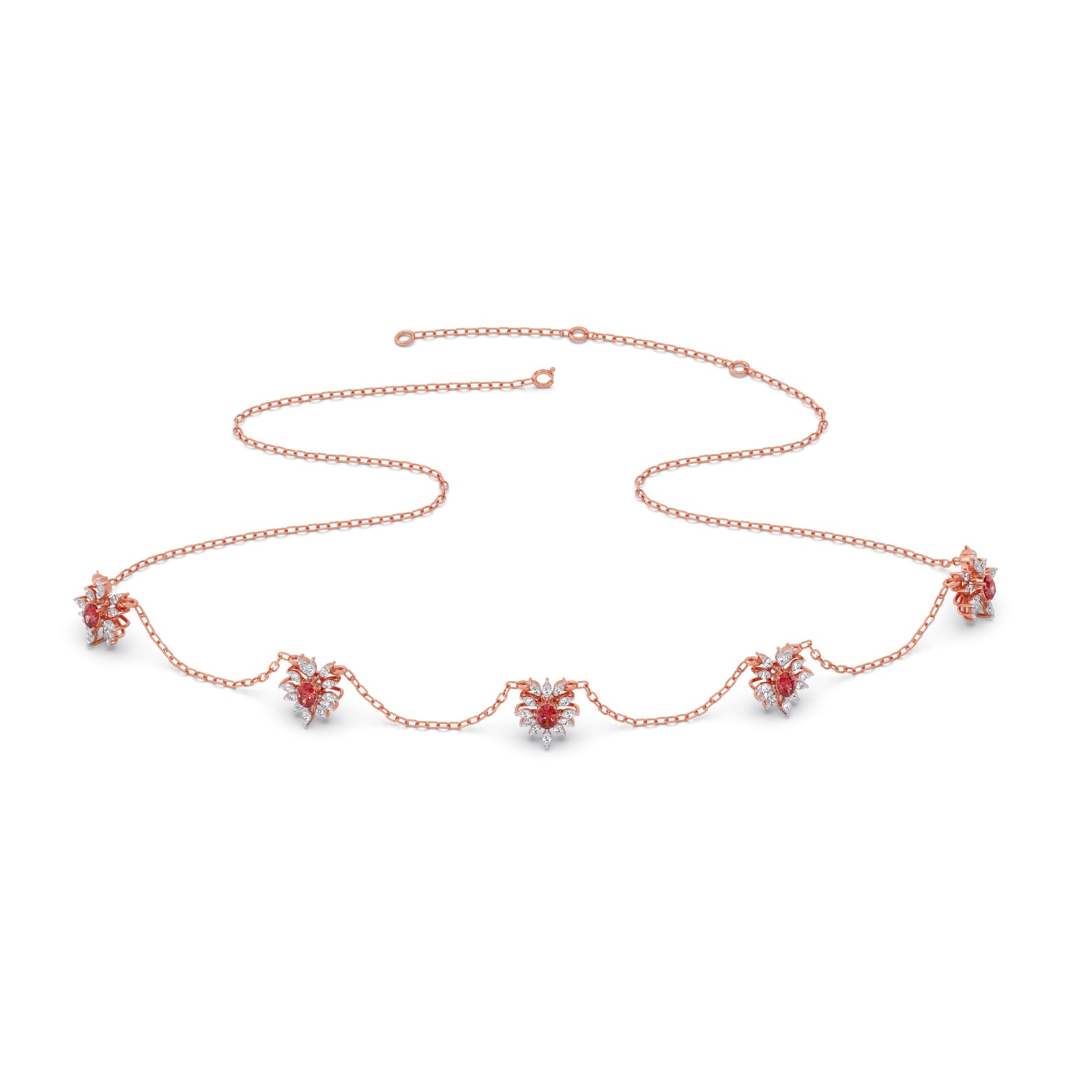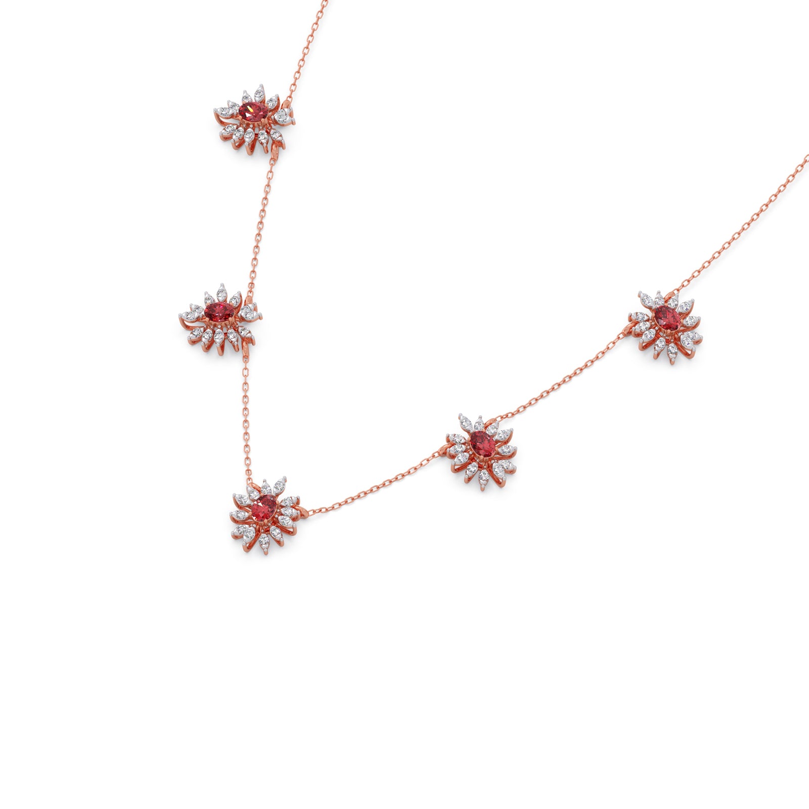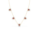 This necklace features a classic, floral-inspired aesthetic, combining the warmth of gold with the vibrant contrast of pink colour stones and round diamonds. Their compact, symmetrical design makes them versatile enough for both formal gala wear and sophisticated daytime ensembles.