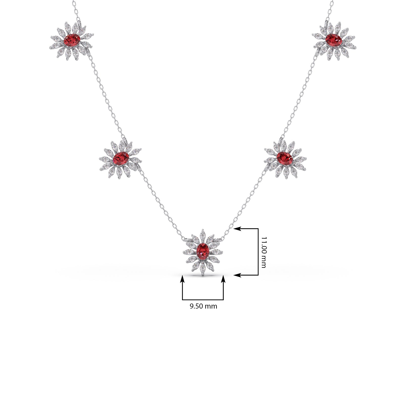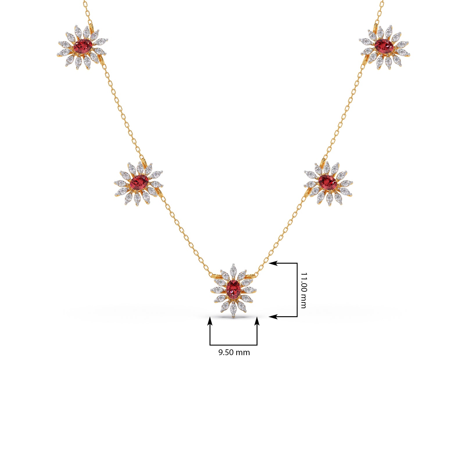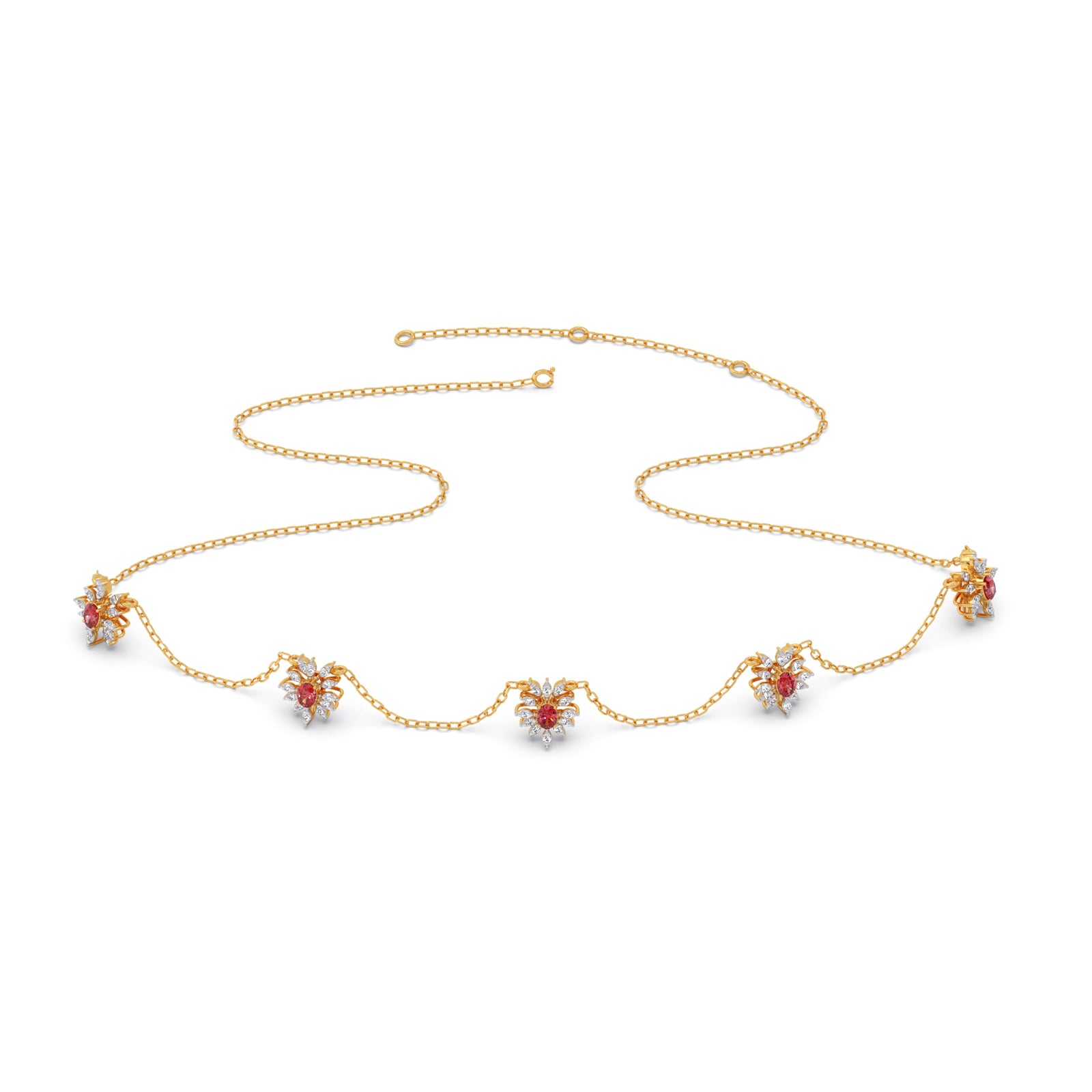 This necklace features a classic, floral-inspired aesthetic, combining the warmth of gold with the vibrant contrast of pink colour stones and round diamonds. Their compact, symmetrical design makes them versatile enough for both formal gala wear and sophisticated daytime ensembles.