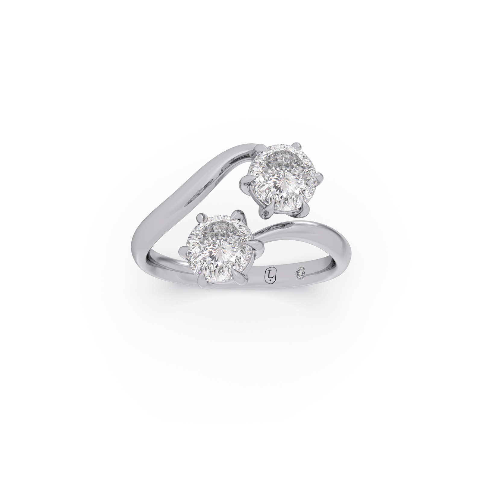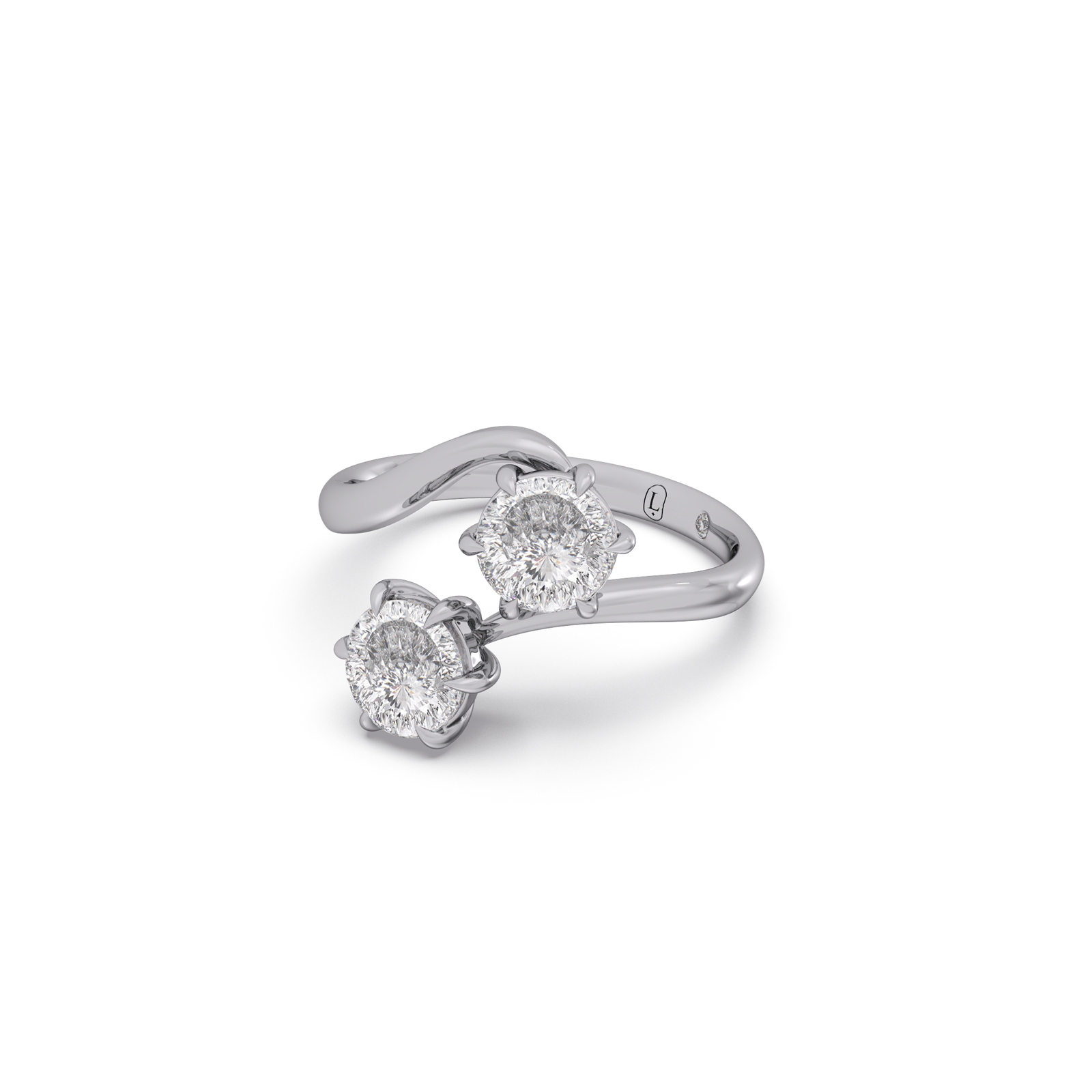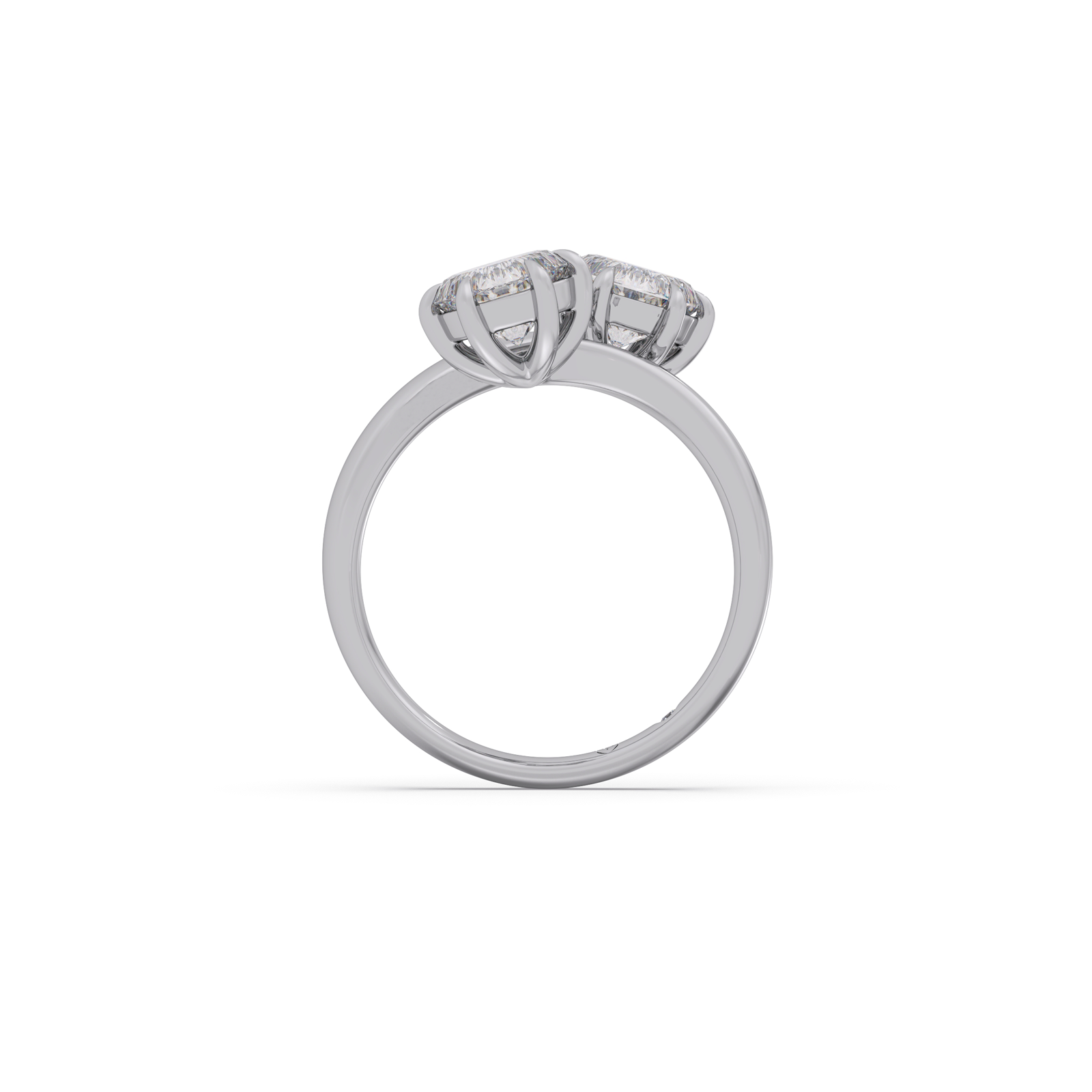 Two 1 ct. Portuguese Cut Solitaires sit in graceful balance, reflecting the harmony of two distinct souls. Set in an elegant Toi et Moi design, this ring captures connection and dual brilliance. Finished with our signature 0.008 ct. Round Diamond—a quiet symbol of lasting union.