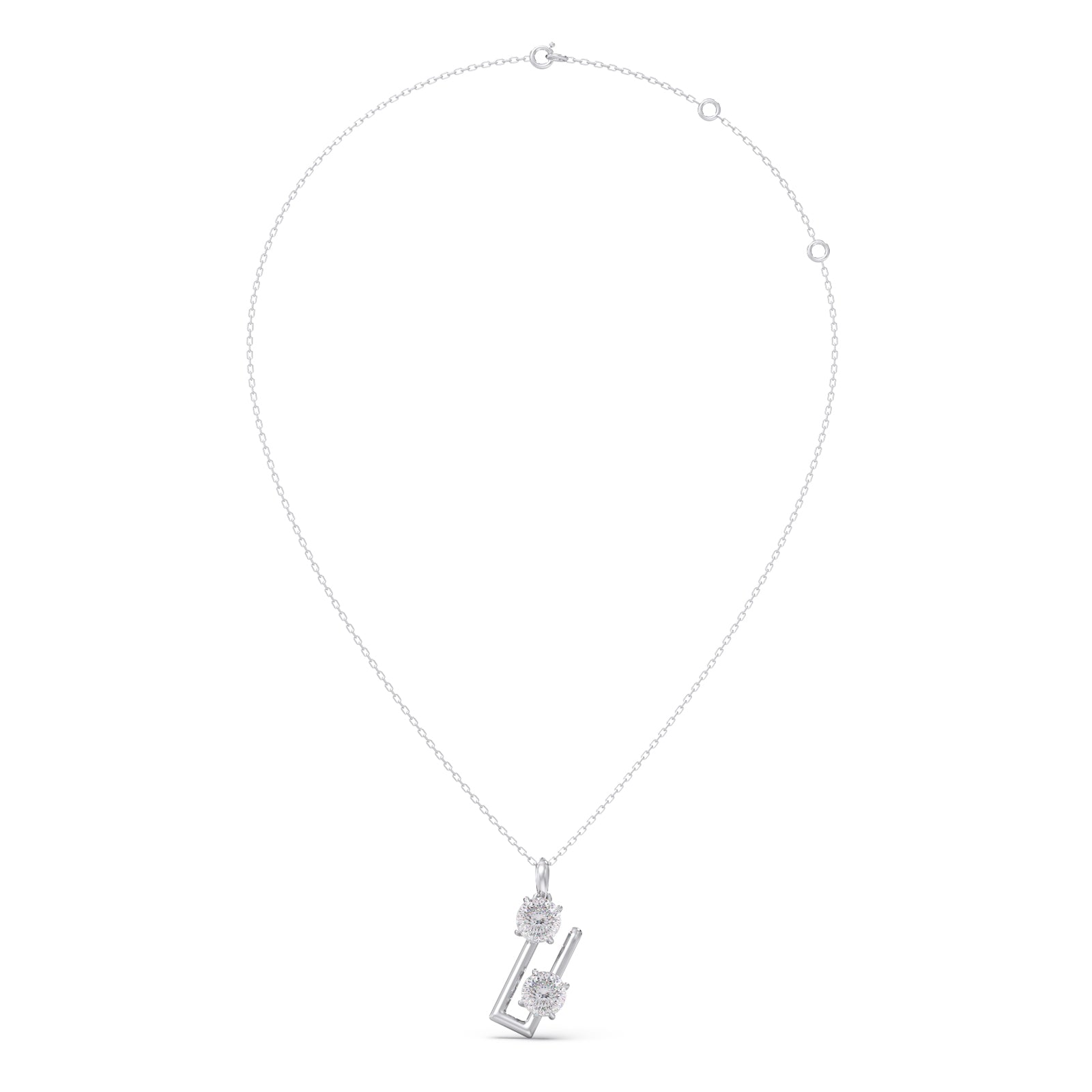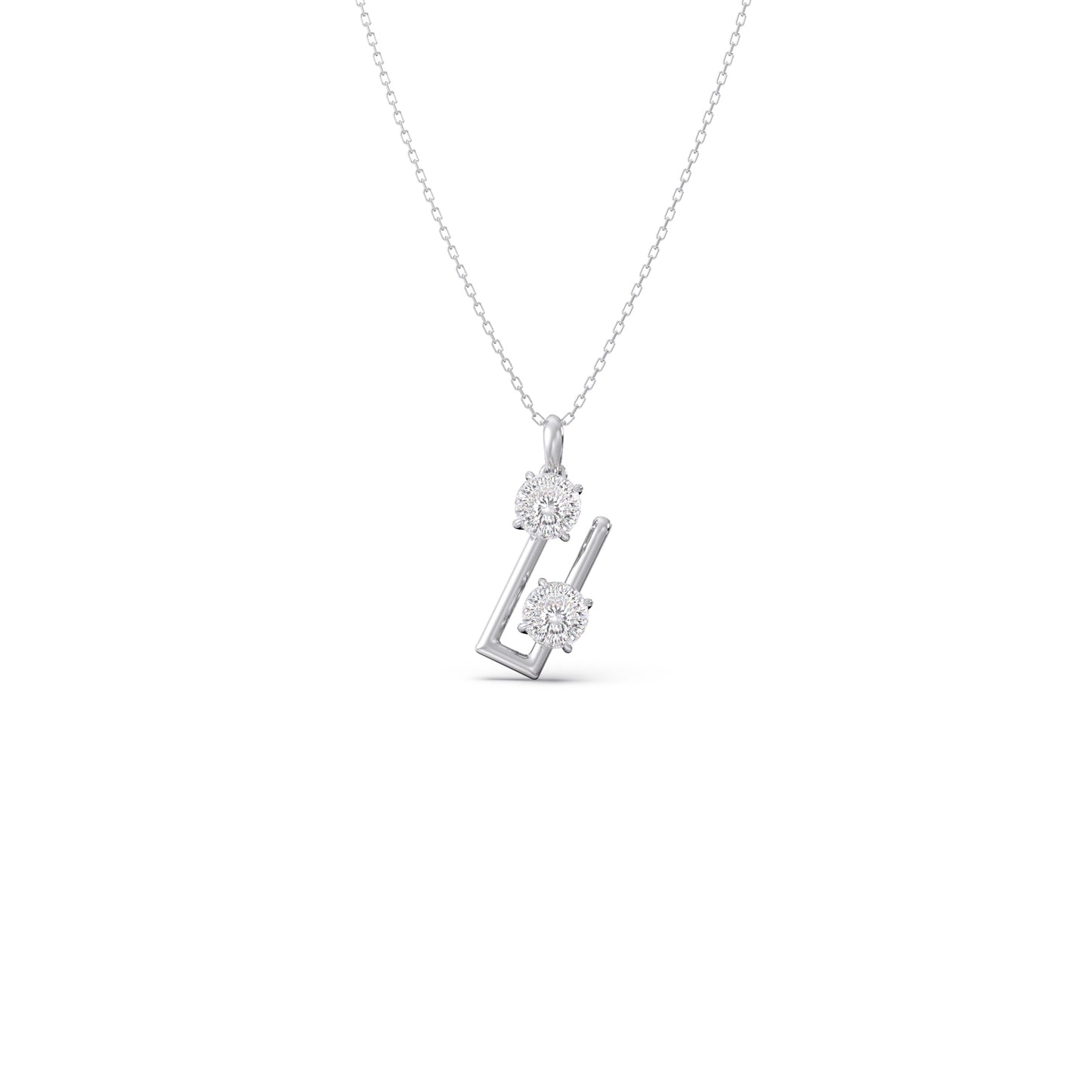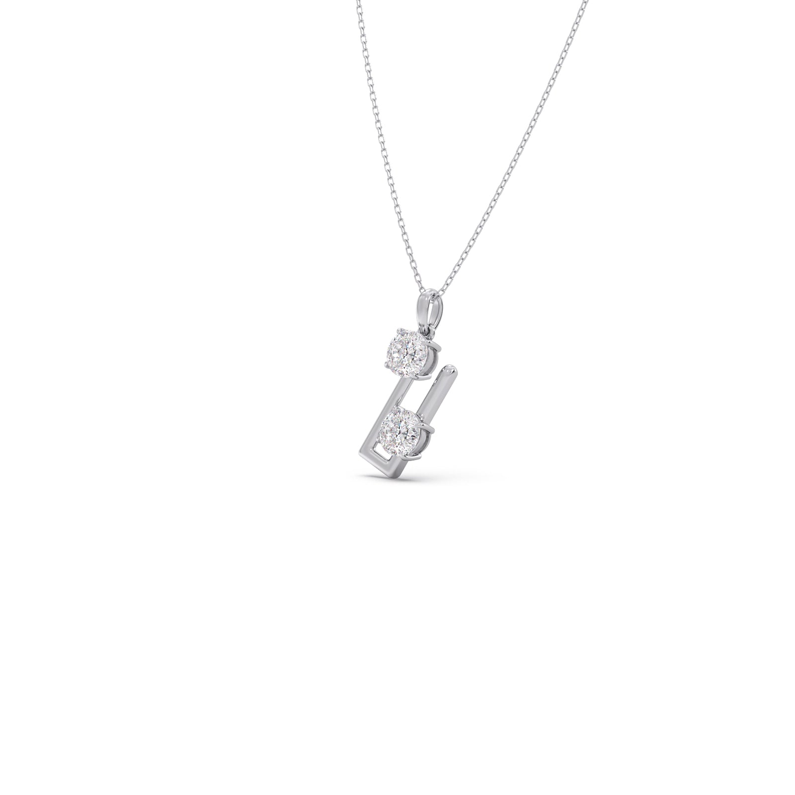 Two 1 ct. Portuguese Cut Solitaires are suspended in perfect harmony within a tilted U-shaped frame. Bold yet fluid, the design captures a sense of movement and balance. Finished with our signature 0.008 ct. Round Diamond—a subtle detail that anchors Lucira’s enduring craftsmanship.