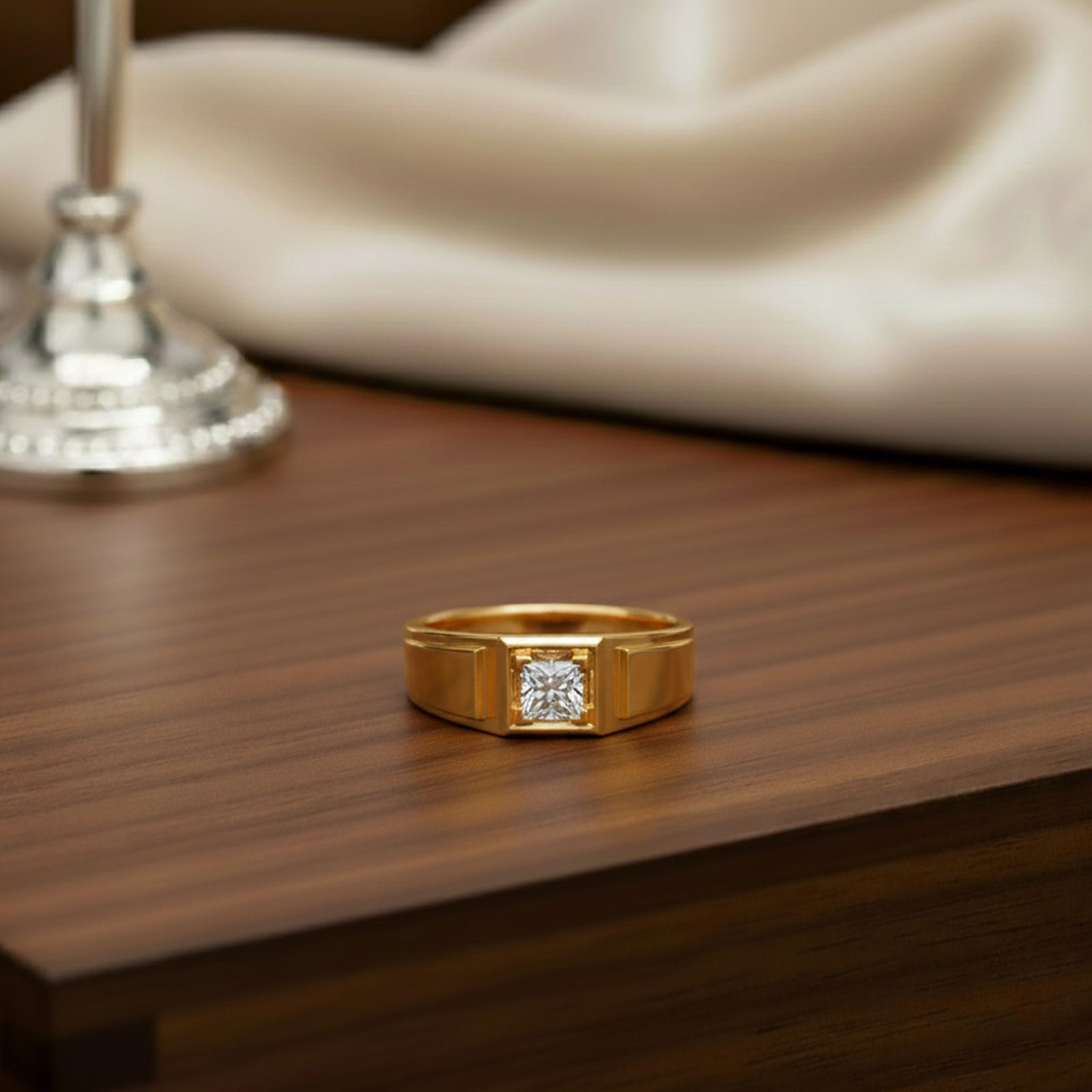 This men's classic ring features a princess-cut diamond, set in a timeless design. The ring offers a sophisticated and understated elegance, perfect for everyday wear or special occasions. Its clean lines and focus on the diamond create a refined masculine aesthetic.