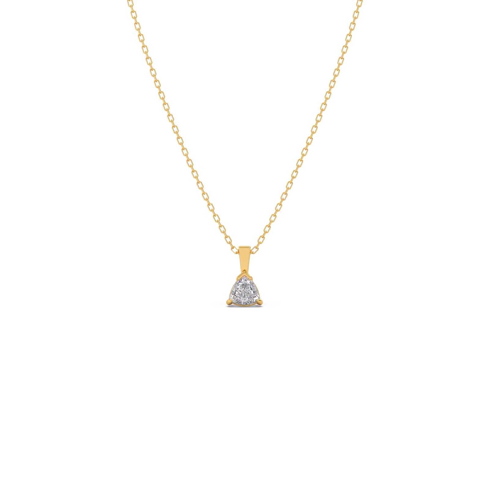 This elegant pendant necklace showcases a uniquely shaped trillion-cut solitaire diamond held securely in a classic prong setting. The three-sided cut offers a modern and brilliant sparkle. Suspended from a delicate chain, this pendant adds a touch of contemporary sophistication to any neckline, perfect for both everyday wear and special occasions.
