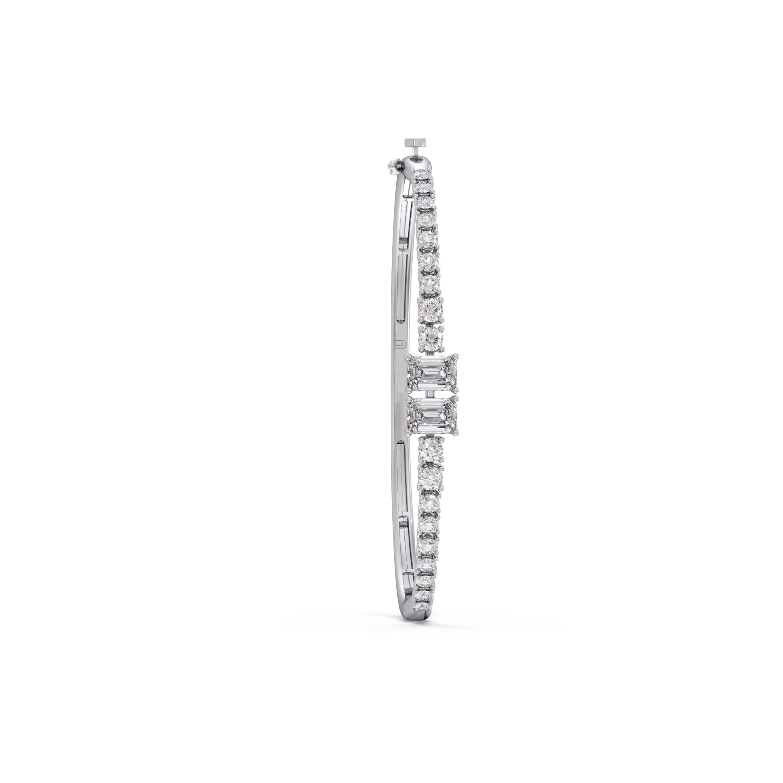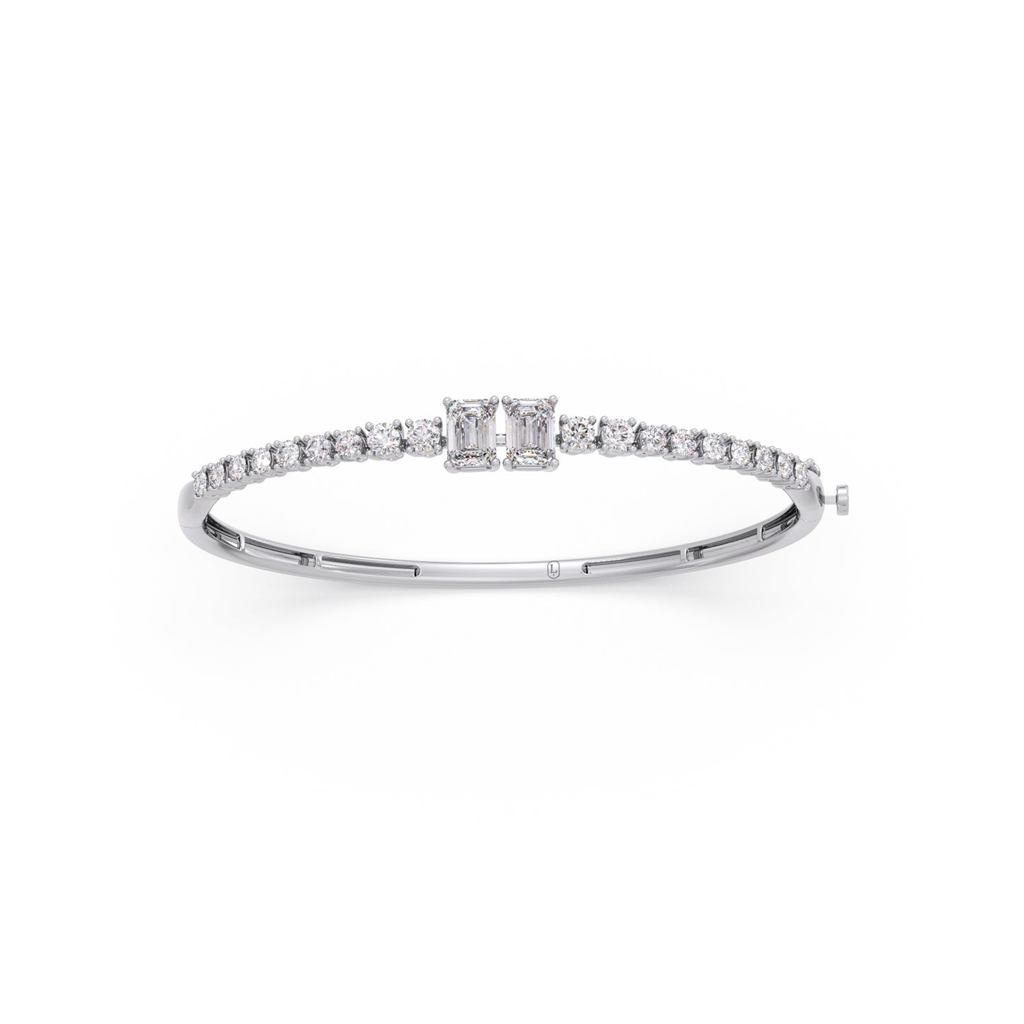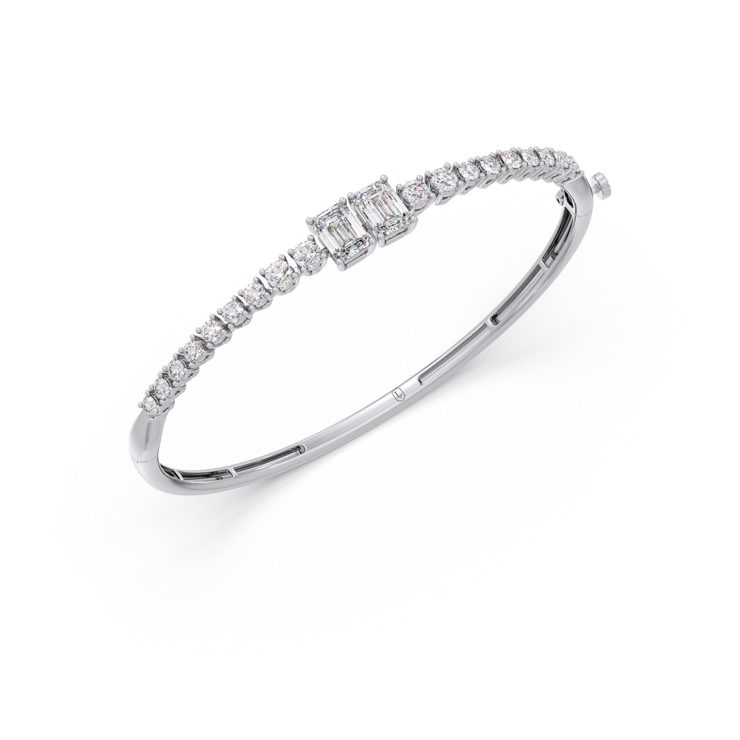 This stunning bracelet features a captivating combination of radiant-cut emeralds and brilliant round diamonds. The vibrant green of the emeralds beautifully contrasts with the dazzling sparkle of the diamonds, creating a truly eye-catching design. Elegant and sophisticated, this bracelet adds a touch of luxurious color and timeless glamour to any wrist.
