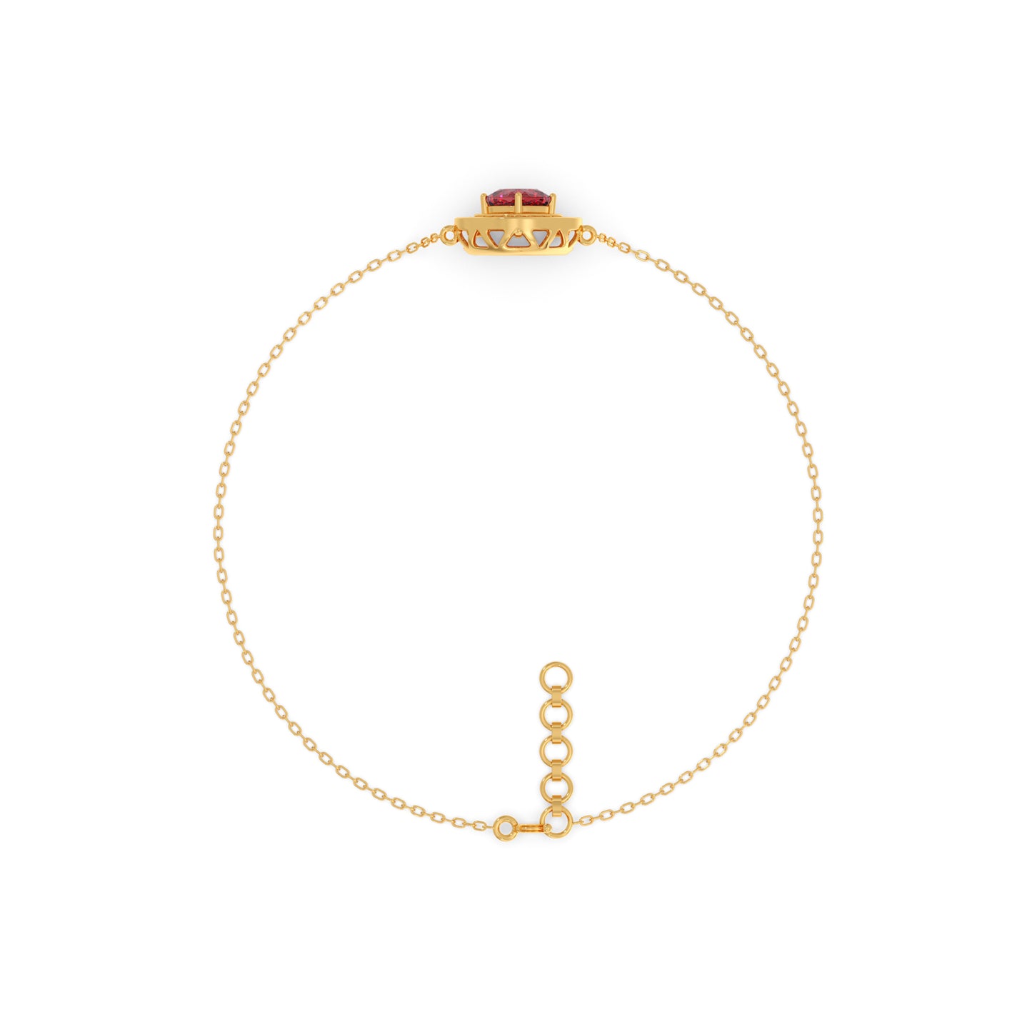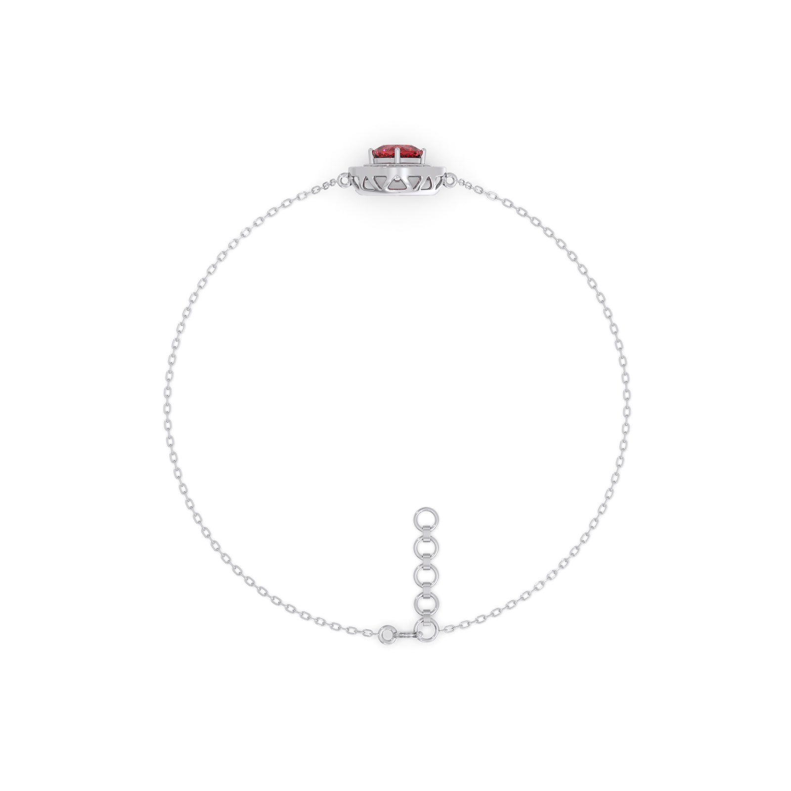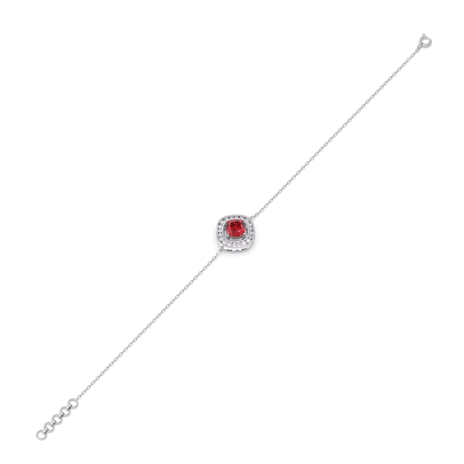 Ignite your wrist with the Red Cushion Halo Bracelet. A vibrant, cushion-cut fancy stone is dramatically framed by a brilliant round diamond halo, setting off the stone's fiery color. Suspended on a delicate chain, this piece is pure, passionate elegance.