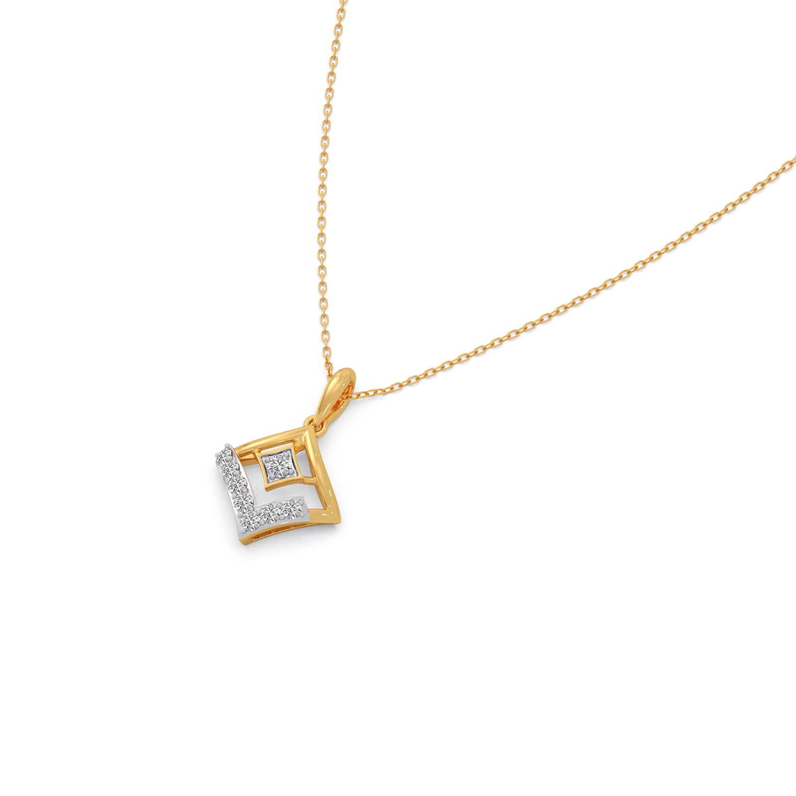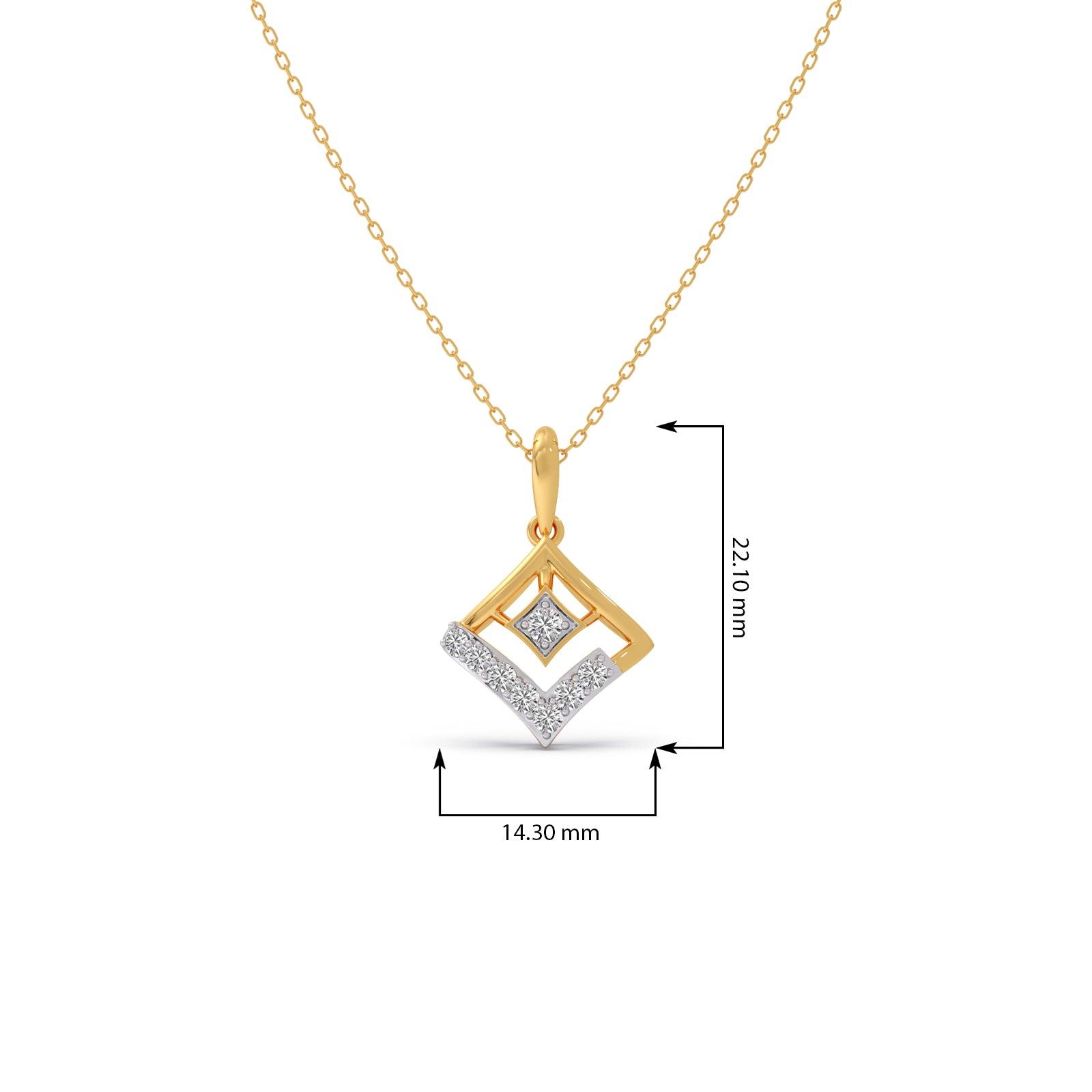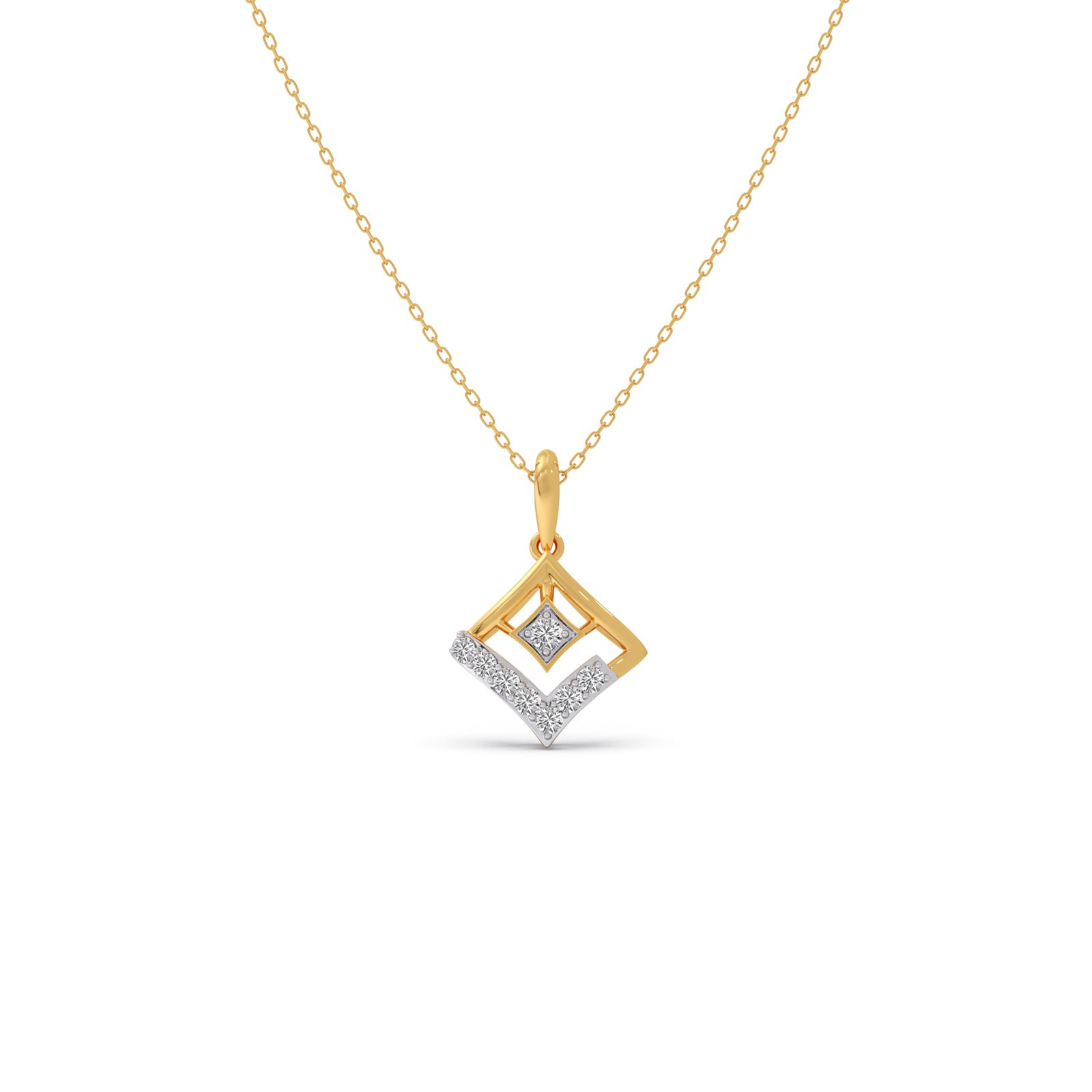 These Rhombus Sparkle Diamond Chain Pendant features a geometric rhombus shape design, adorned with classic round diamonds. This pendant offers a sophisticated look with delicate gold chain,that is comfortable enough for daily wear or any ocassions wear.
