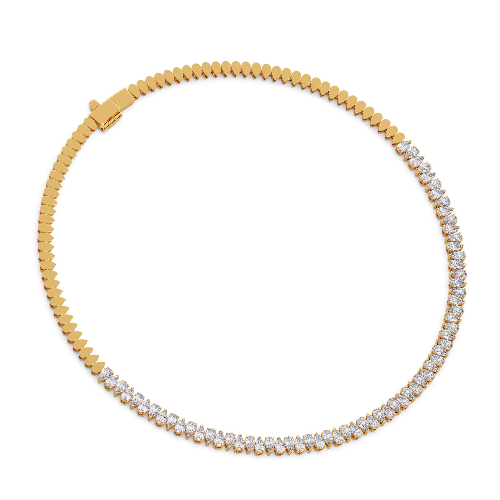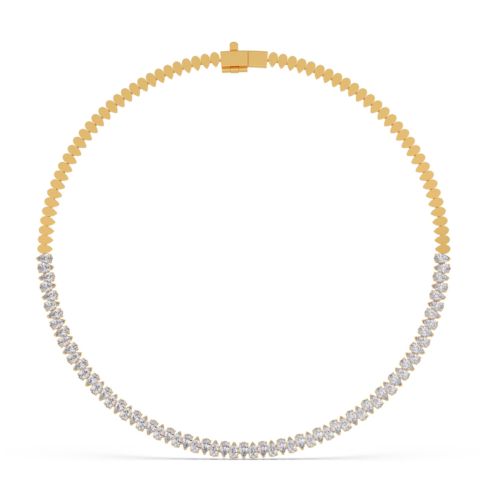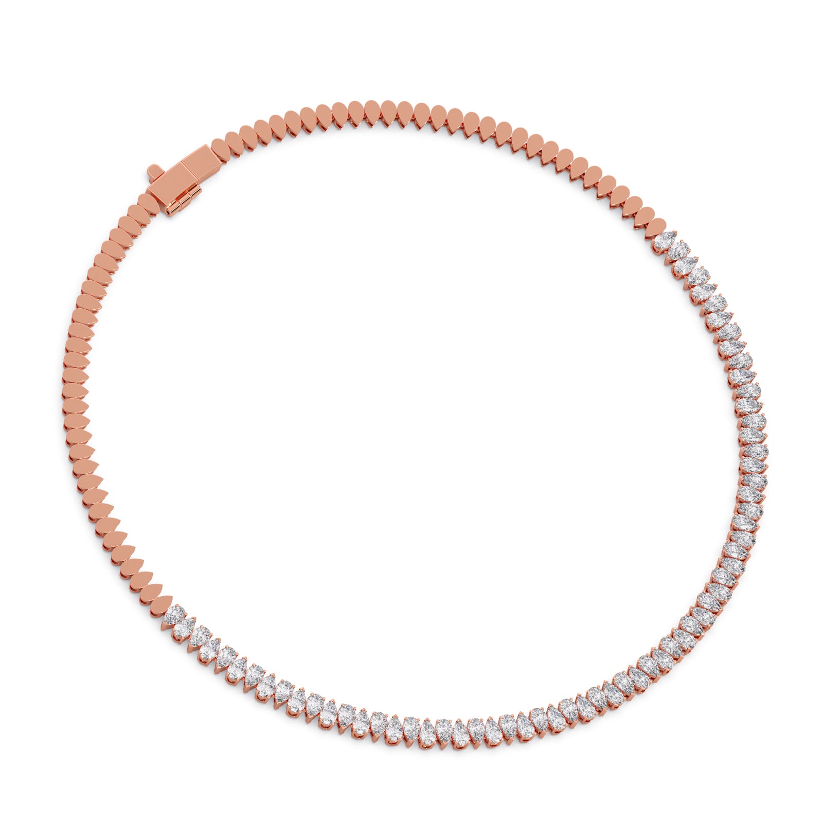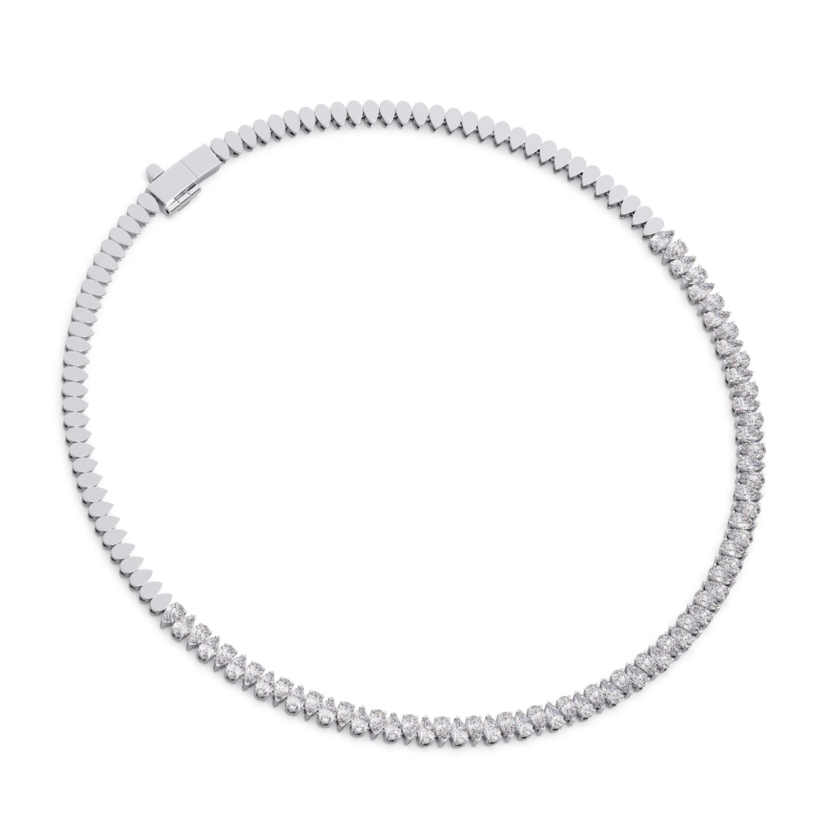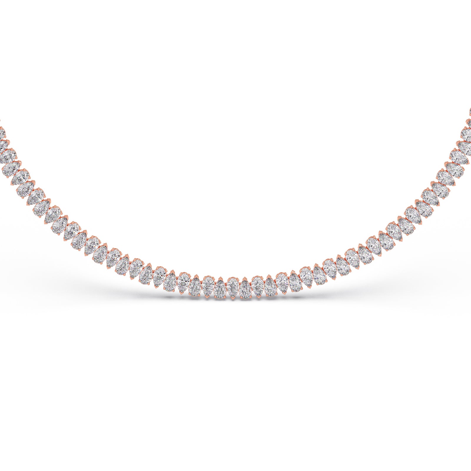 Experience the captivating rhythm of light with our "Rhythmic Radiance" necklace. Featuring a mesmerizing sequence of lustrous pear-cut diamonds, this piece creates a graceful flow of unparalleled sparkle. Each diamond is expertly set to maximize its brilliance, making it an exquisite statement of elegance and allure for any occasion.