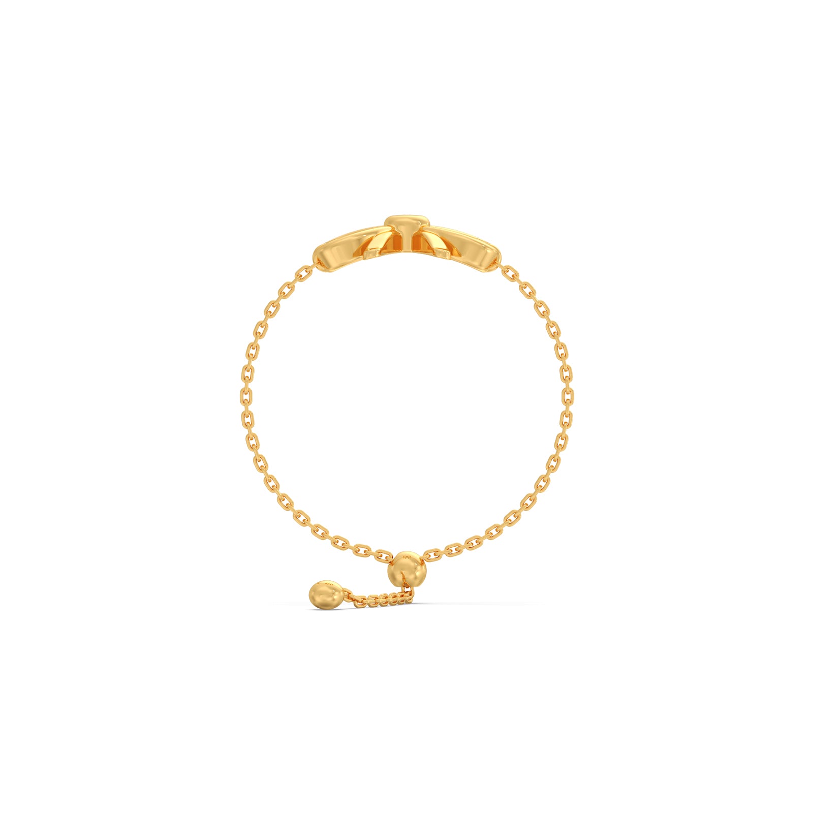 This plain gold ring features a Ribbon Bow in hollow-cut loop at center of ring connected with adjustable bolo flexi chain. This ring represents the delicate lightweight and comfortable for daily wear.