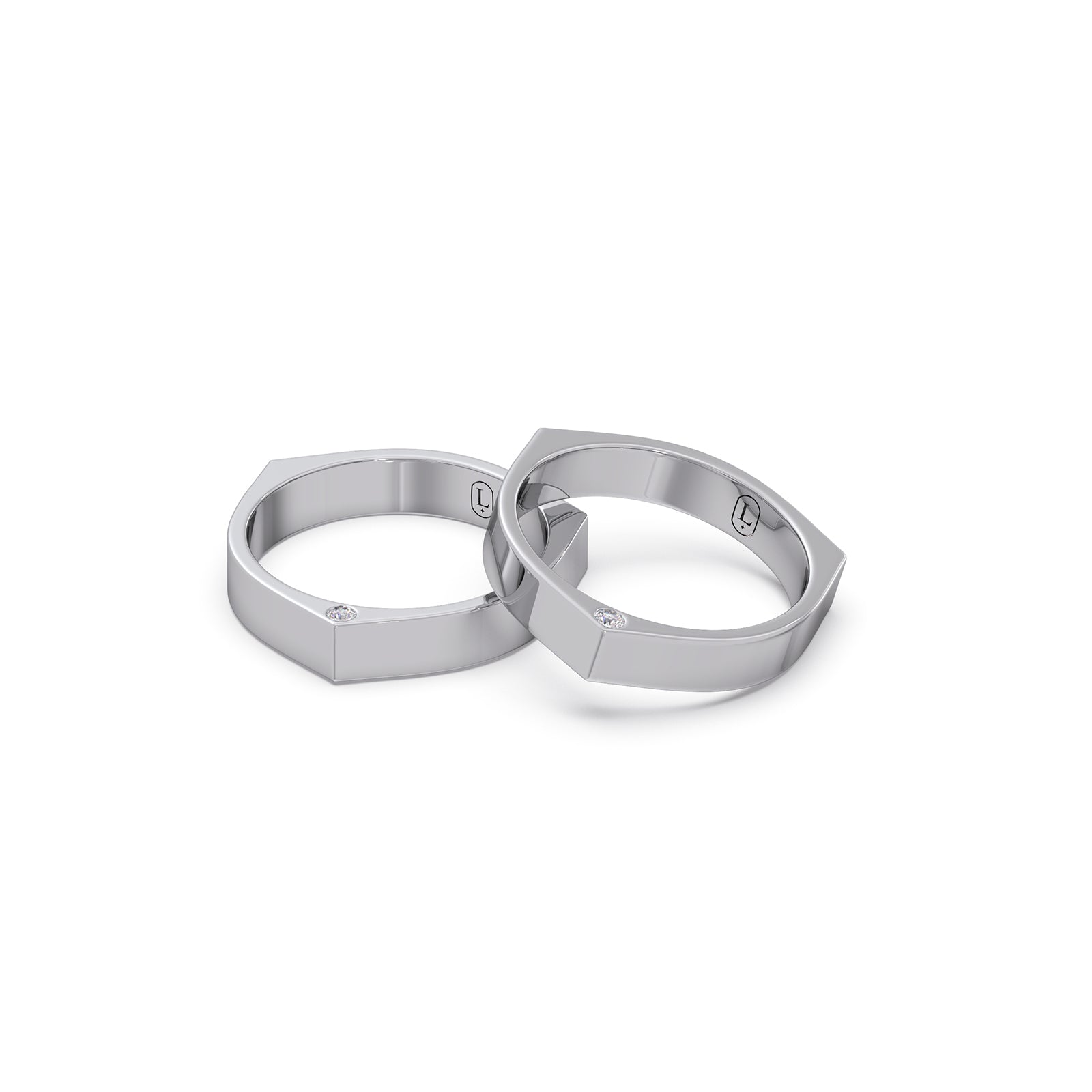 These Rivet Platinum Couple Band features a unique architectural or modern minimalist design, crafted in classic round diamond. Their delicate size and sophisticated sparkle make them suitable for both everyday casual wear and formal attire.