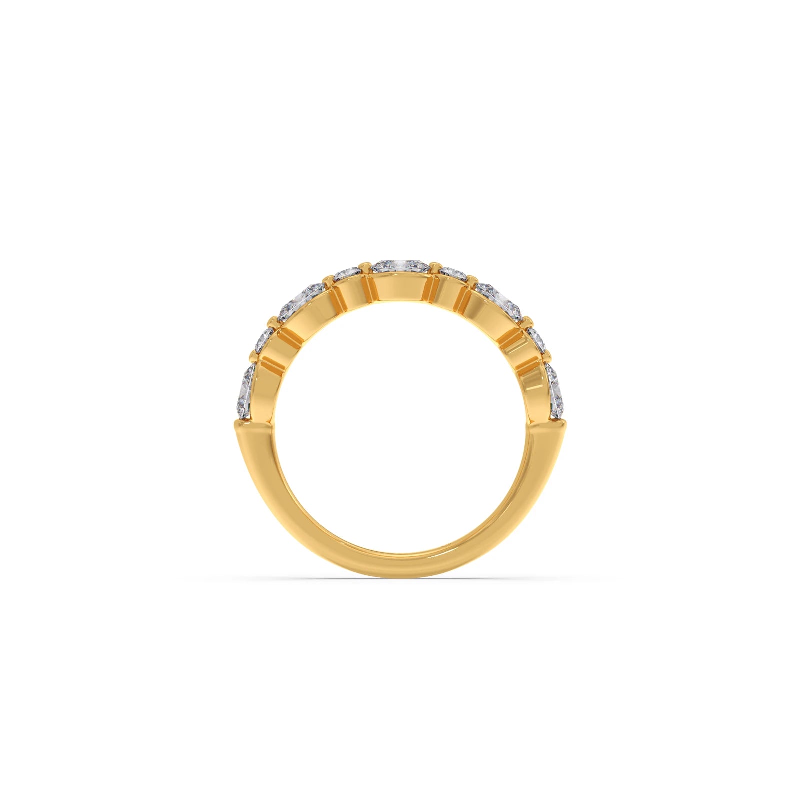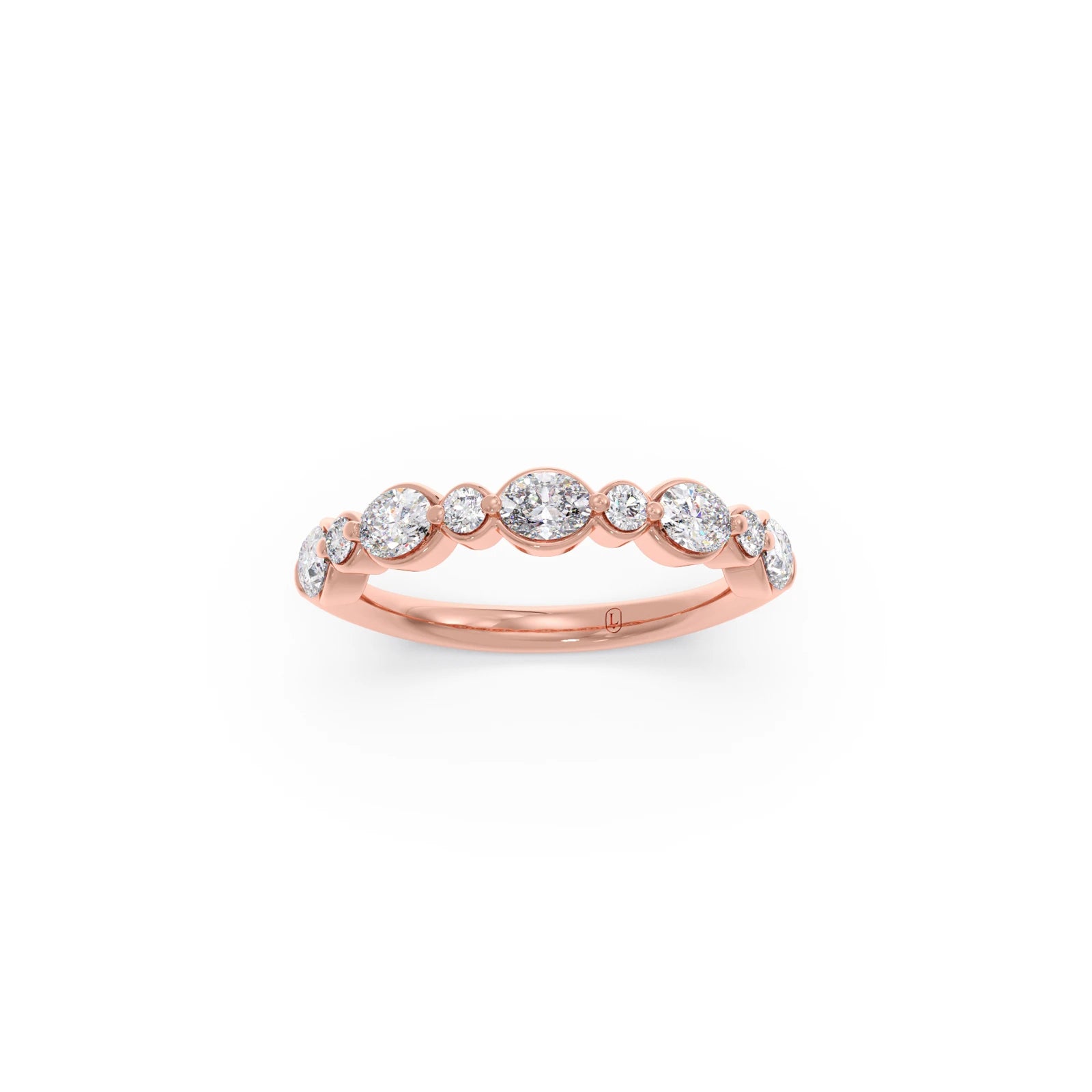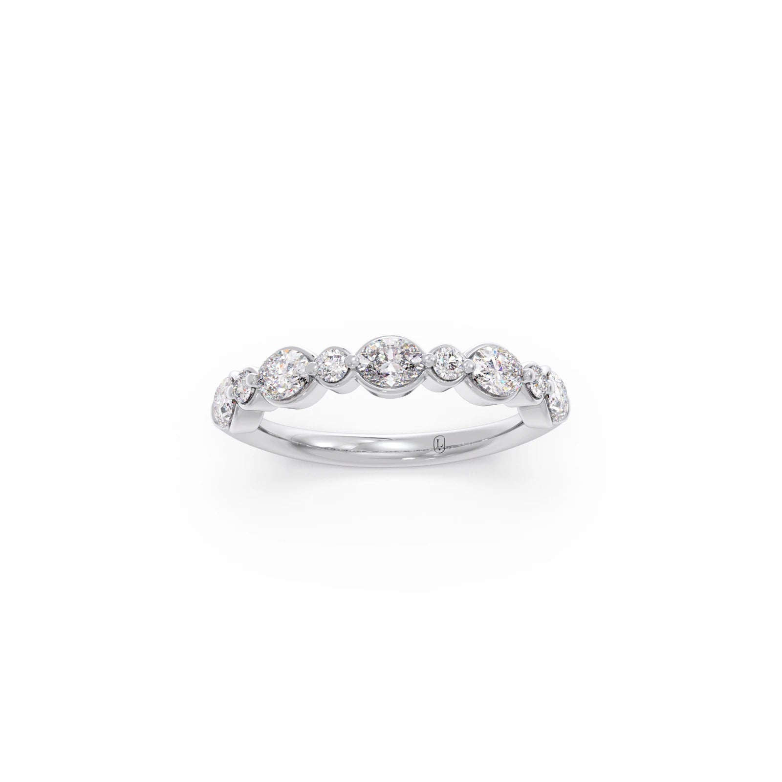 This elegant band showcases a beautiful sequence of alternating round and oval-cut diamonds, set halfway around the ring. Symbolizing everlasting love, the unique combination of shapes creates a sophisticated and sparkling design.