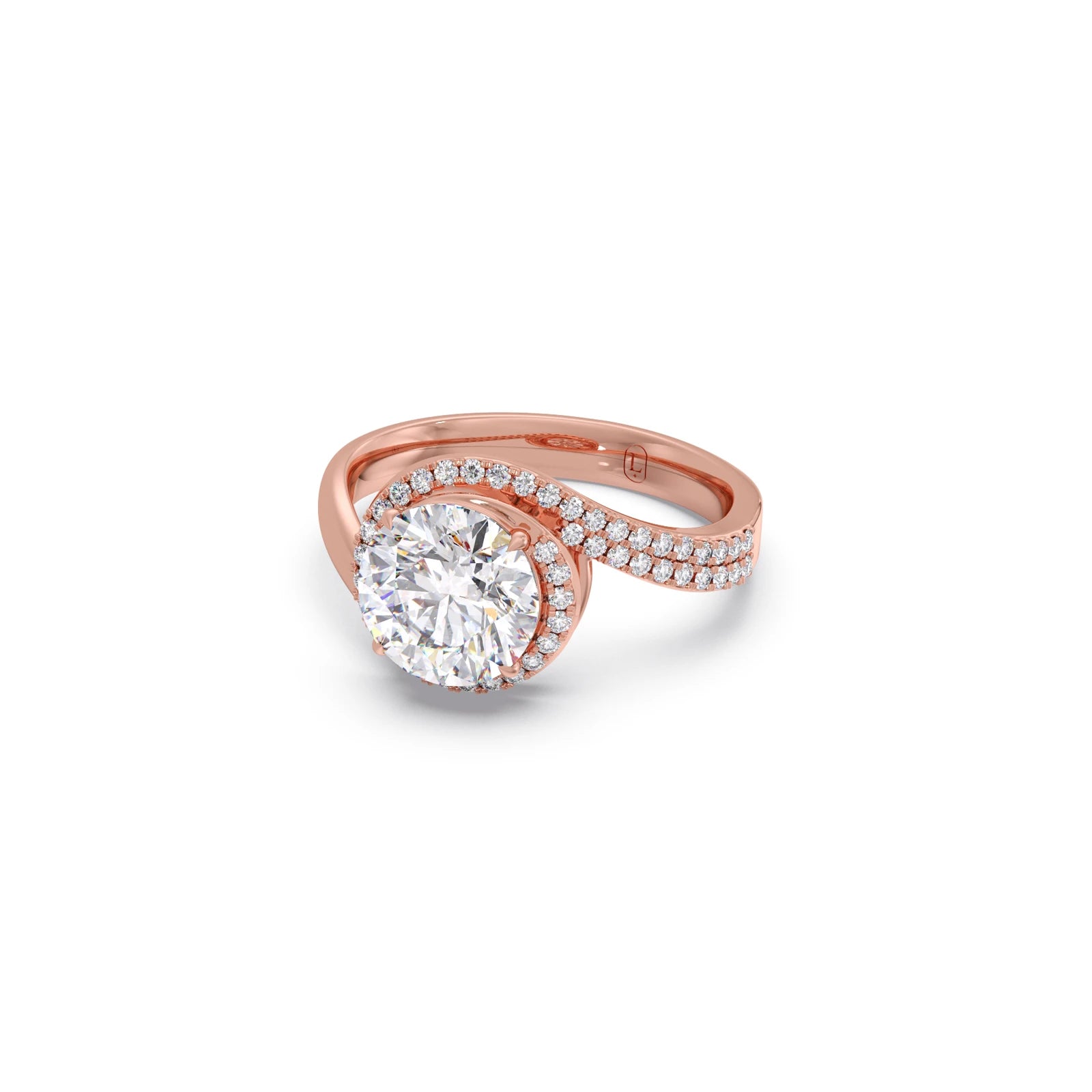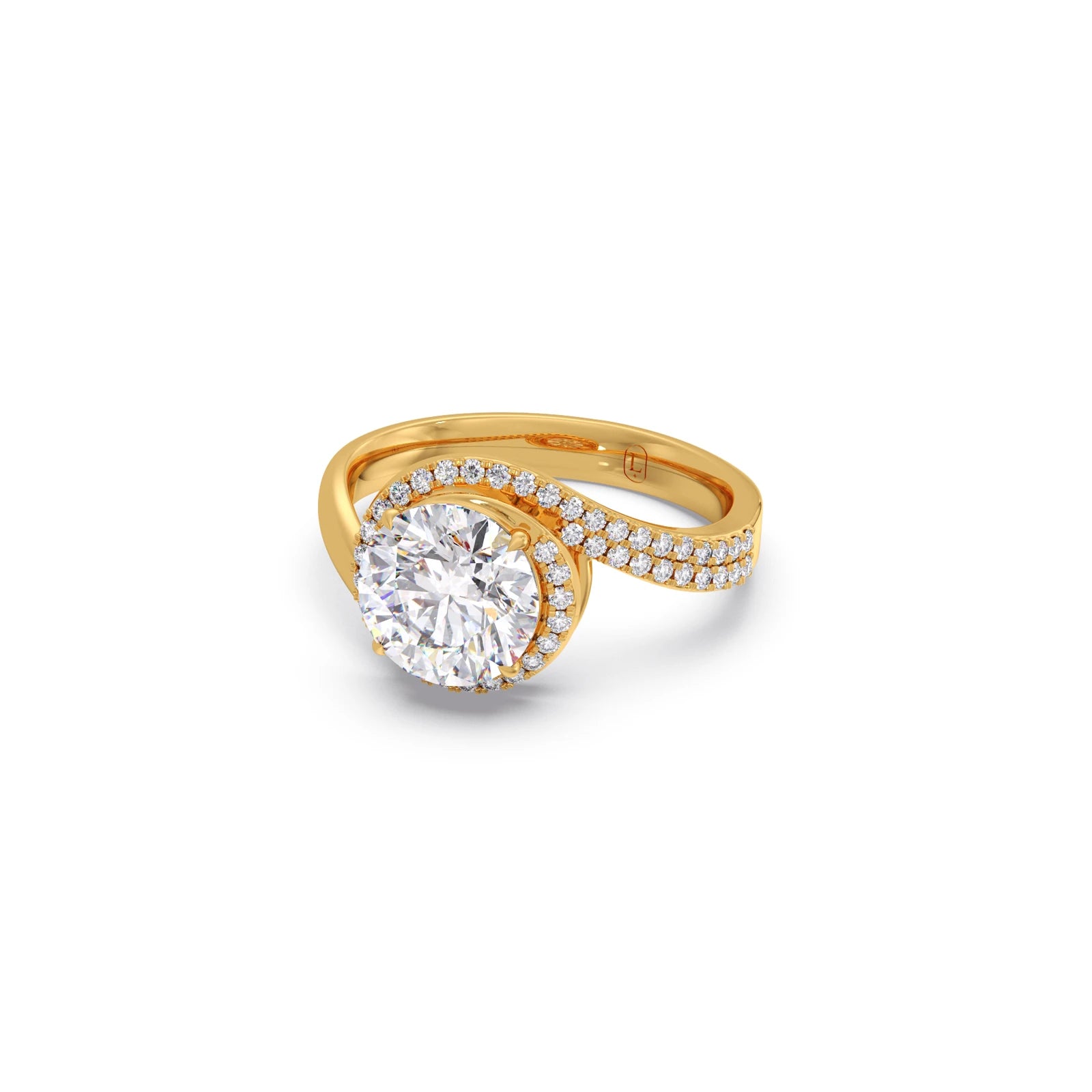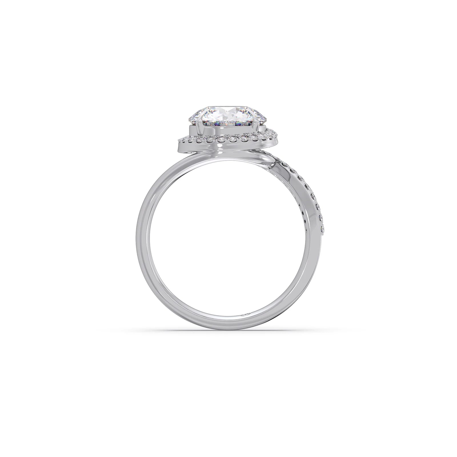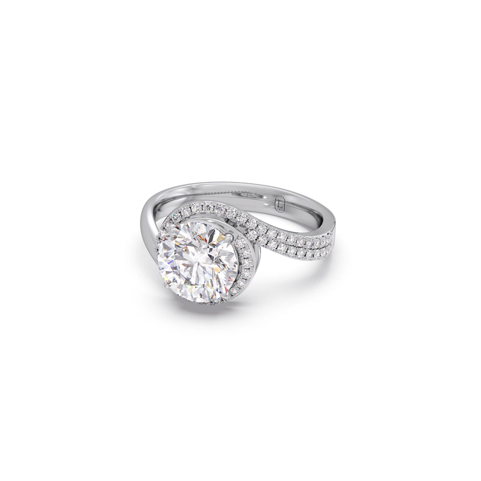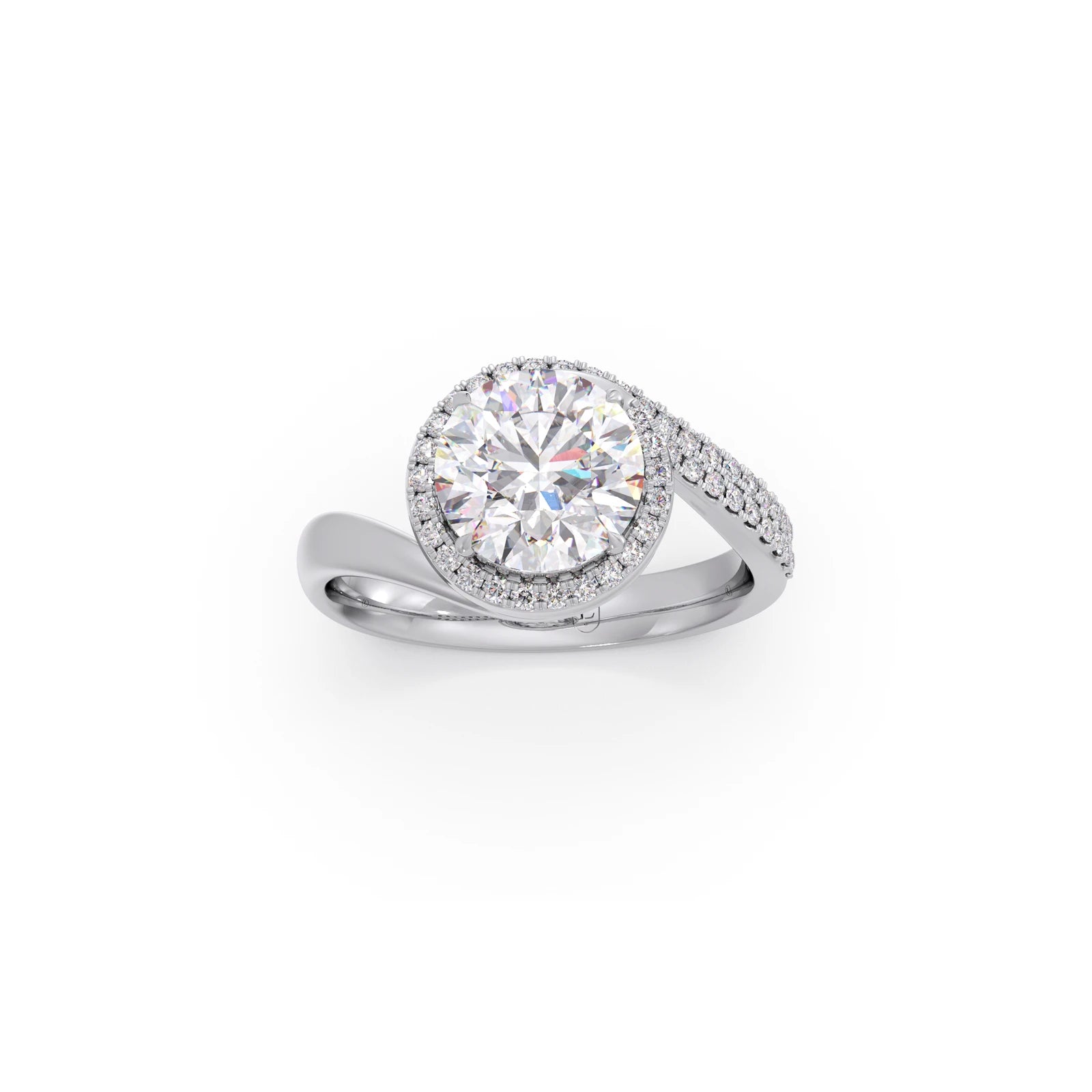 This exquisite engagement ring features a dazzling round-cut center stone embraced by a delicate halo of pavé diamonds. The elegant twist design of the band, also adorned with pavé diamonds, adds a touch of modern sophistication and timeless sparkle. A truly captivating symbol of your enduring love.