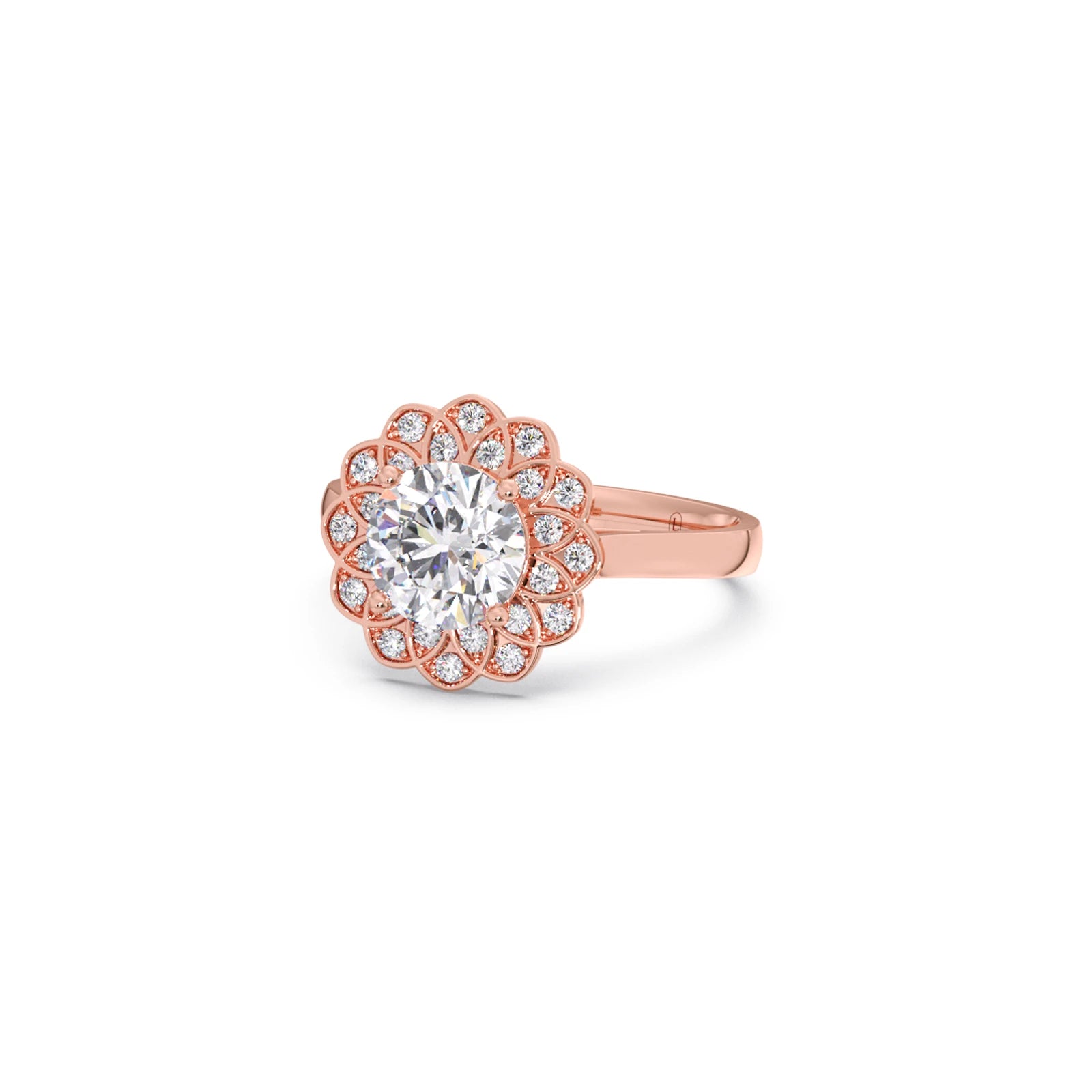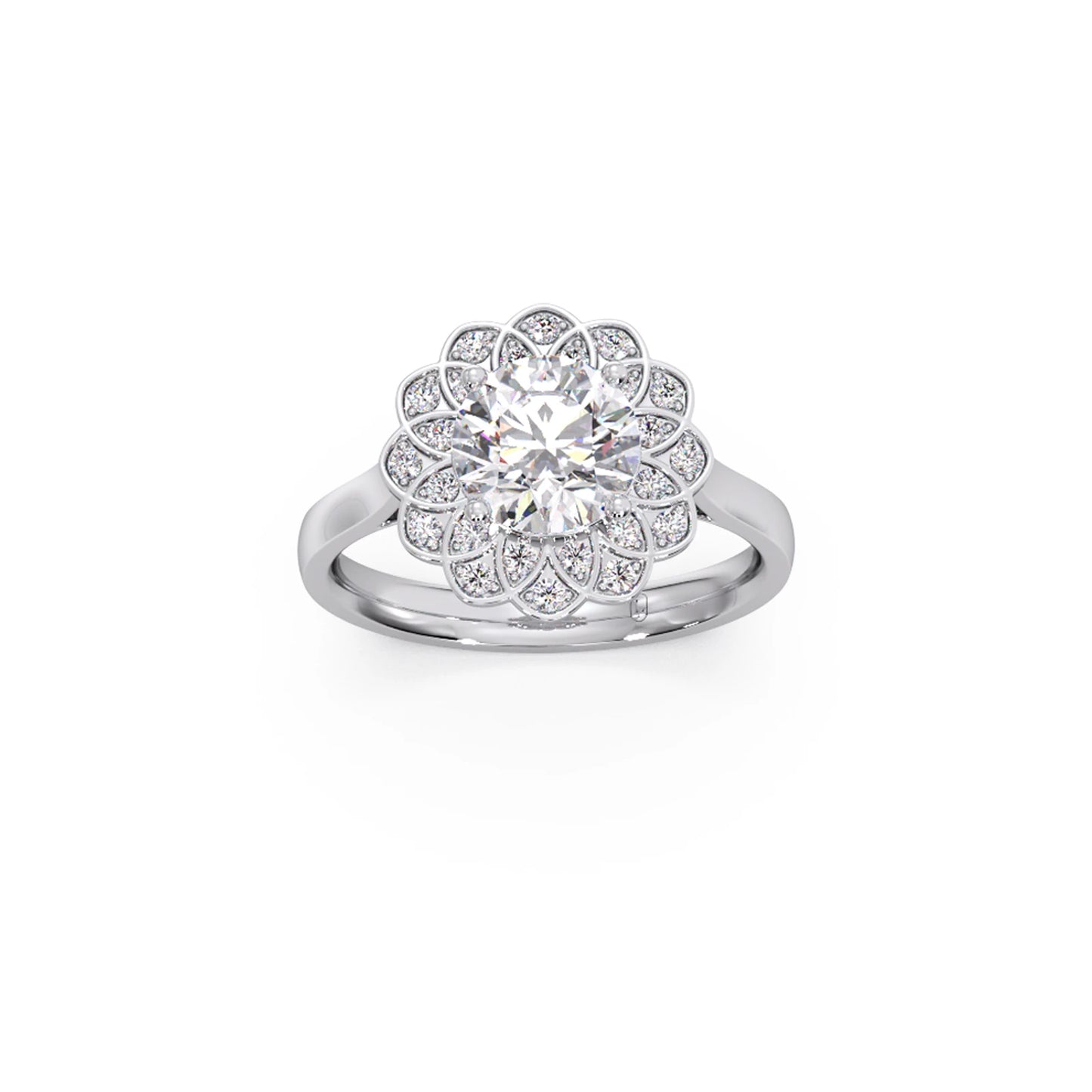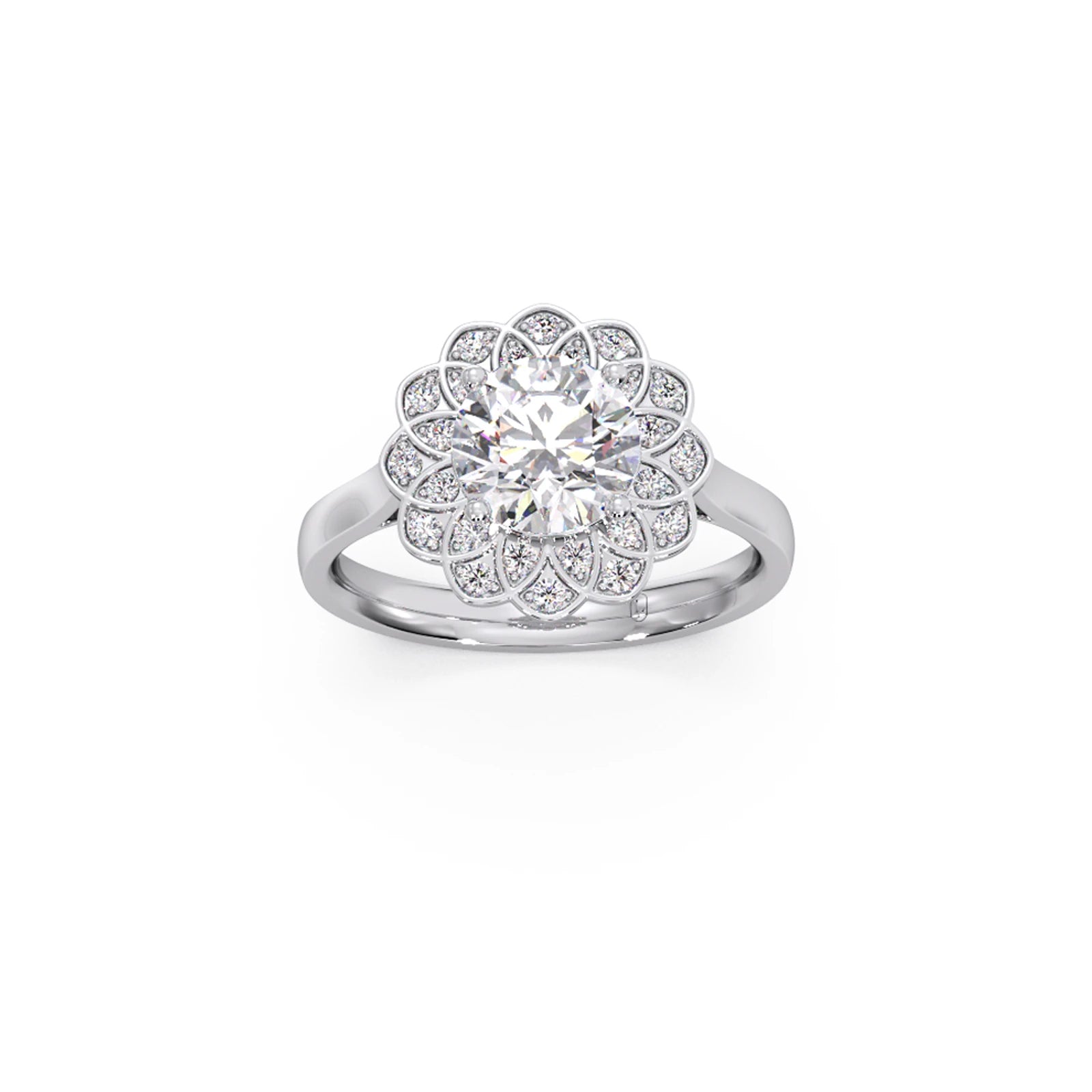 Celebrate your love story with this stunning round diamond engagement ring. Featuring a brilliant round center stone, it's encircled by a breathtaking floral halo, adding an ethereal charm. The intricate petal design enhances the diamond's radiance, creating a captivating sparkle. A symbol of enduring commitment and natural elegance.