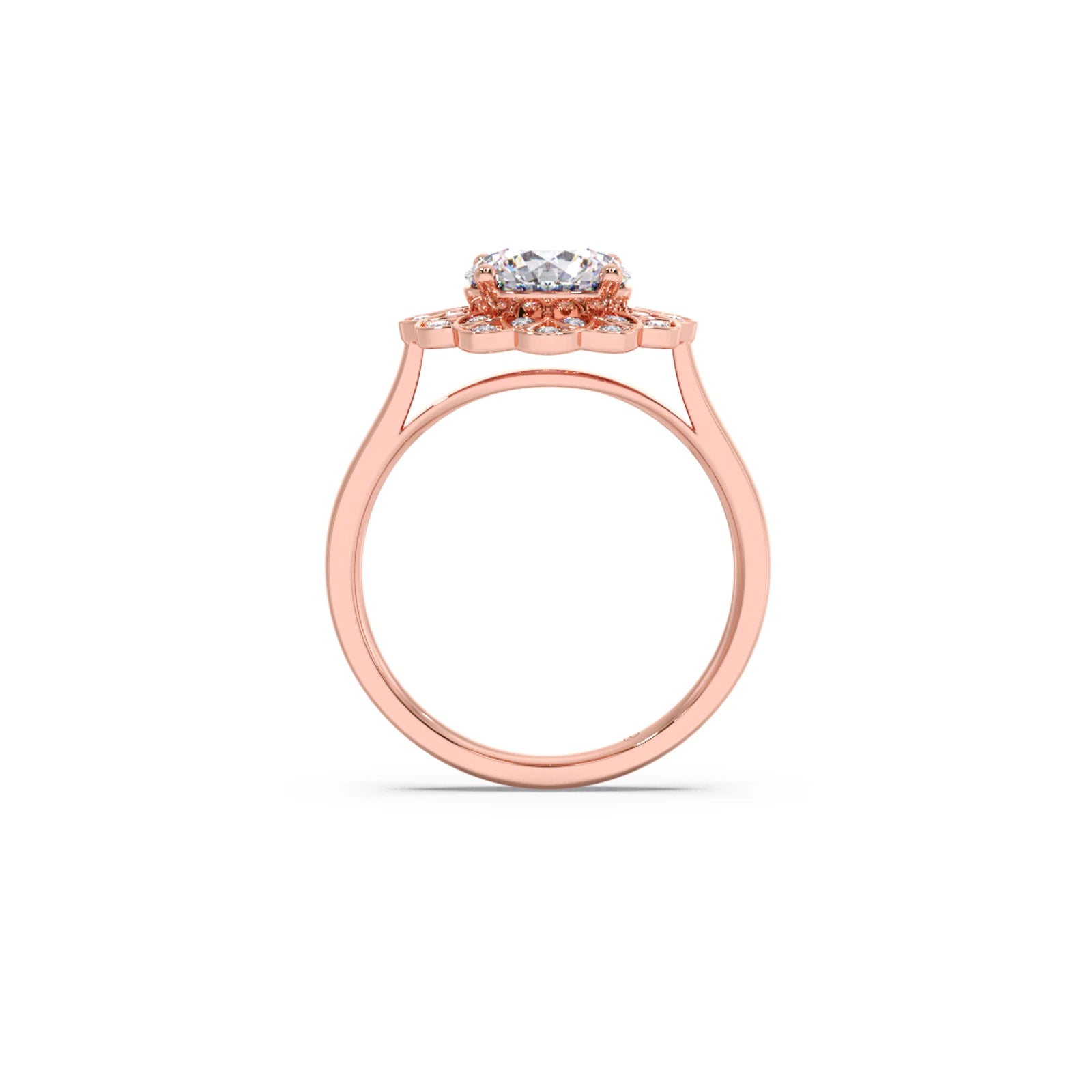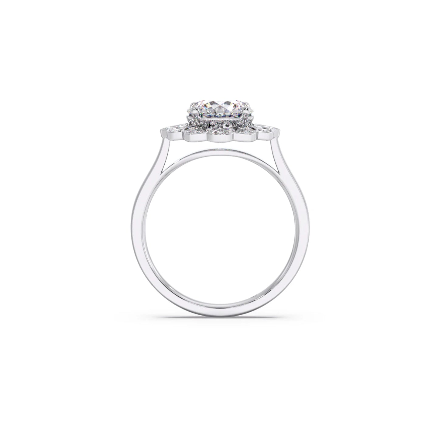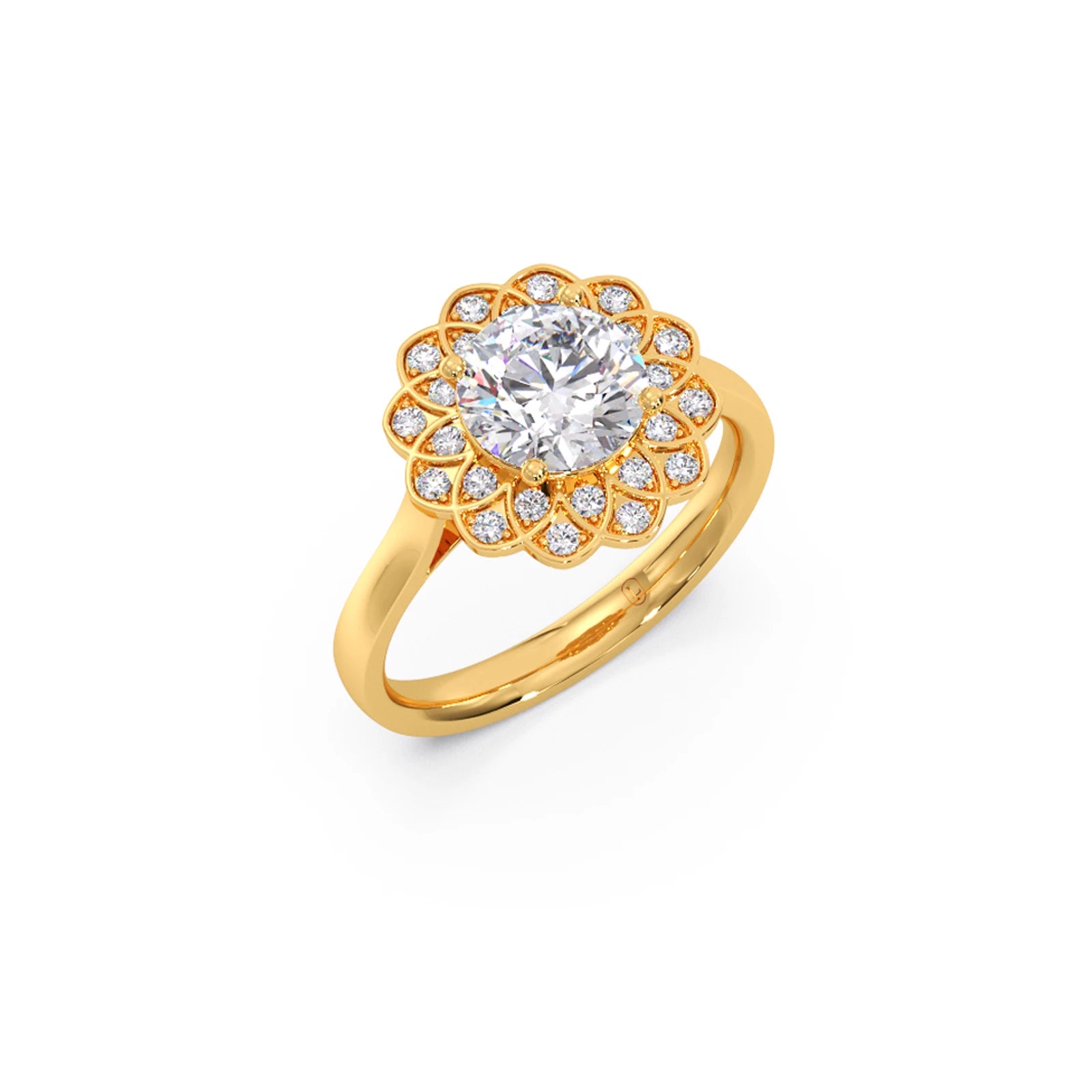 Celebrate your love story with this stunning round diamond engagement ring. Featuring a brilliant round center stone, it's encircled by a breathtaking floral halo, adding an ethereal charm. The intricate petal design enhances the diamond's radiance, creating a captivating sparkle. A symbol of enduring commitment and natural elegance.