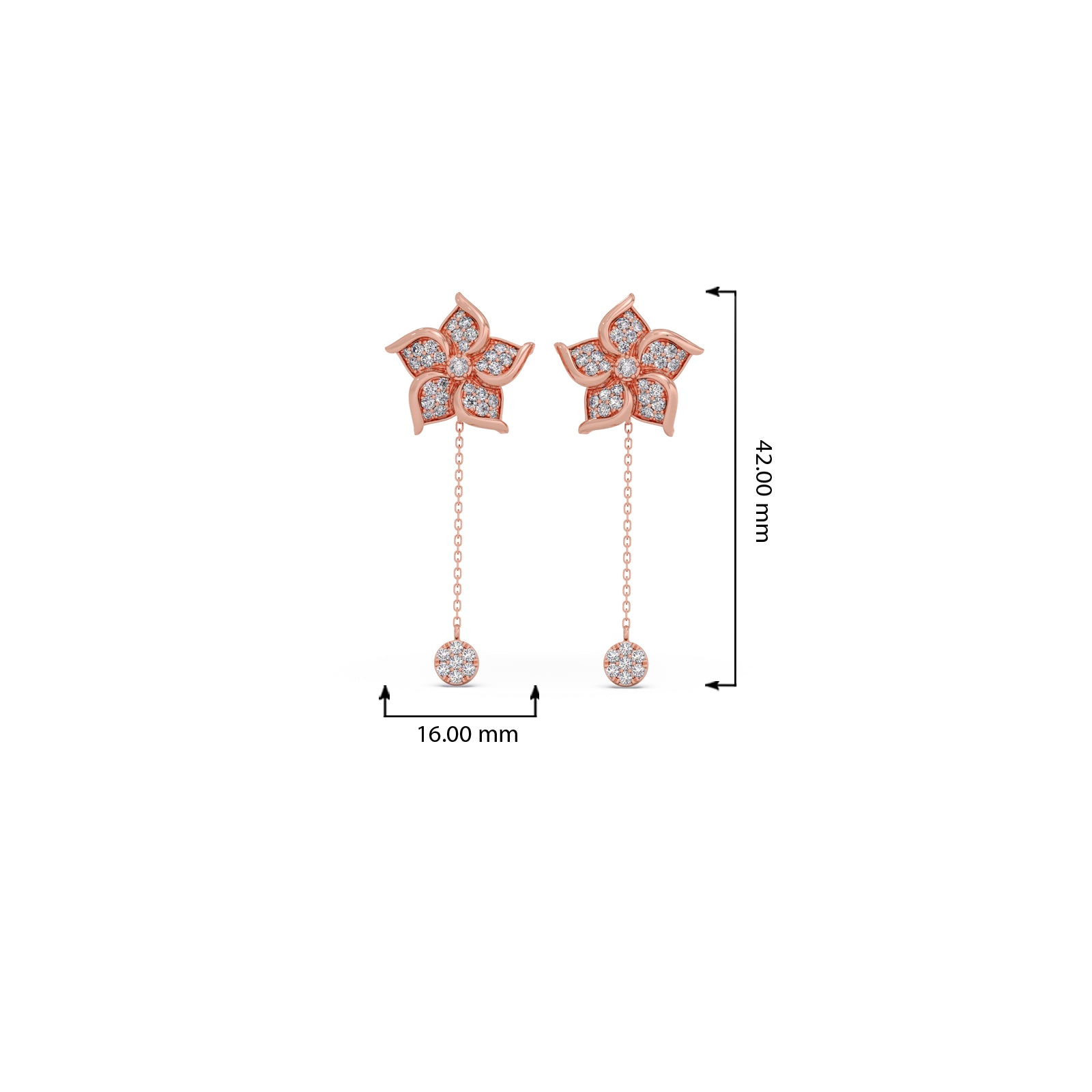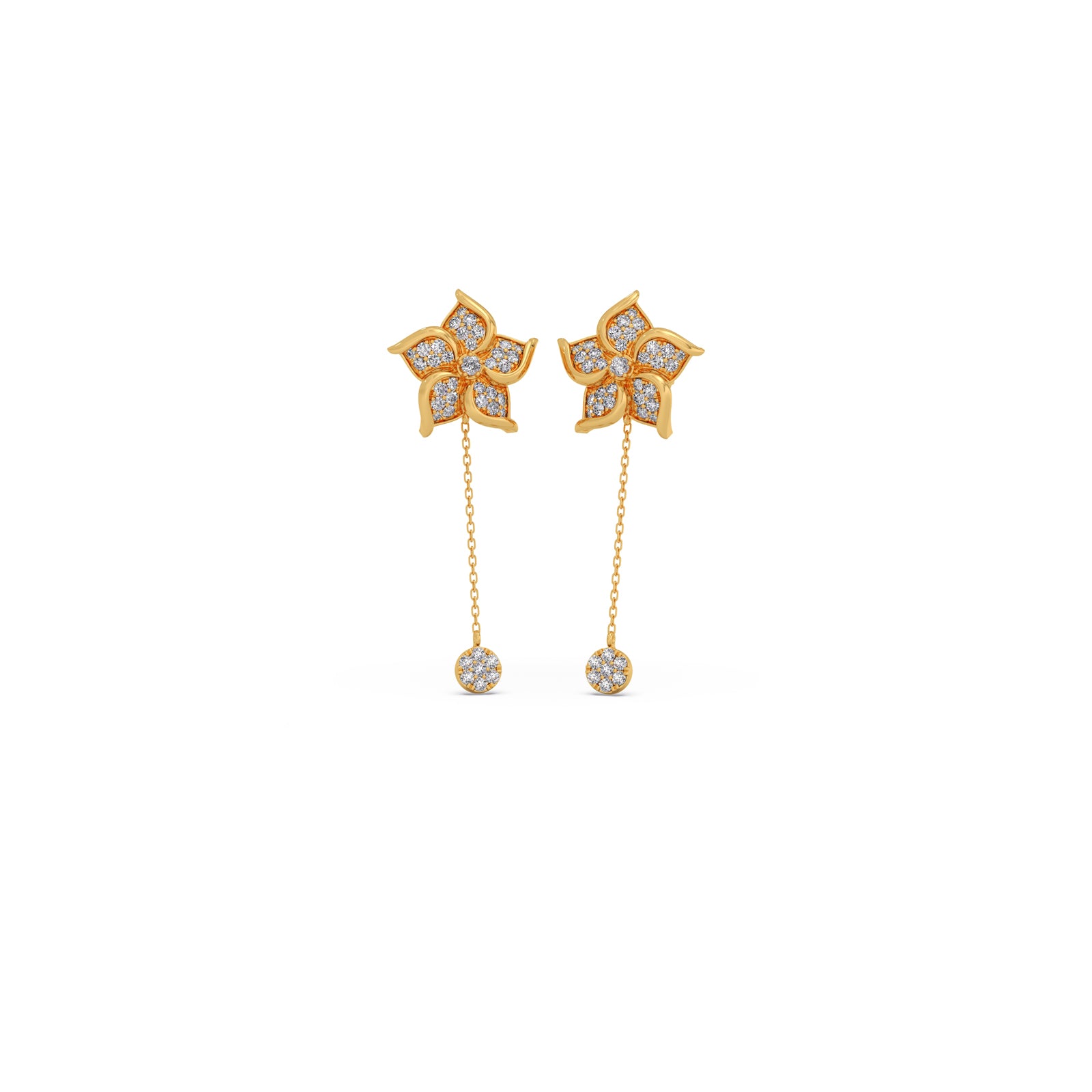 These Round Diamond floral drop earrings feature a stunning star-shaped floral design at the top, accented with shimmering Round Diamonds. A delicate dangling element below adds graceful movement, making them a perfect blend of elegance and sparkle for any special occasion.