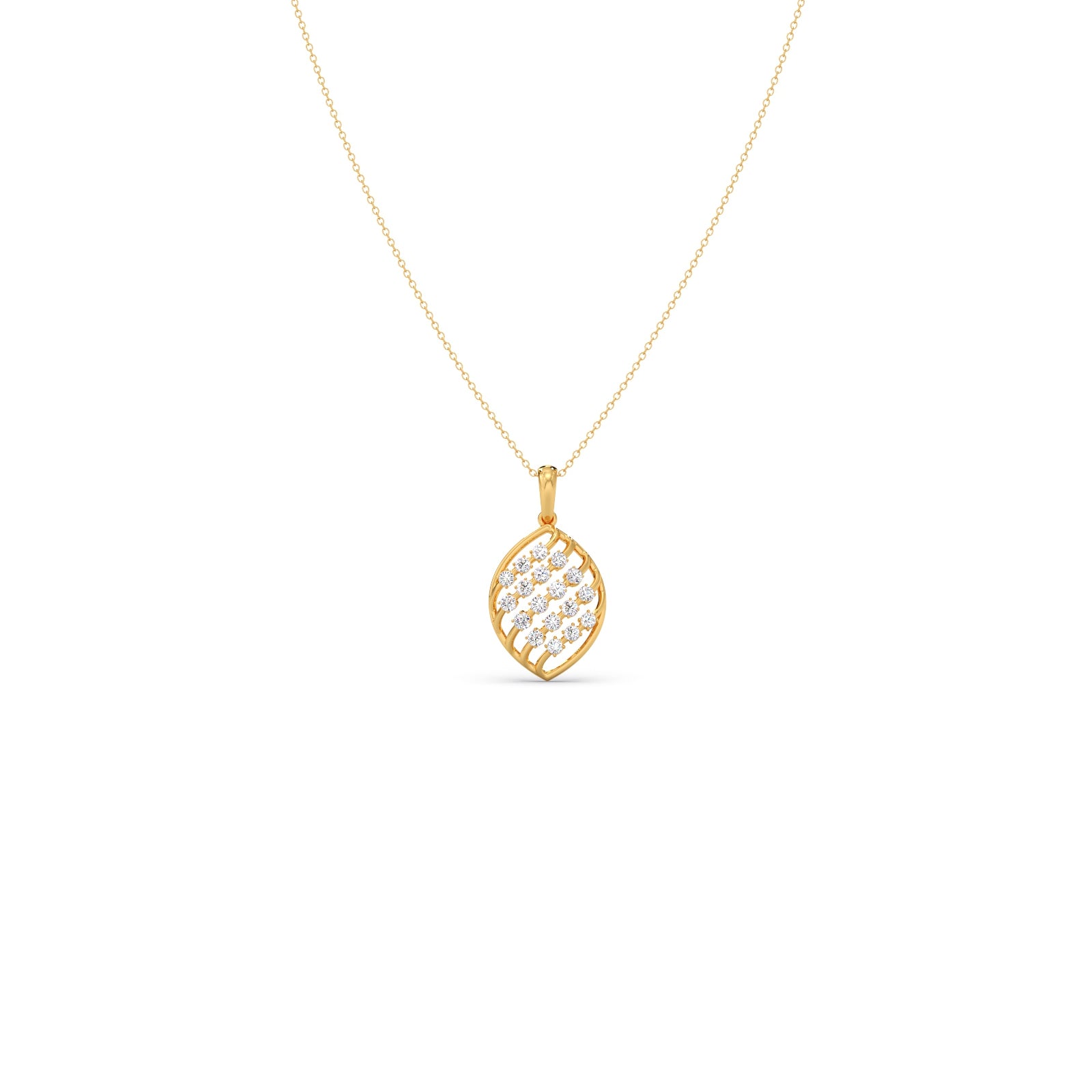 Inspired by nature's beauty, this exquisite pendant features a delicate leaf design crafted from polished yellow gold. A series of brilliant round-cut diamonds are expertly set within the intricate framework, creating a captivating sparkle. This elegant piece is the perfect symbol of natural grace and timeless style.