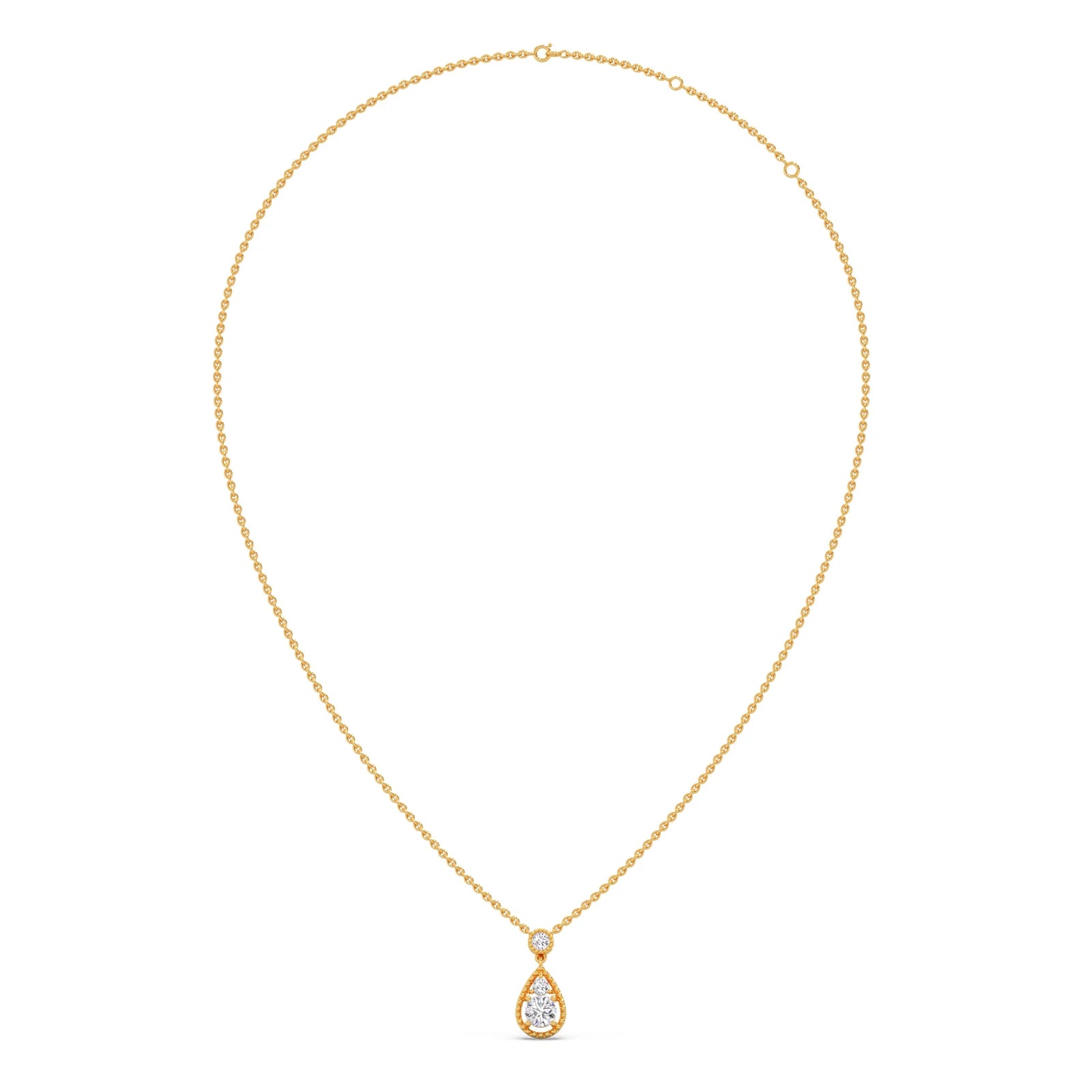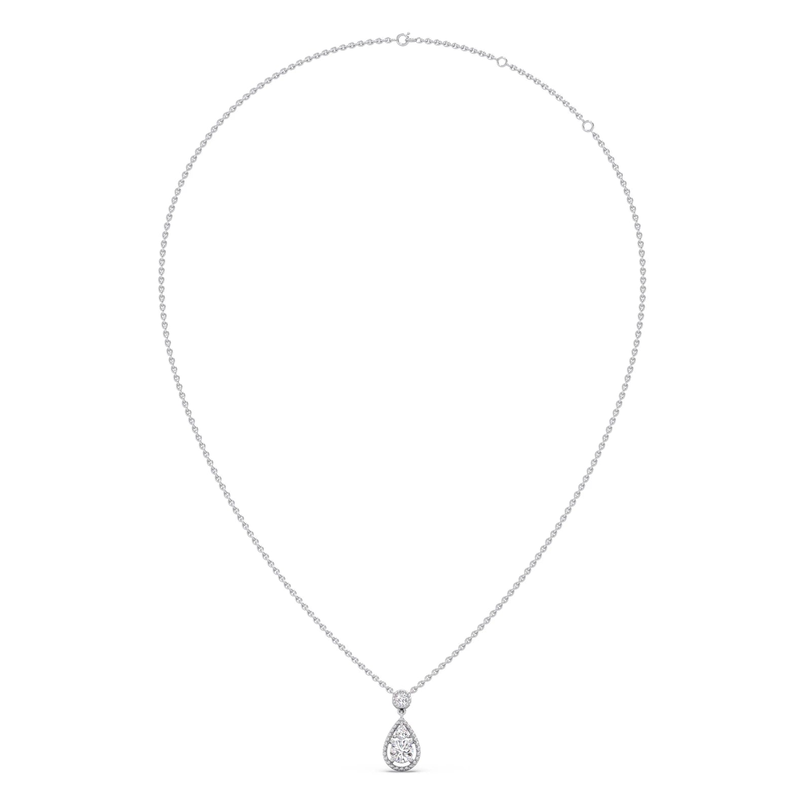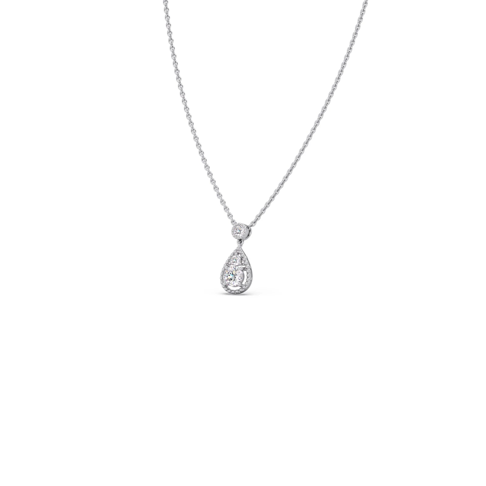This pendant features three round diamonds, arranged in a teardrop cascade design. The diamonds are graduated in size, creating a flowing, sparkling effect. The pendant offers a modern and elegant look, perfect for adding a touch of sophisticated sparkle to any outfit.