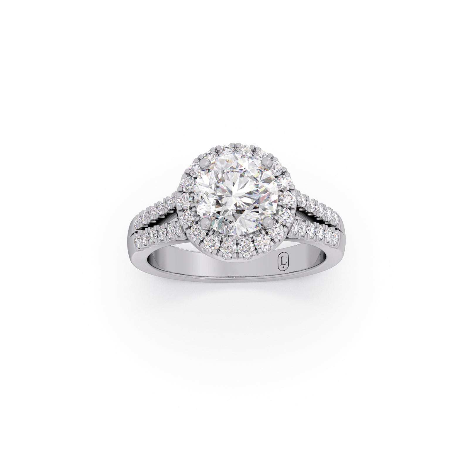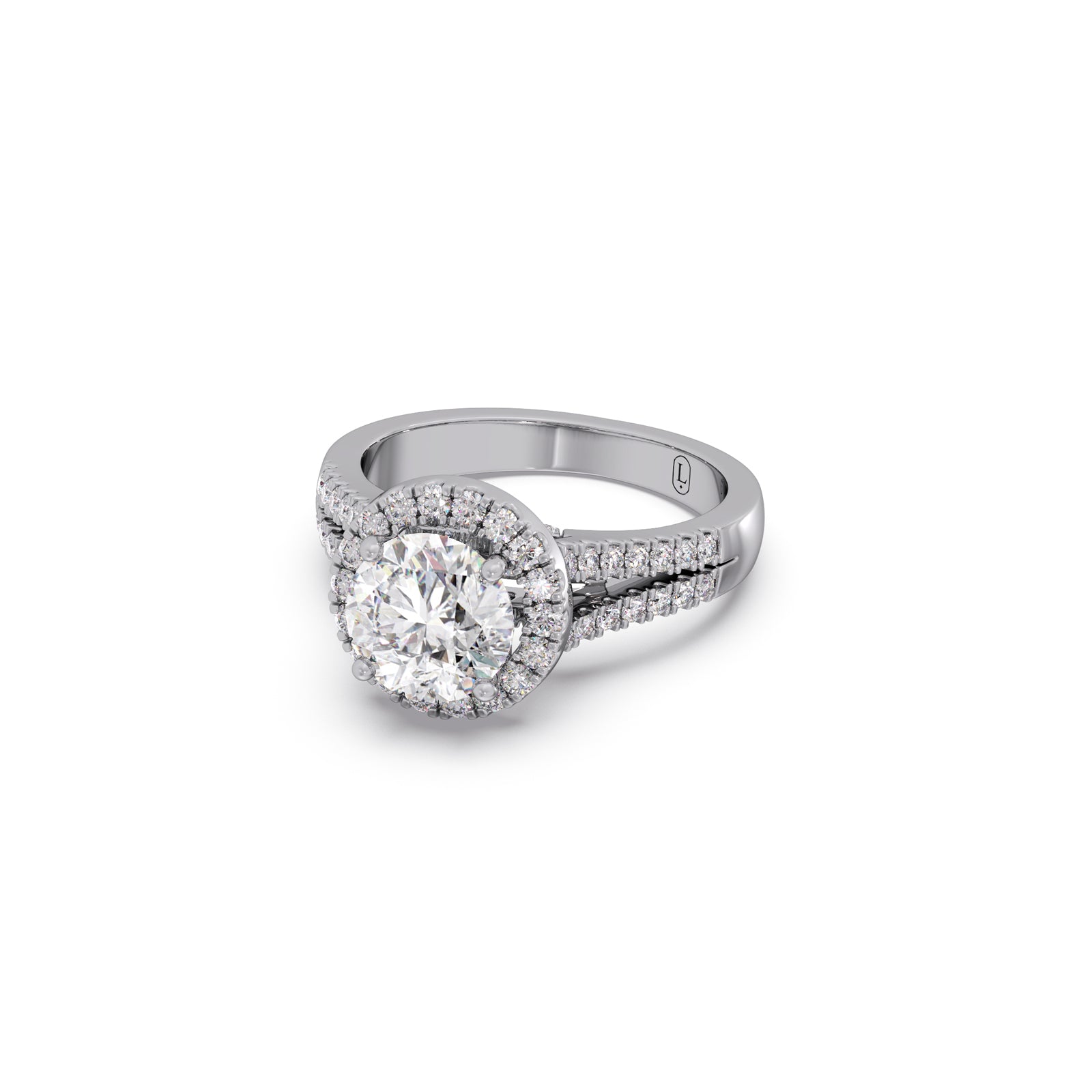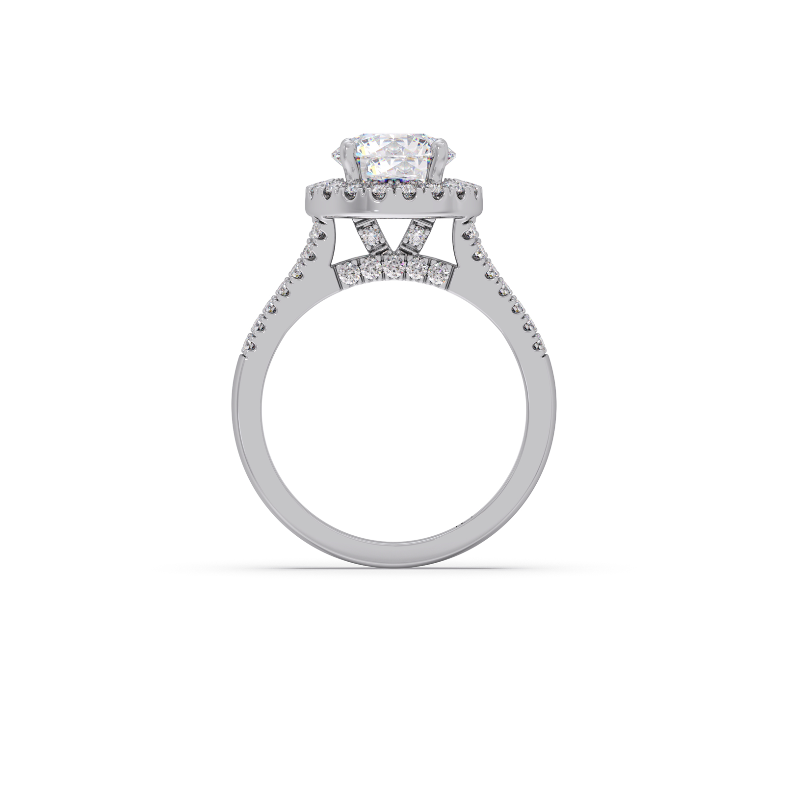 Featuring a magnificent central diamond surrounded by a brilliant halo, this ring offers a breathtaking sparkle. The split-shank band, adorned with additional pave-set diamonds, enhances the ring's overall brilliance and presence. This elegant and glamorous design is perfect for a truly unforgettable moment.