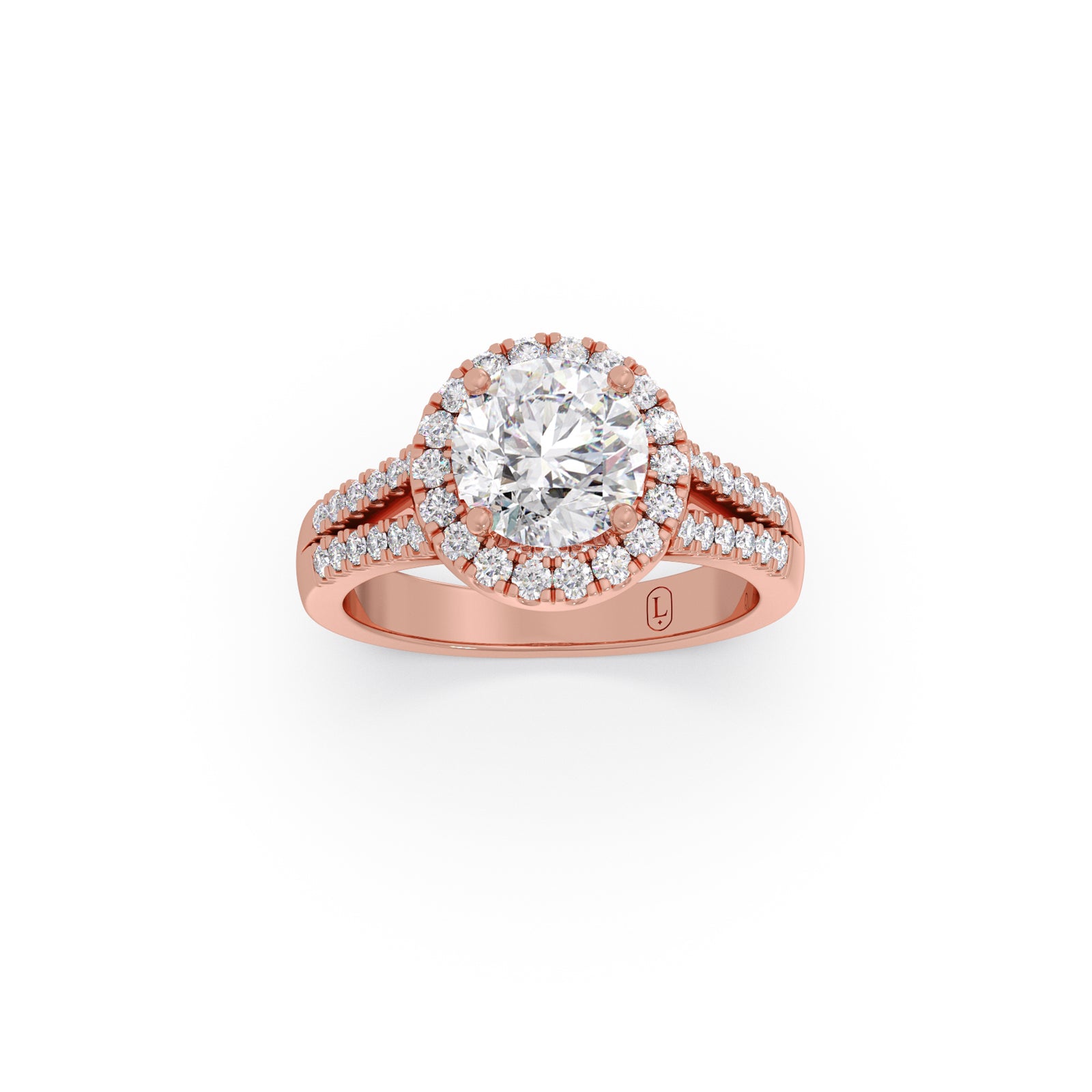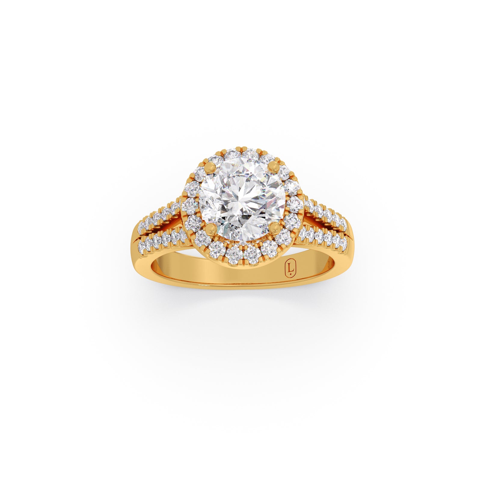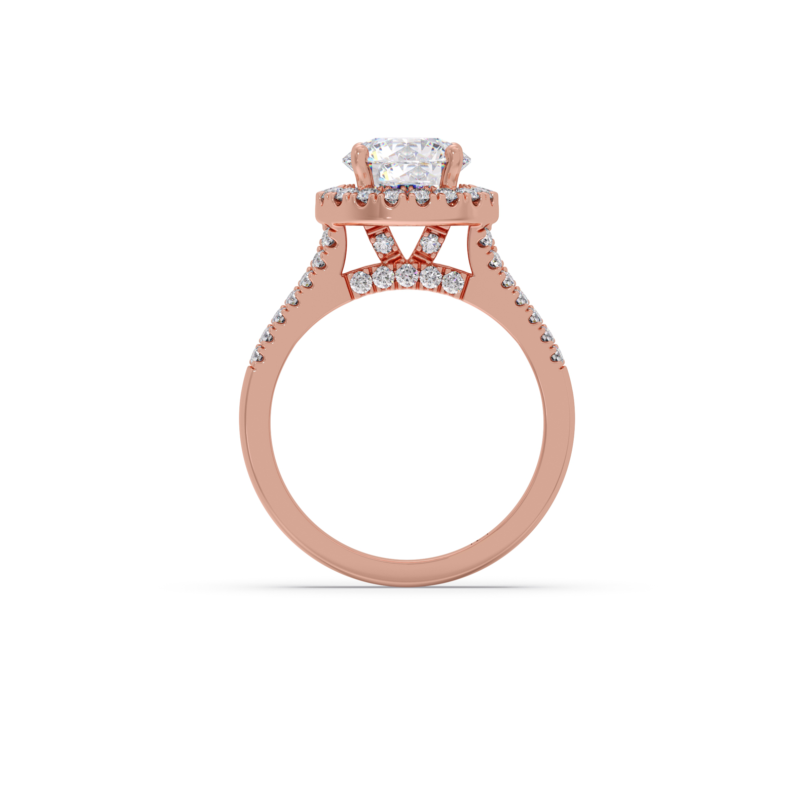 Featuring a magnificent central diamond surrounded by a brilliant halo, this ring offers a breathtaking sparkle. The split-shank band, adorned with additional pave-set diamonds, enhances the ring's overall brilliance and presence. This elegant and glamorous design is perfect for a truly unforgettable moment.