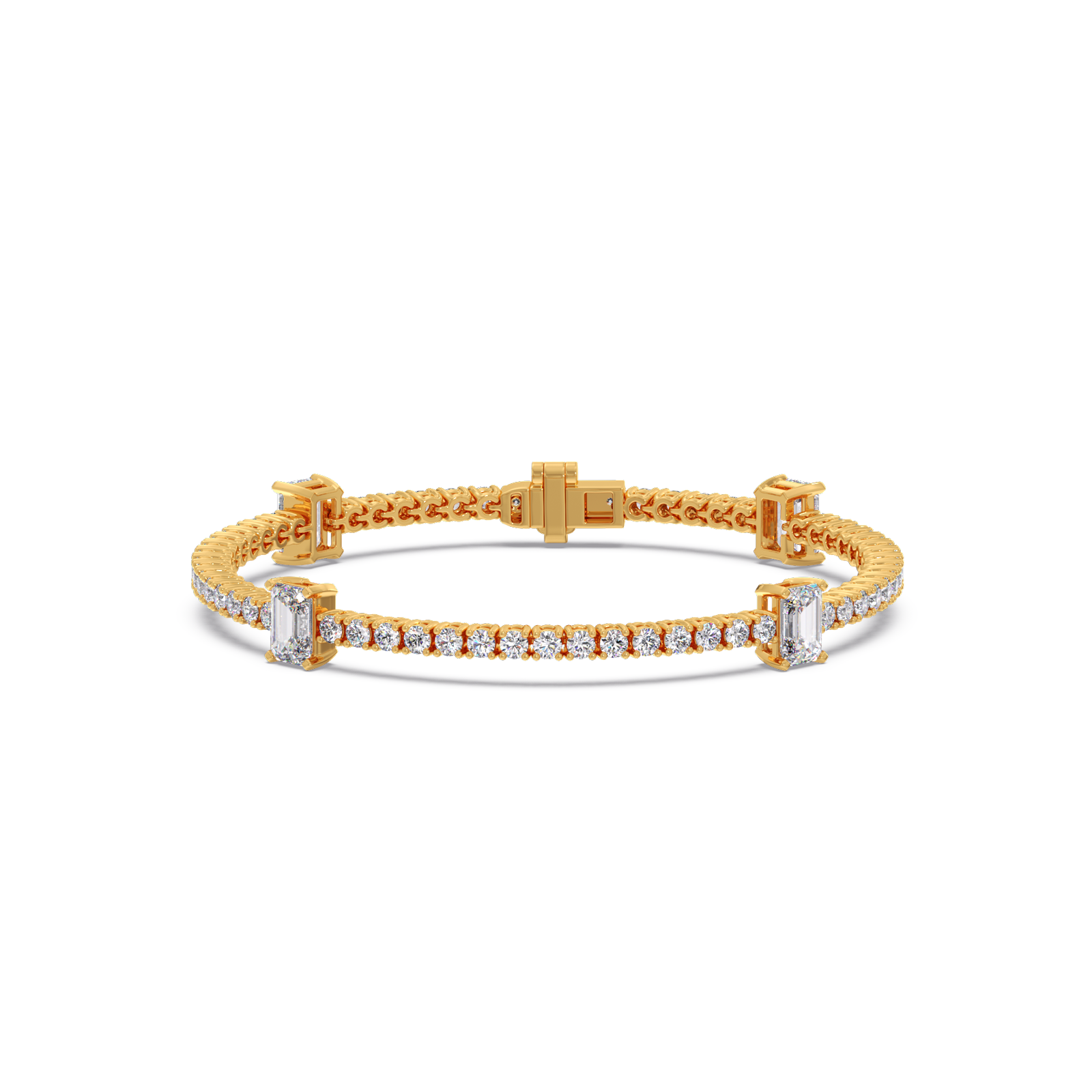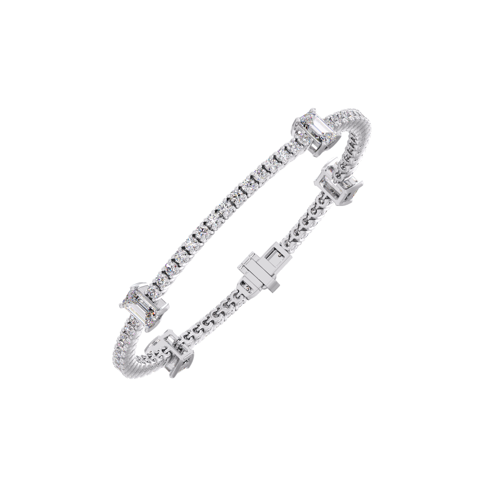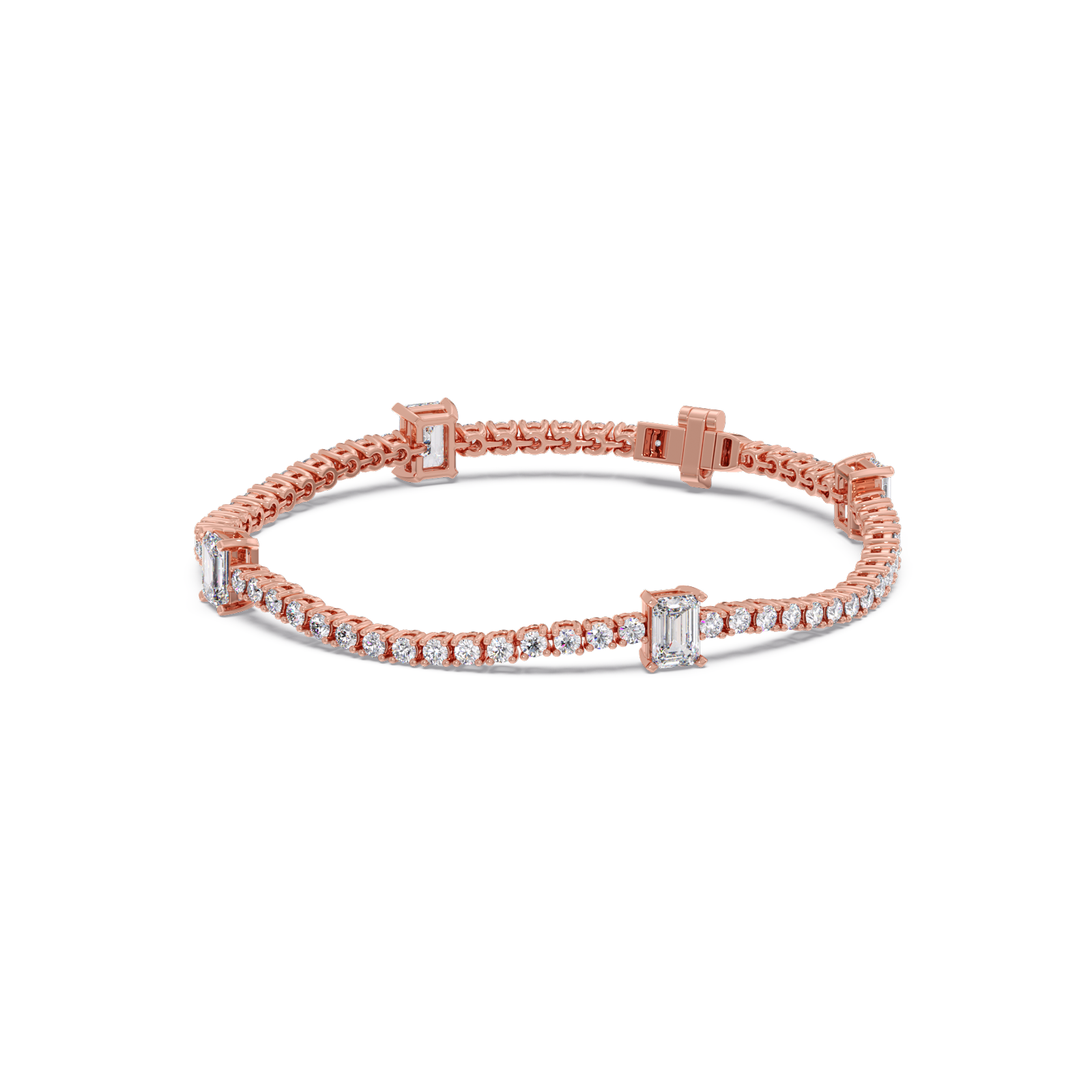 Unleash captivating sparkle with our Round Radiant Tennis Bracelet. This exquisite piece features a continuous line of perfectly matched Round Brilliant Diamonds, each meticulously set to maximize its dazzling brilliance. For a subtle touch of distinction, four radiant cut diamonds are seamlessly integrated, adding an extra layer of light and allure. Crafted for timeless elegance, it's a versatile luxury accessory that adds a touch of radiant sophistication to any wrist.