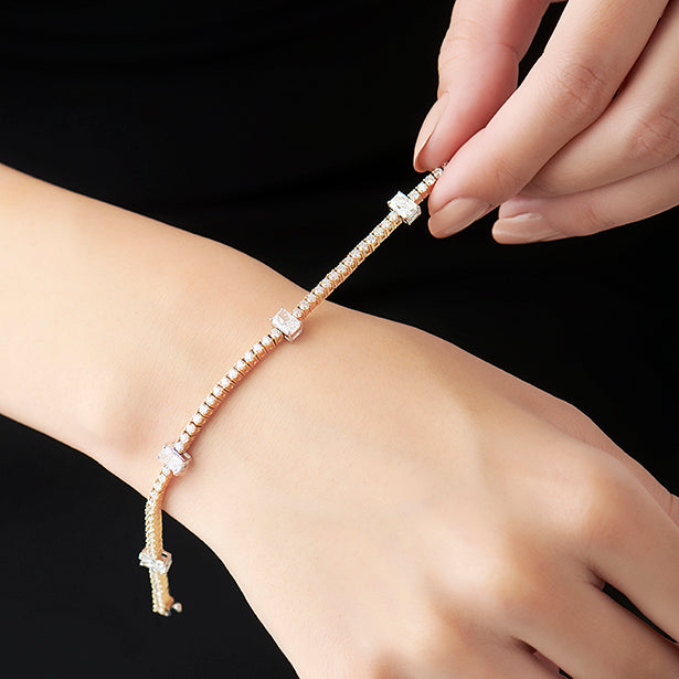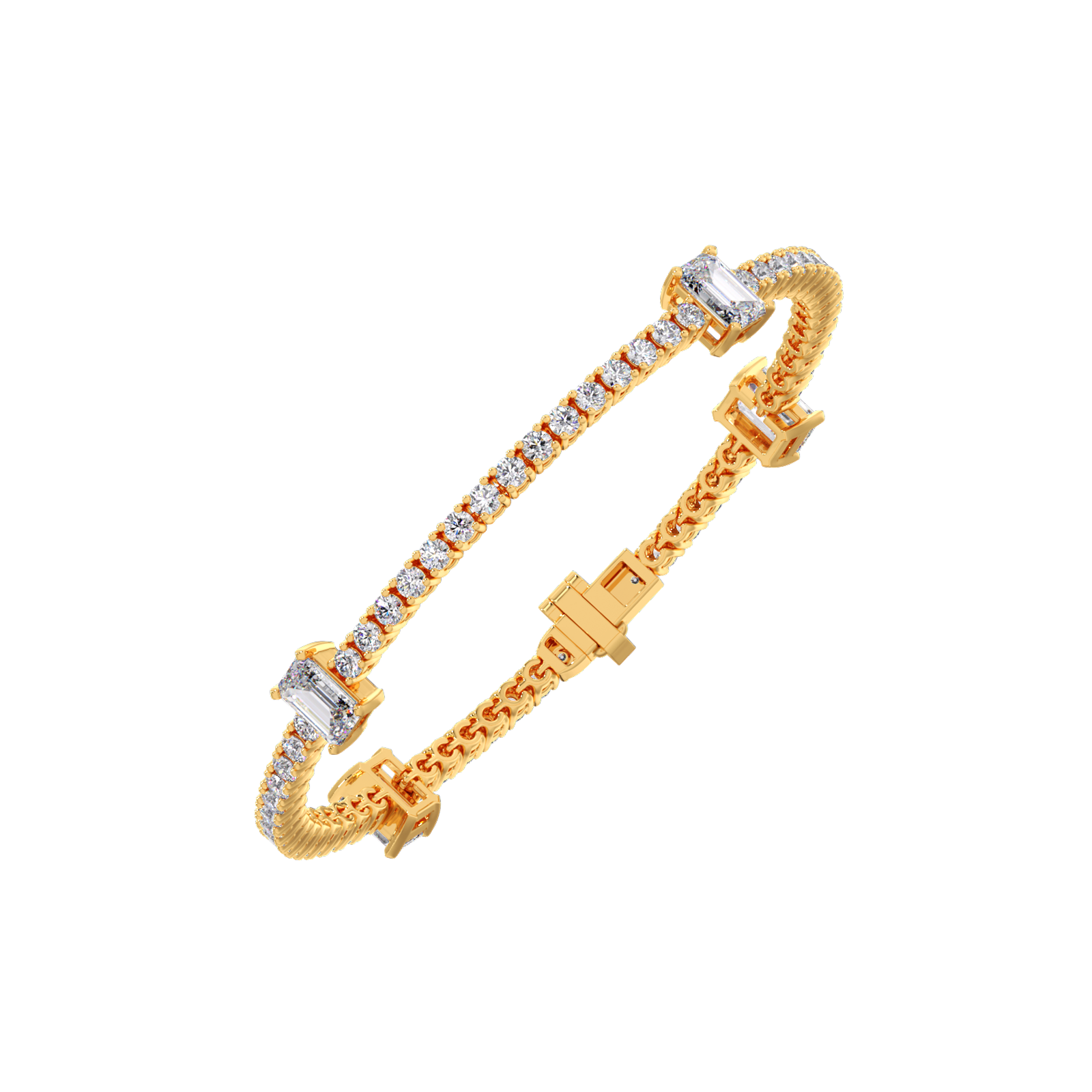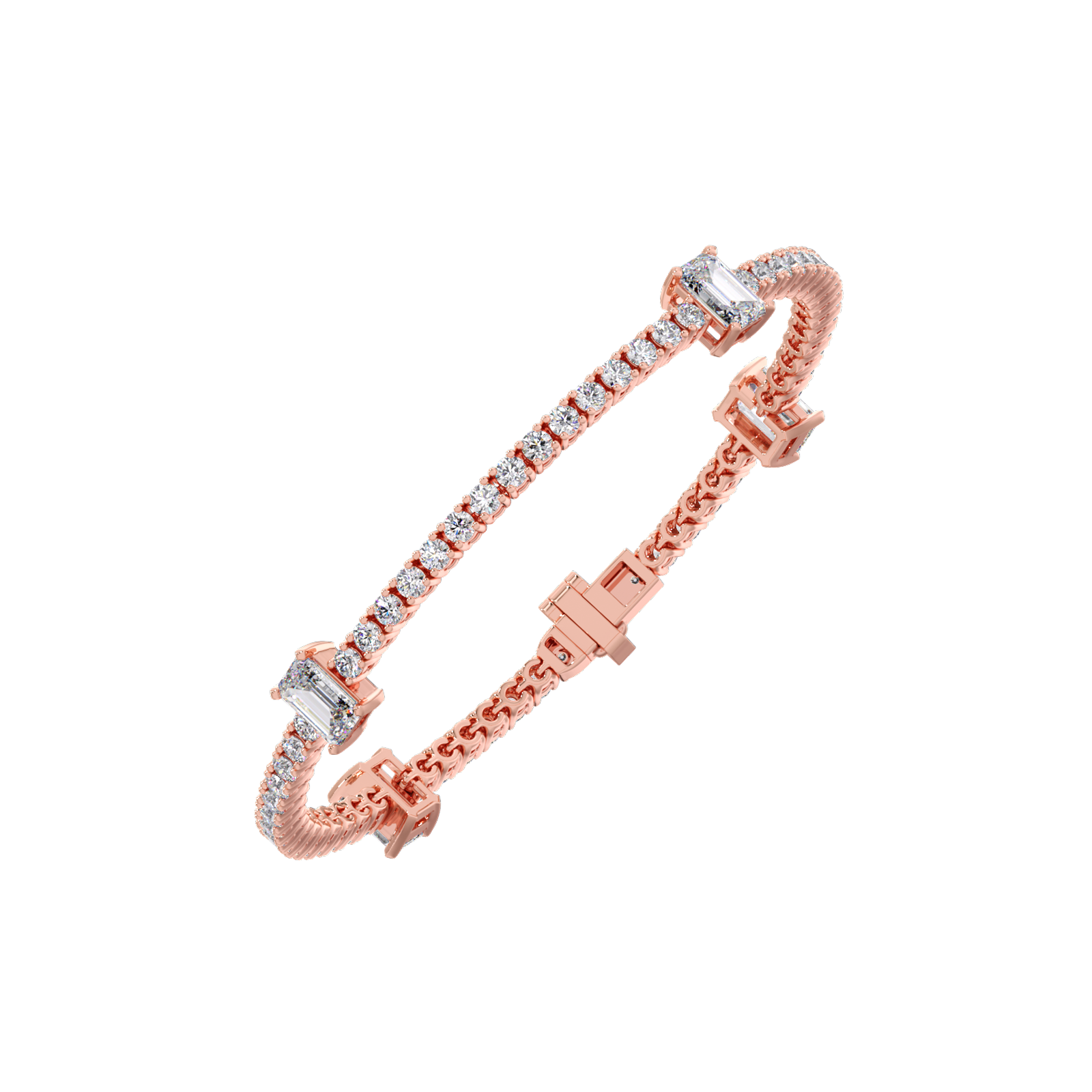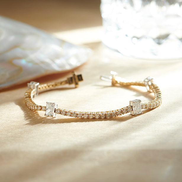 Unleash captivating sparkle with our Round Radiant Tennis Bracelet. This exquisite piece features a continuous line of perfectly matched Round Brilliant Diamonds, each meticulously set to maximize its dazzling brilliance. For a subtle touch of distinction, four radiant cut diamonds are seamlessly integrated, adding an extra layer of light and allure. Crafted for timeless elegance, it's a versatile luxury accessory that adds a touch of radiant sophistication to any wrist.